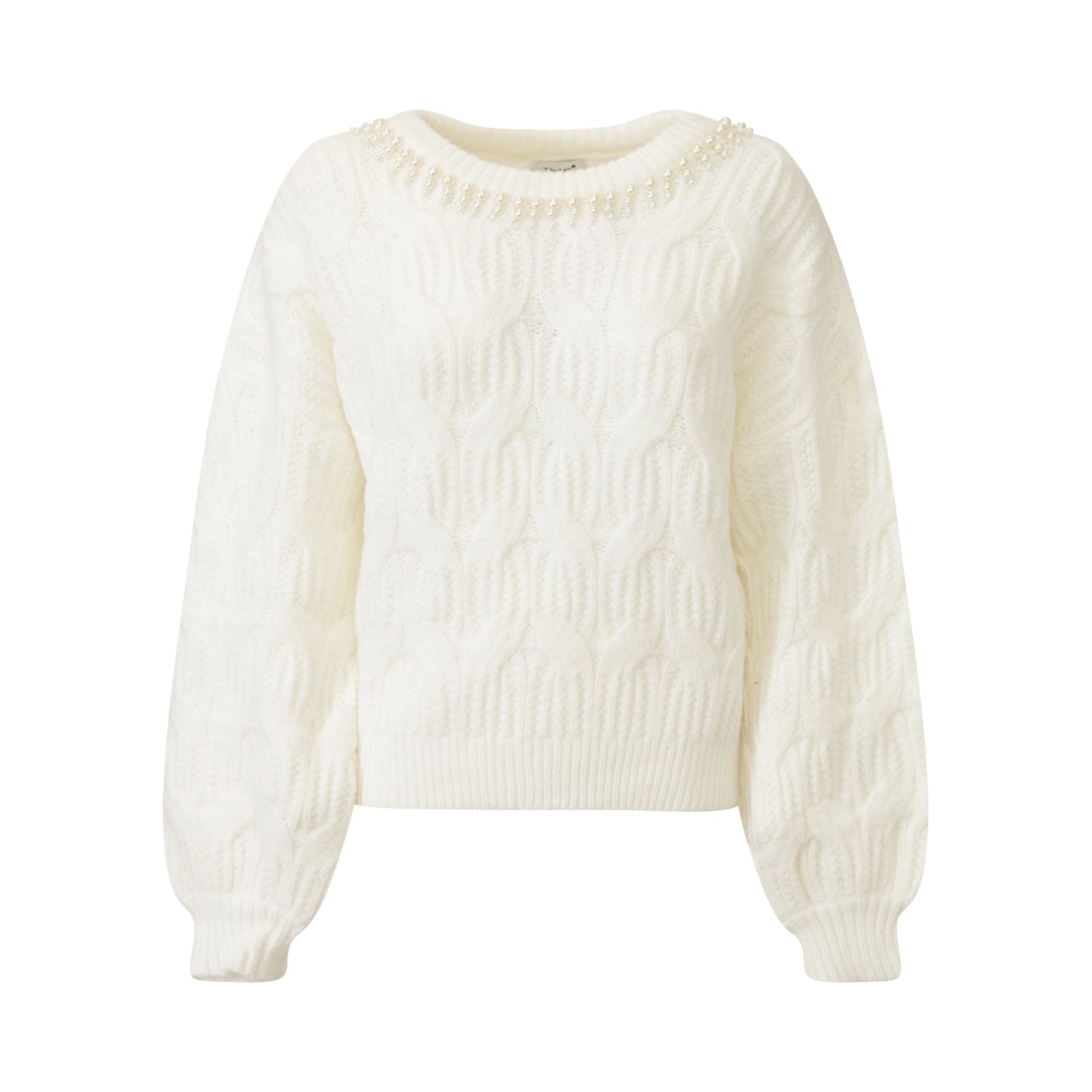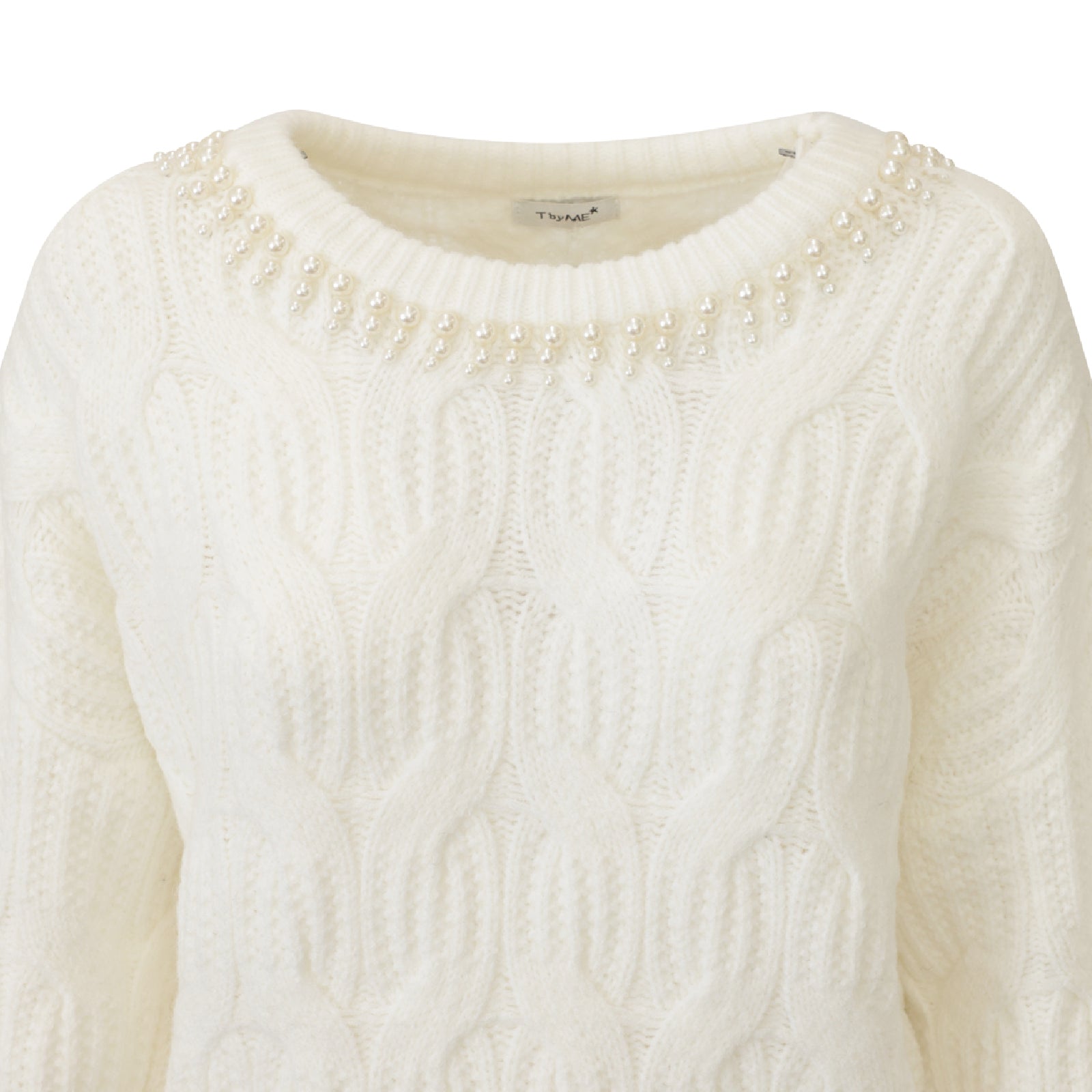 Maglia bianca di T by ME in misto lana con scollo tondo ampio, lavorazione a treccia, maniche over, perline sulla parte superiore.