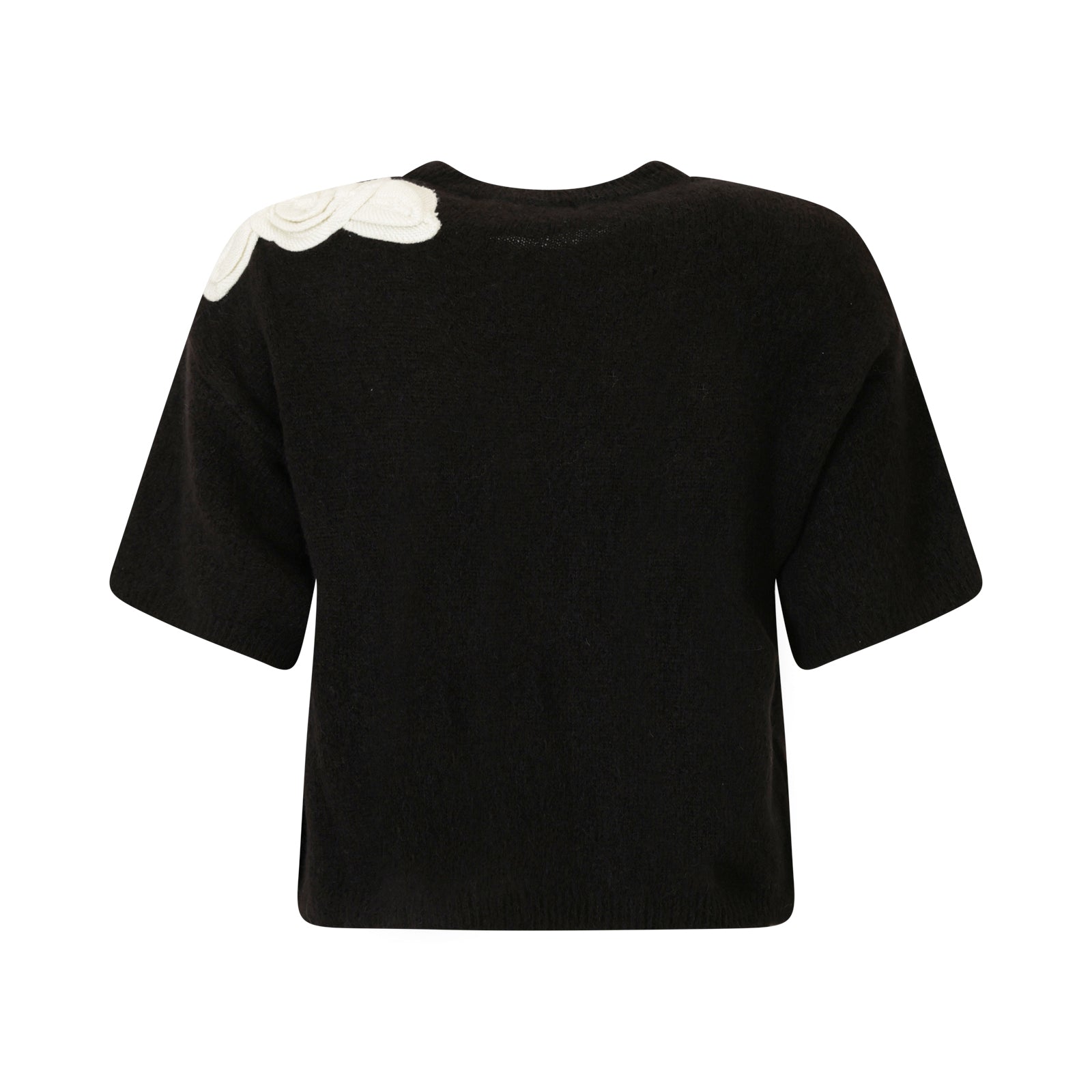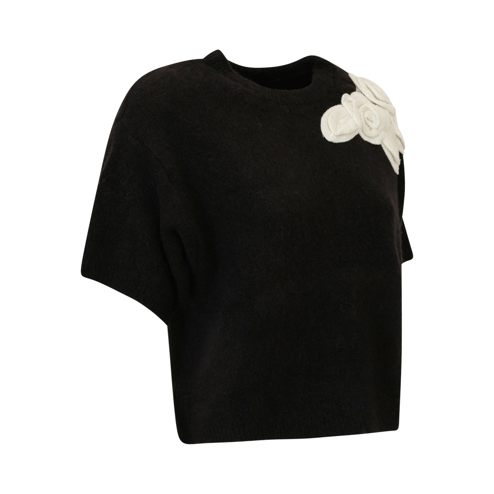 Maglia nera di ANOTHER LABEL in misto lana con scollo tondo, mezza manica, fiore in maglia bianco.