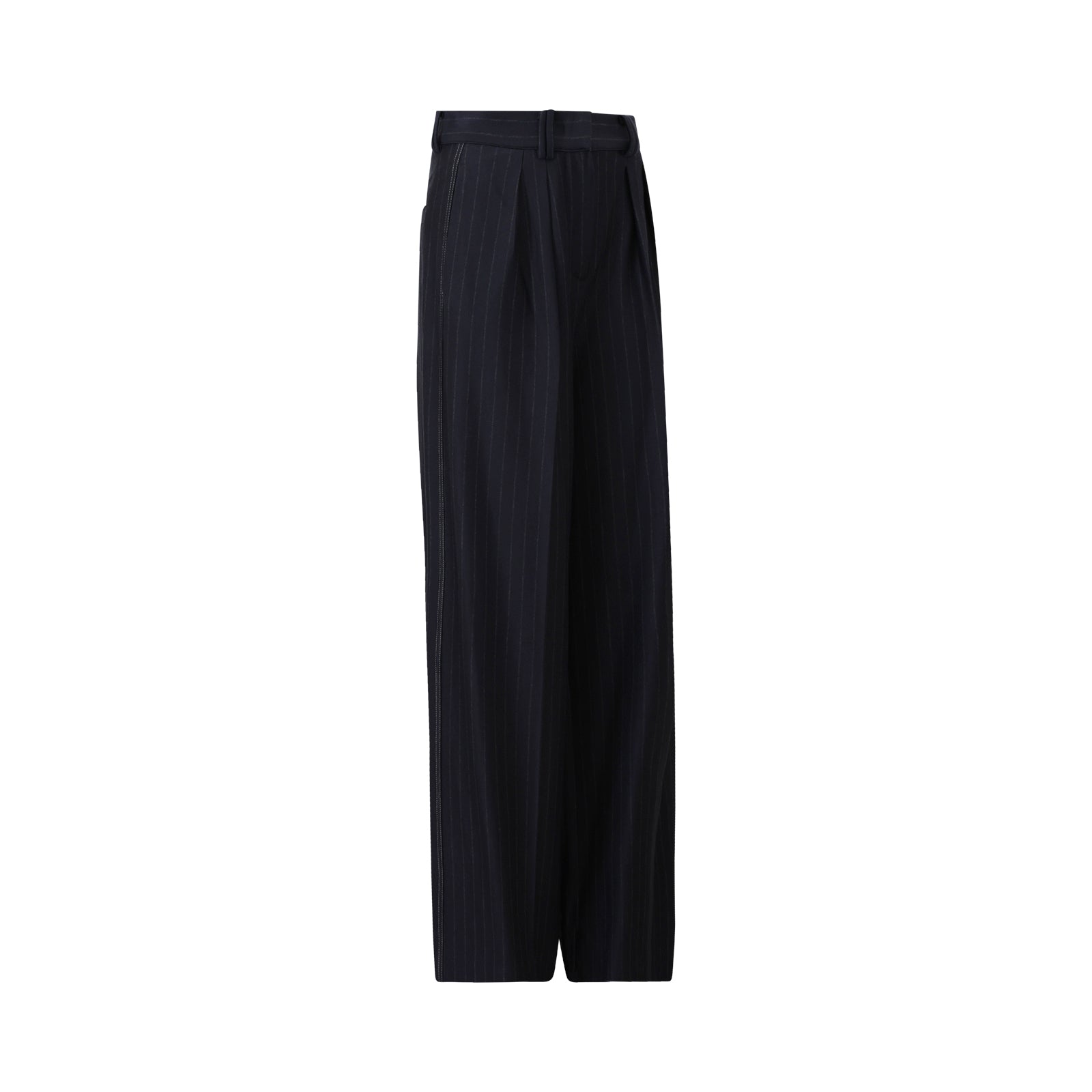 Pantalone GELA blu di MM MAX MARA in viscosa con effetto gessato, una pence, tasche a filetto, chiusura con zip e clip nascosta, gamba ampia.