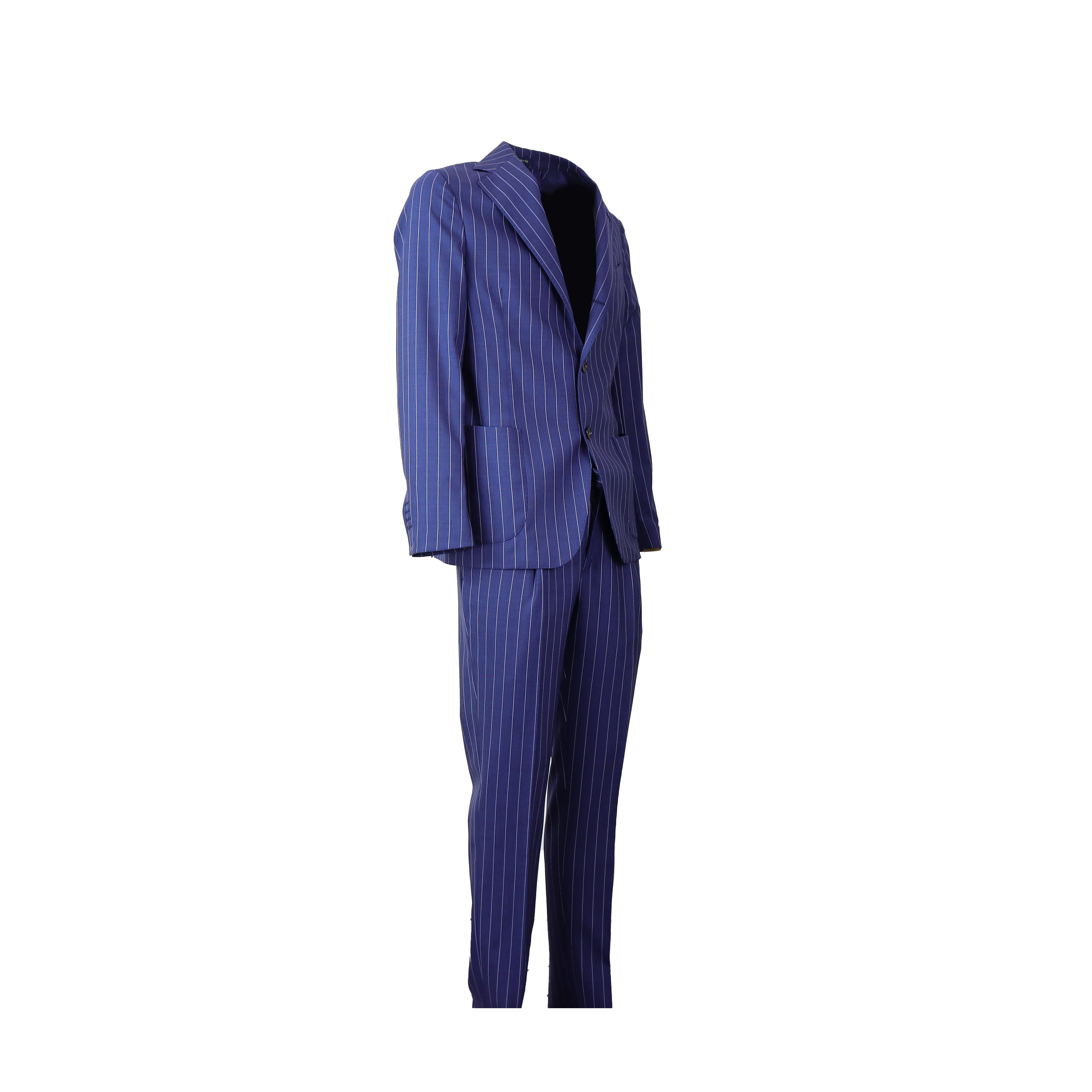 Abito gessato RIVA blu di GALA' X FEDELE in 100% lana vergine estiva VITALE BARBERIS CANONICO. Giacca sfoderata monopetto con rever classico, tasche applicate e due spacchi posteriori. Pantalone con una pence e chiusura con bottoni e zip.