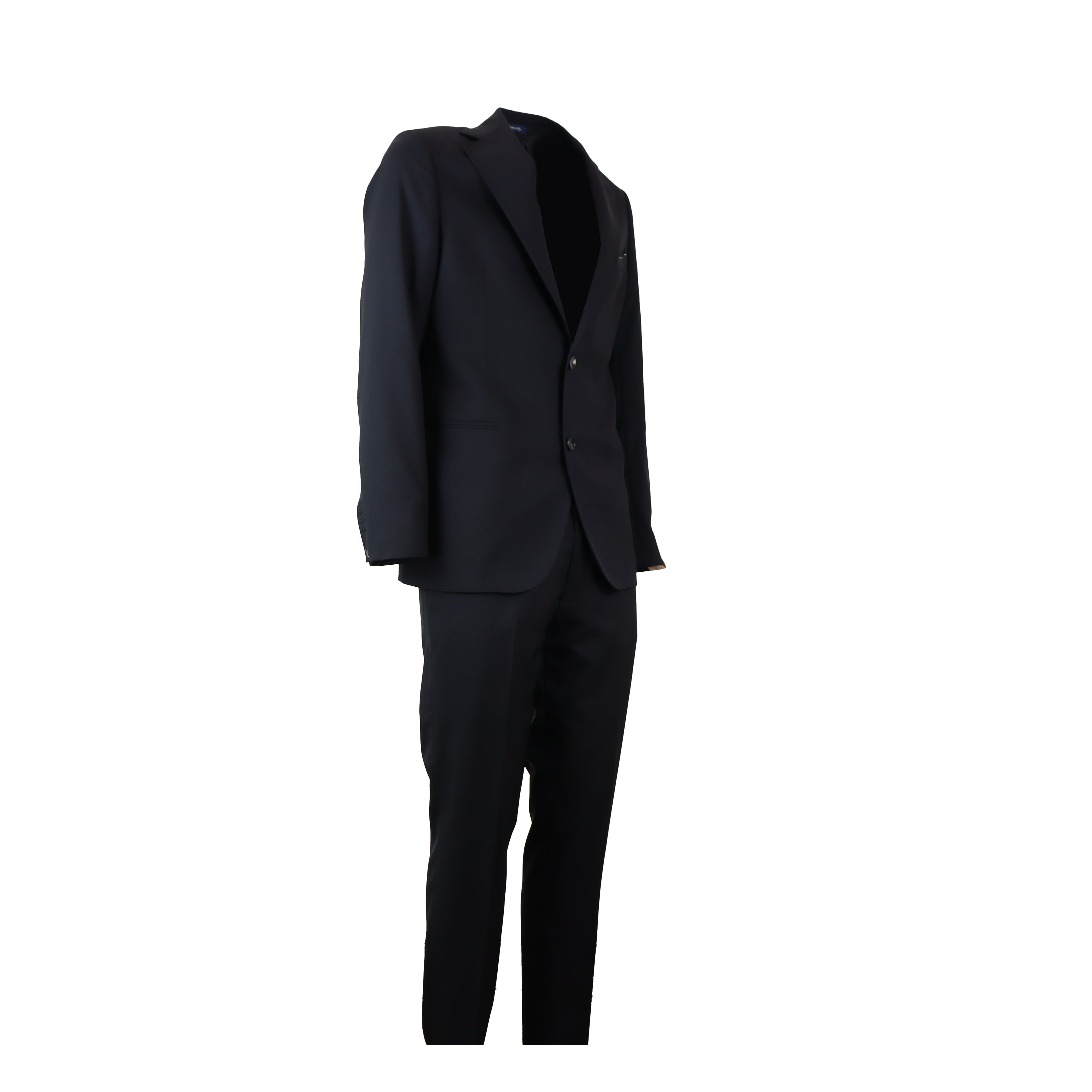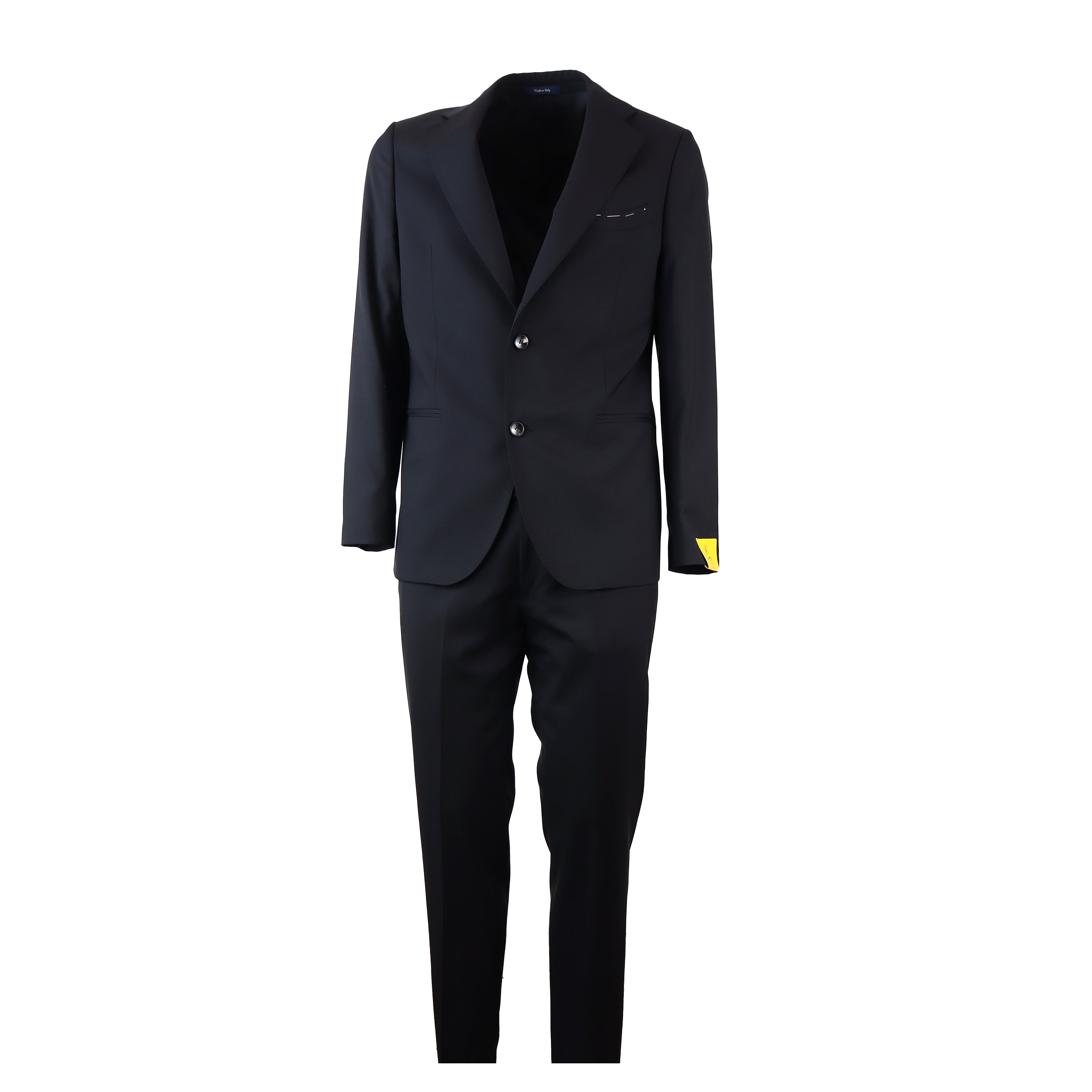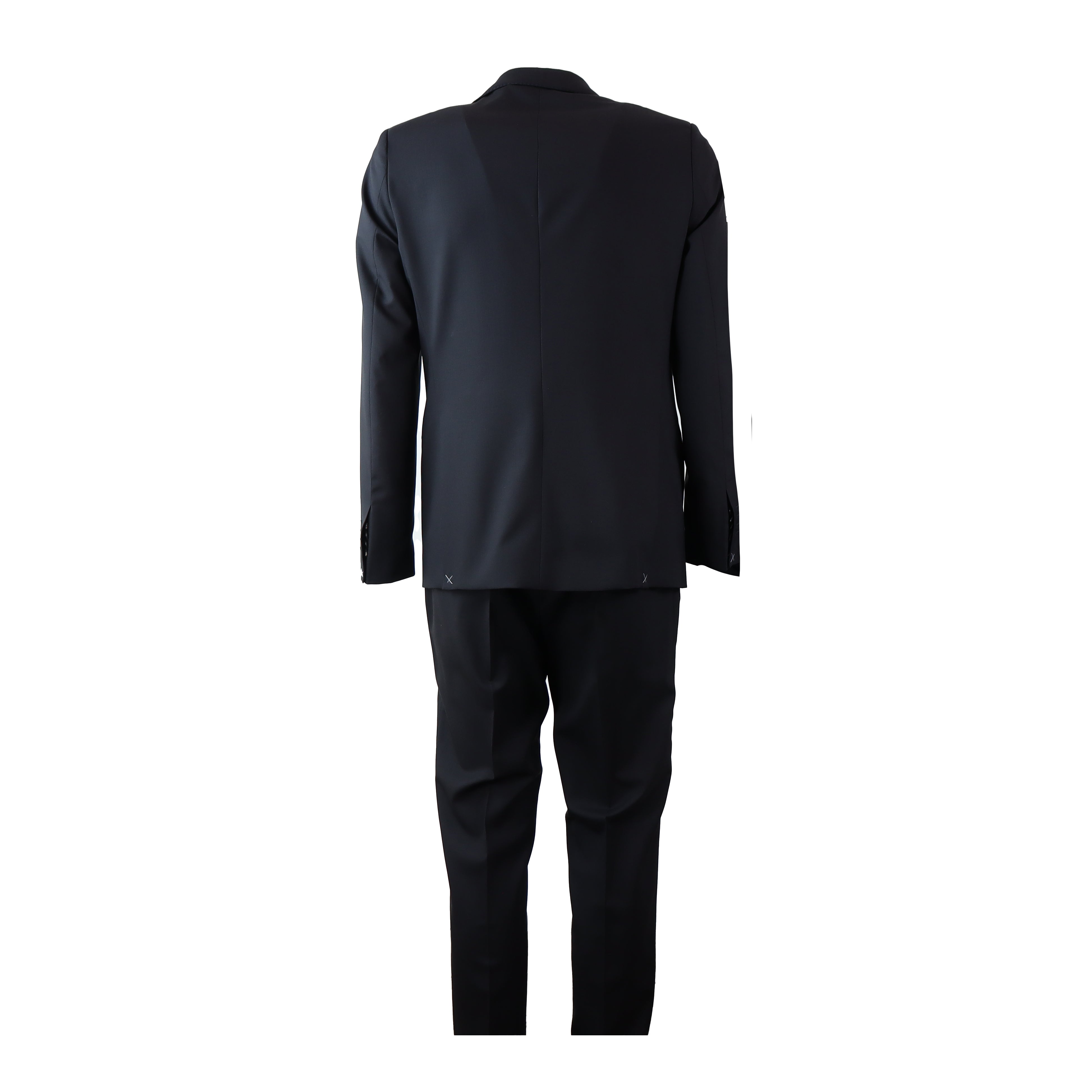 Abito GREGORIO nero di GALA' X FEDELE in 100% lana vergine estiva VITALE BARBERIS CANONICO. Giacca monopetto rever classico, tasche a filetto, due spacchi posteriori. Pantalone ventre piatto con bottoni e zip.