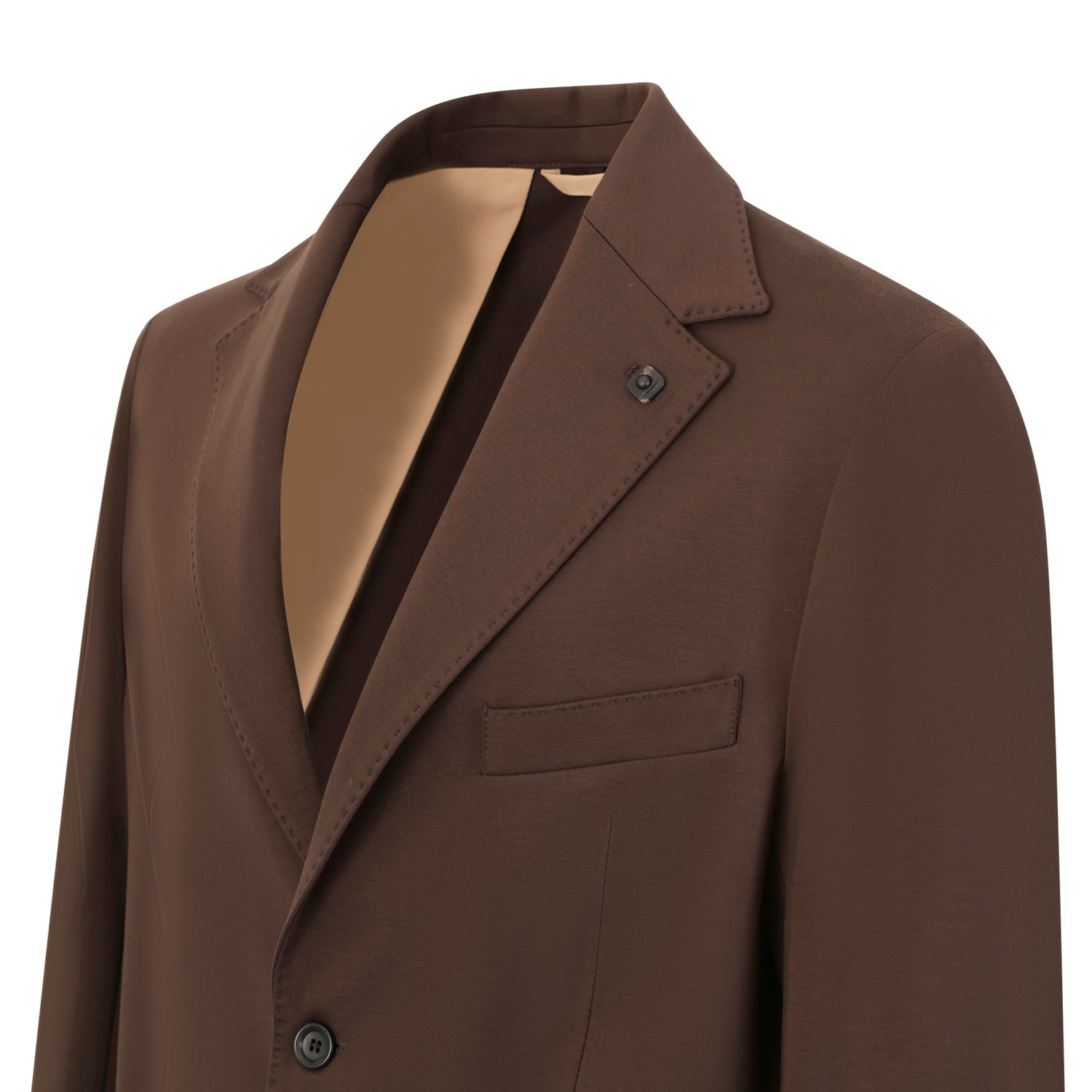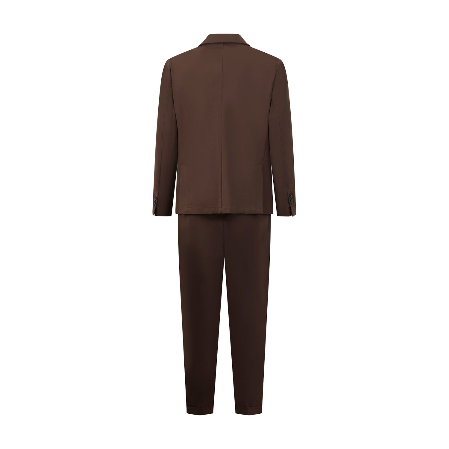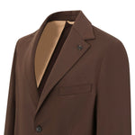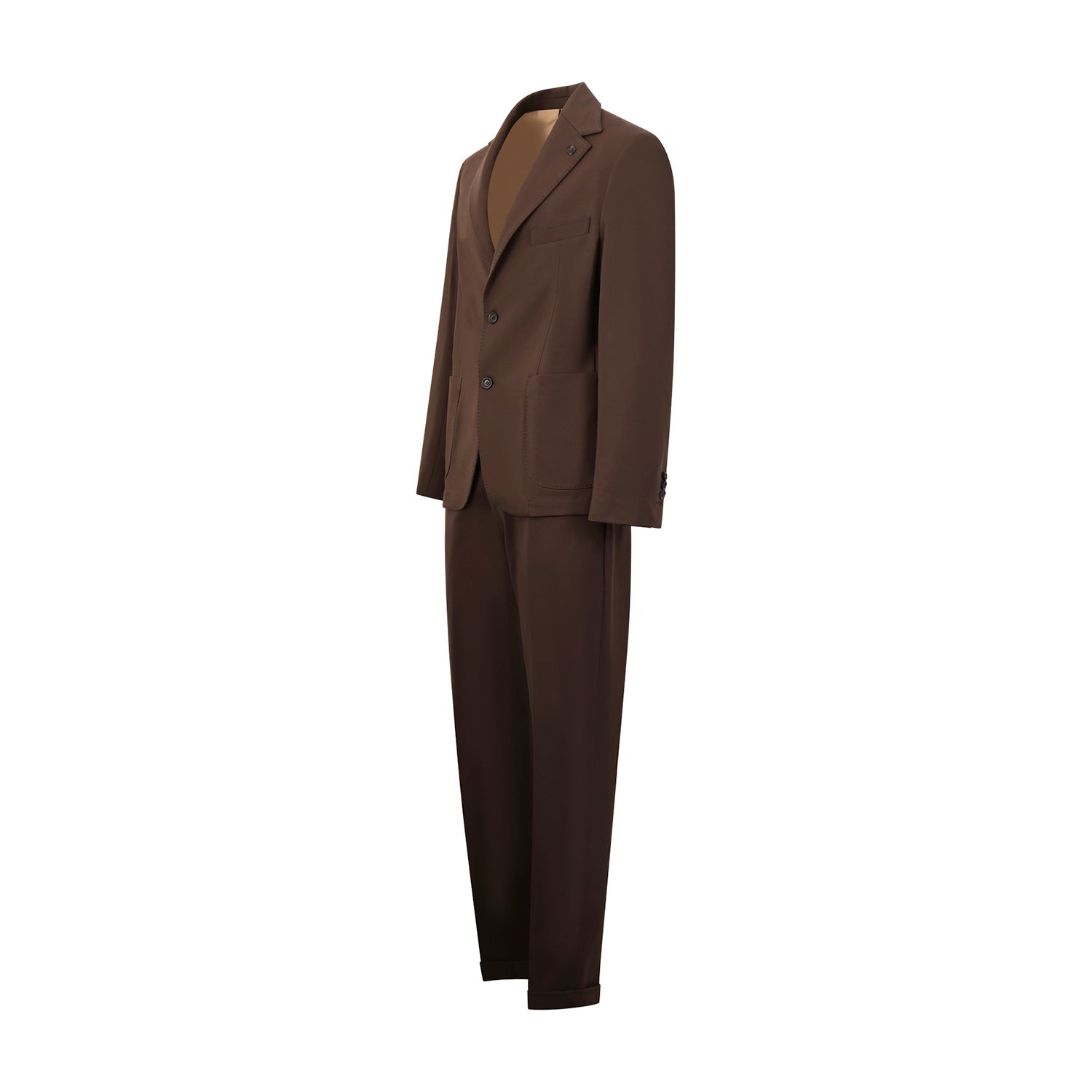 Abito marrone di OUTFIT in punto milano con giacca a due bottoni con rever classico, tasche a toppe e due spacchi laterali, pantalone tasca america.
