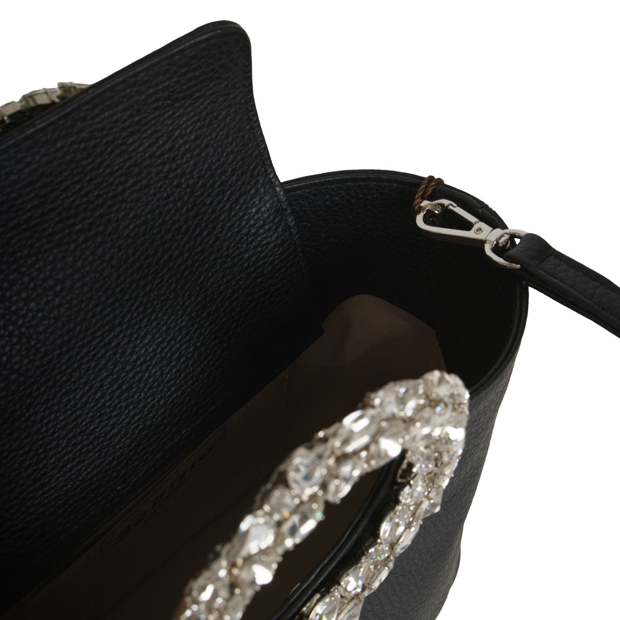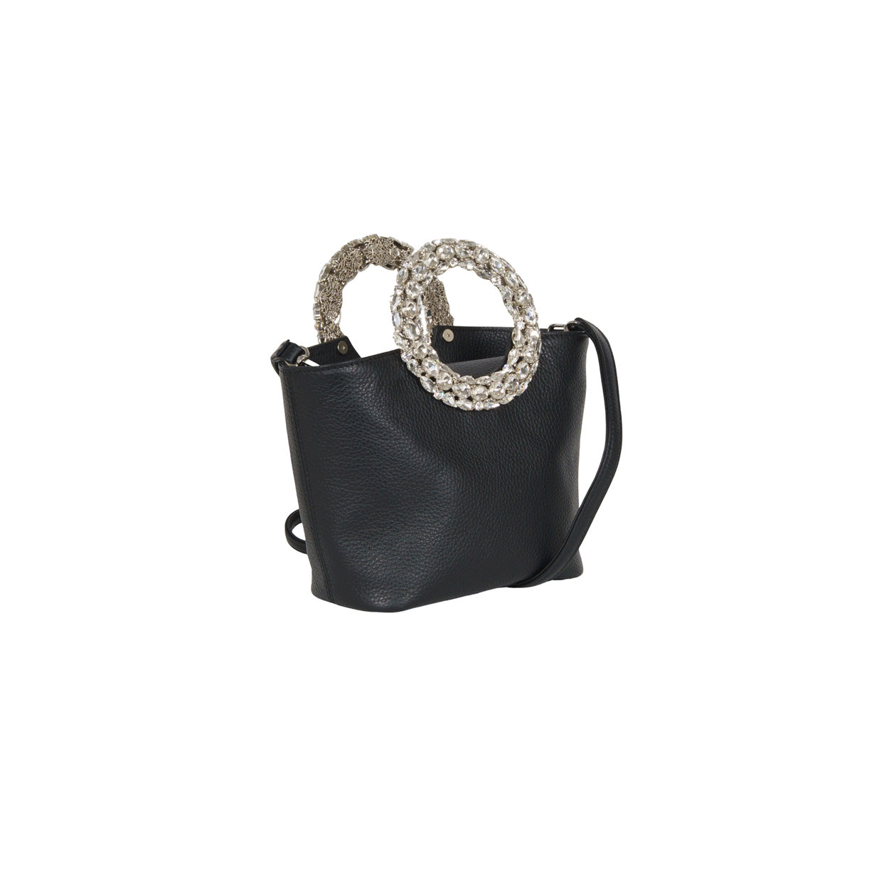 Borsa CIRCLE nera di SEBILLO in pelle bottalata con manico circolare in cristalli e tracolla interna. Misure 29x17x9cm.