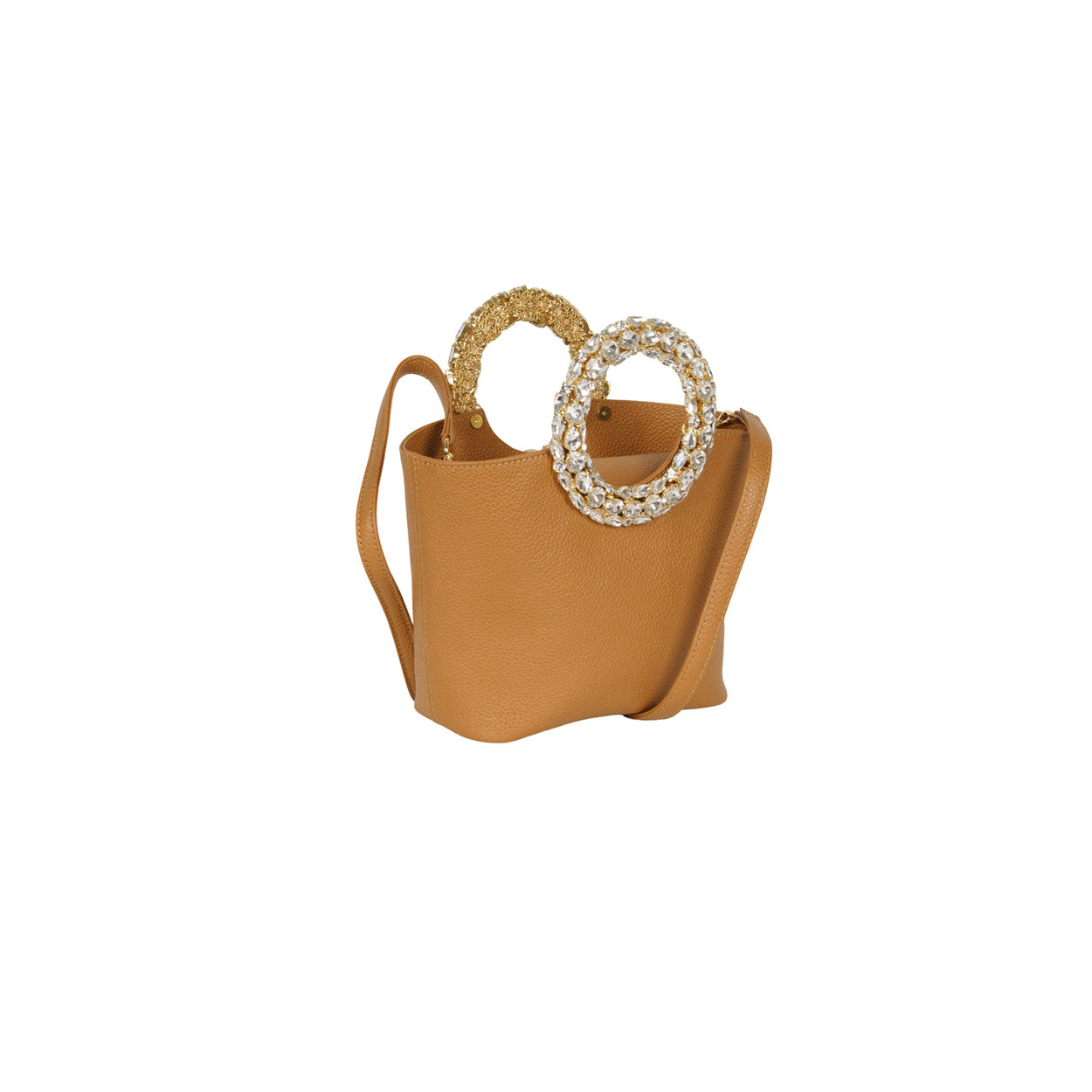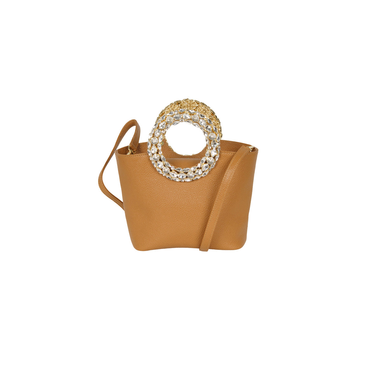 Borsa CIRCLE cuoio di SEBILLO in pelle bottalata con manico circolare in cristalli e tracolla interna. Misure 29x17x9cm.