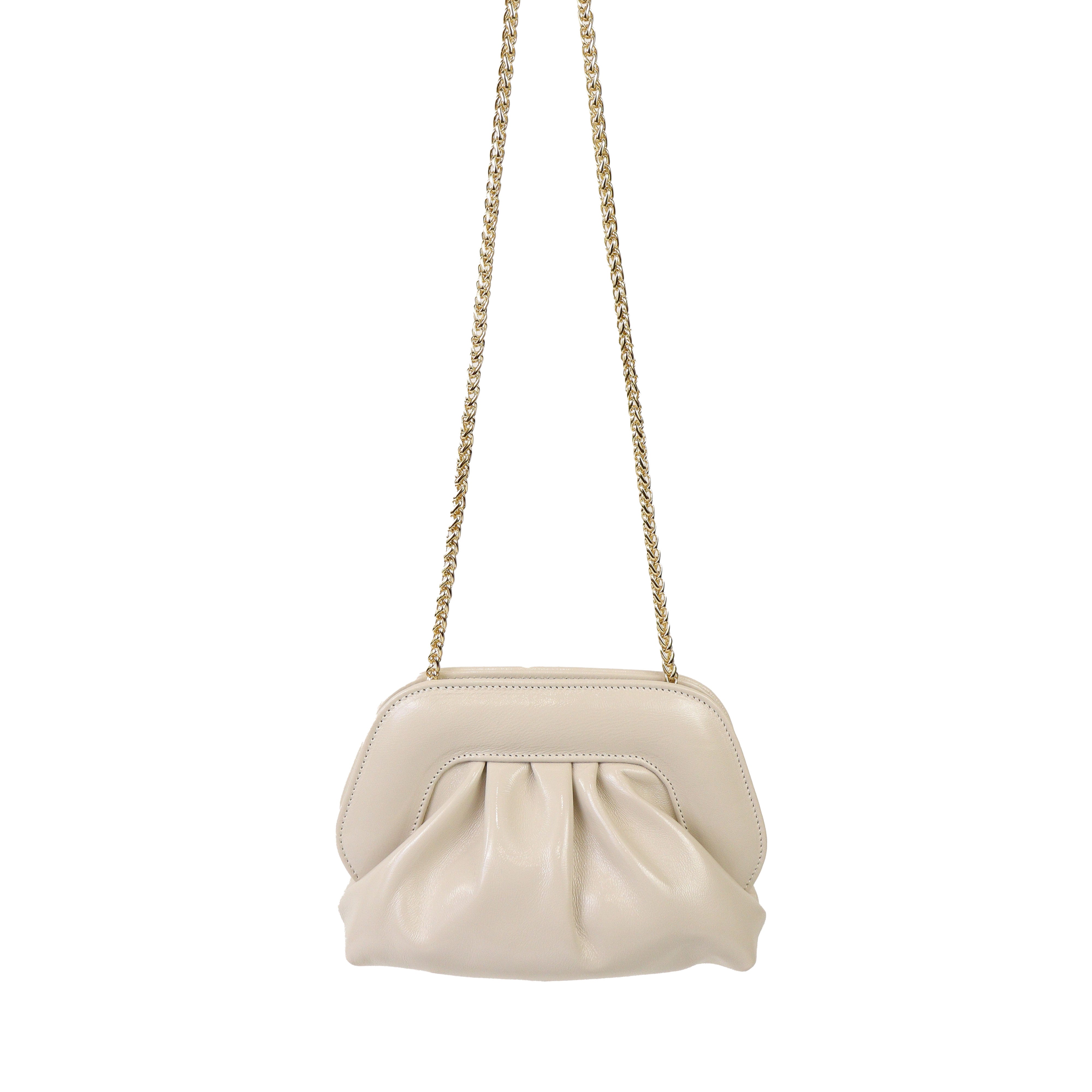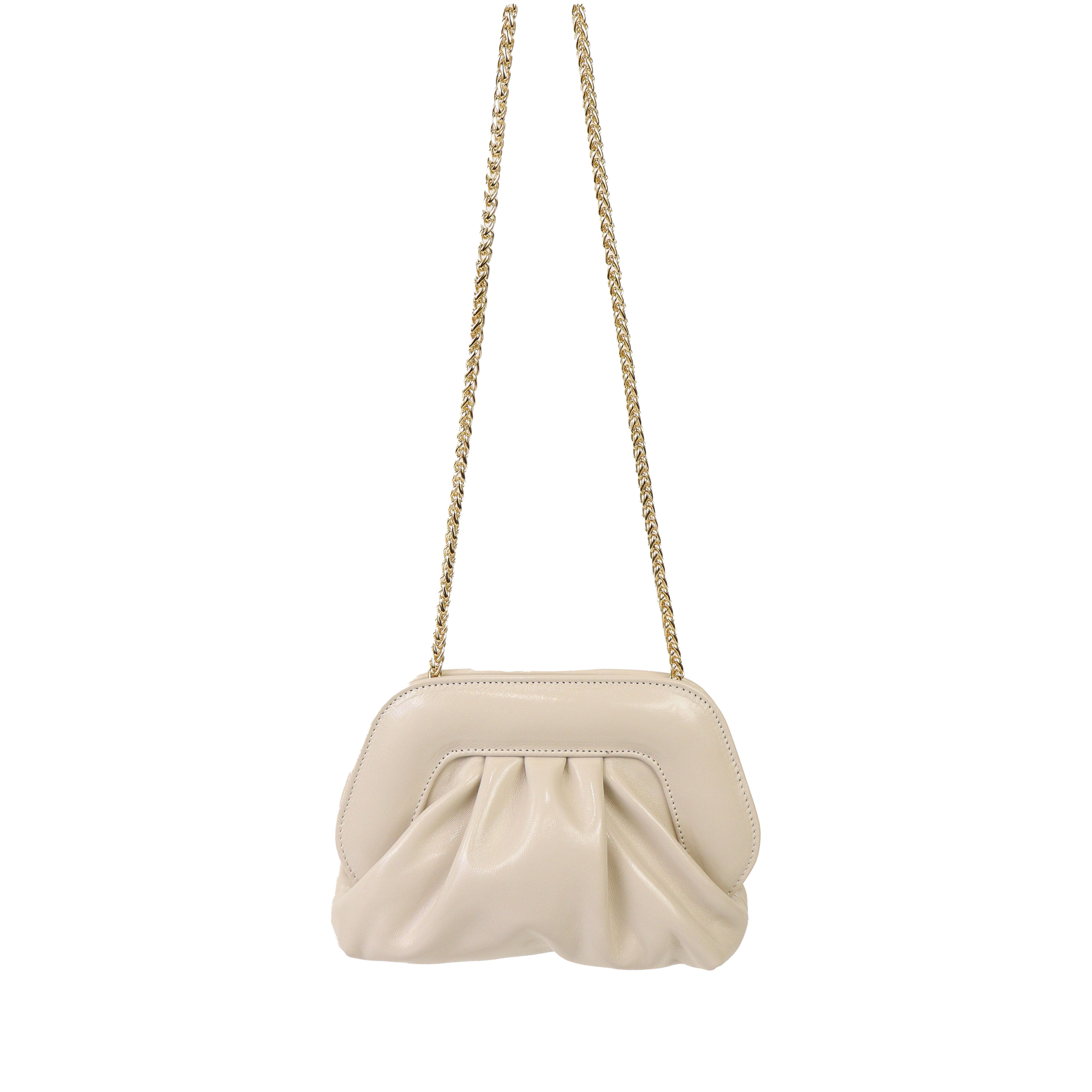 Borsetta c/arriccio ghiaccio in vernice di SCARLETT con tracollina a catena color oro e chiusura con clip. Misure 21x17x8 cm cm