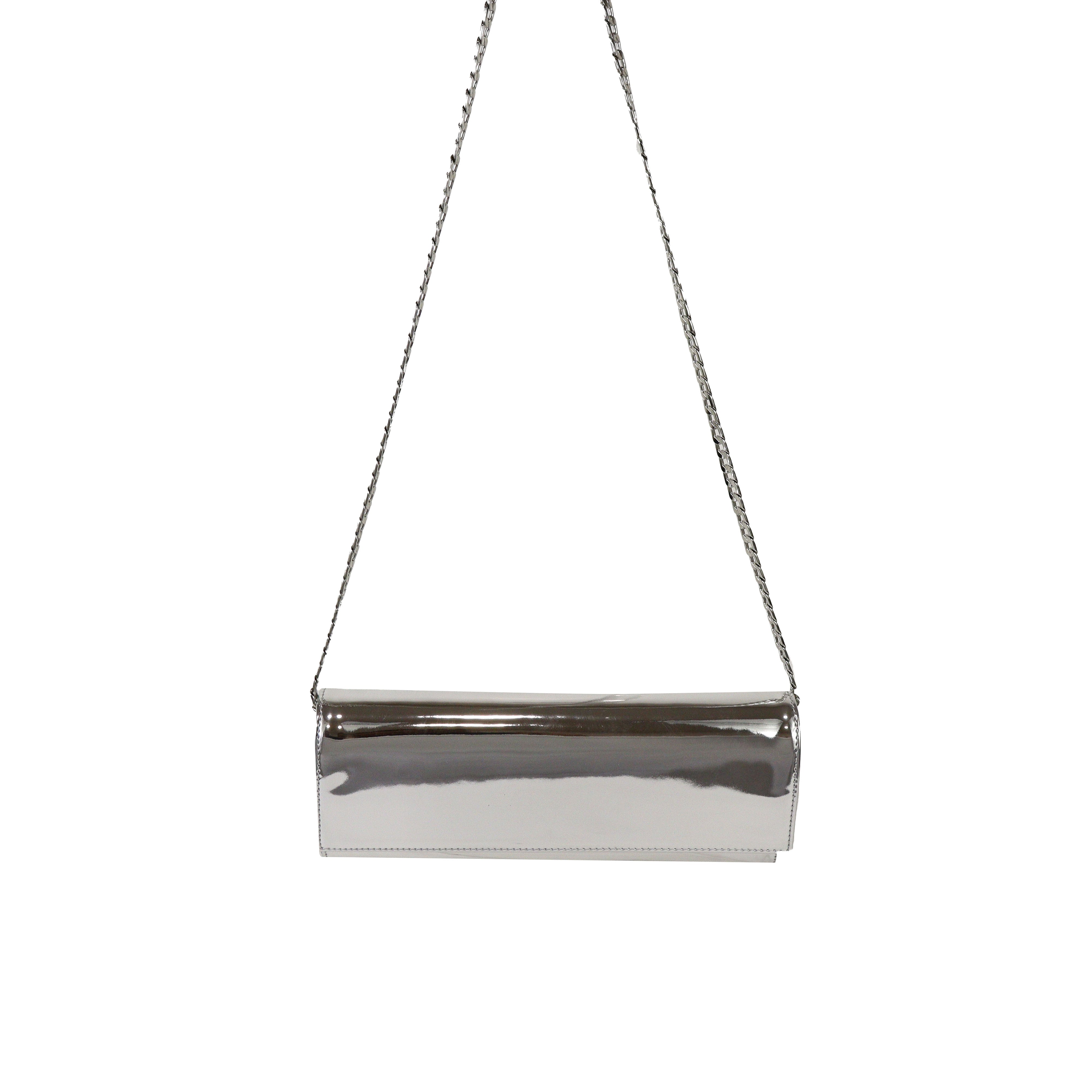 Clutch argento di ALDO CASTAGNA in pelle con effetto specchiato, patta e tracolla interna con catena in metallo oro. Misure 24x10x4cm.