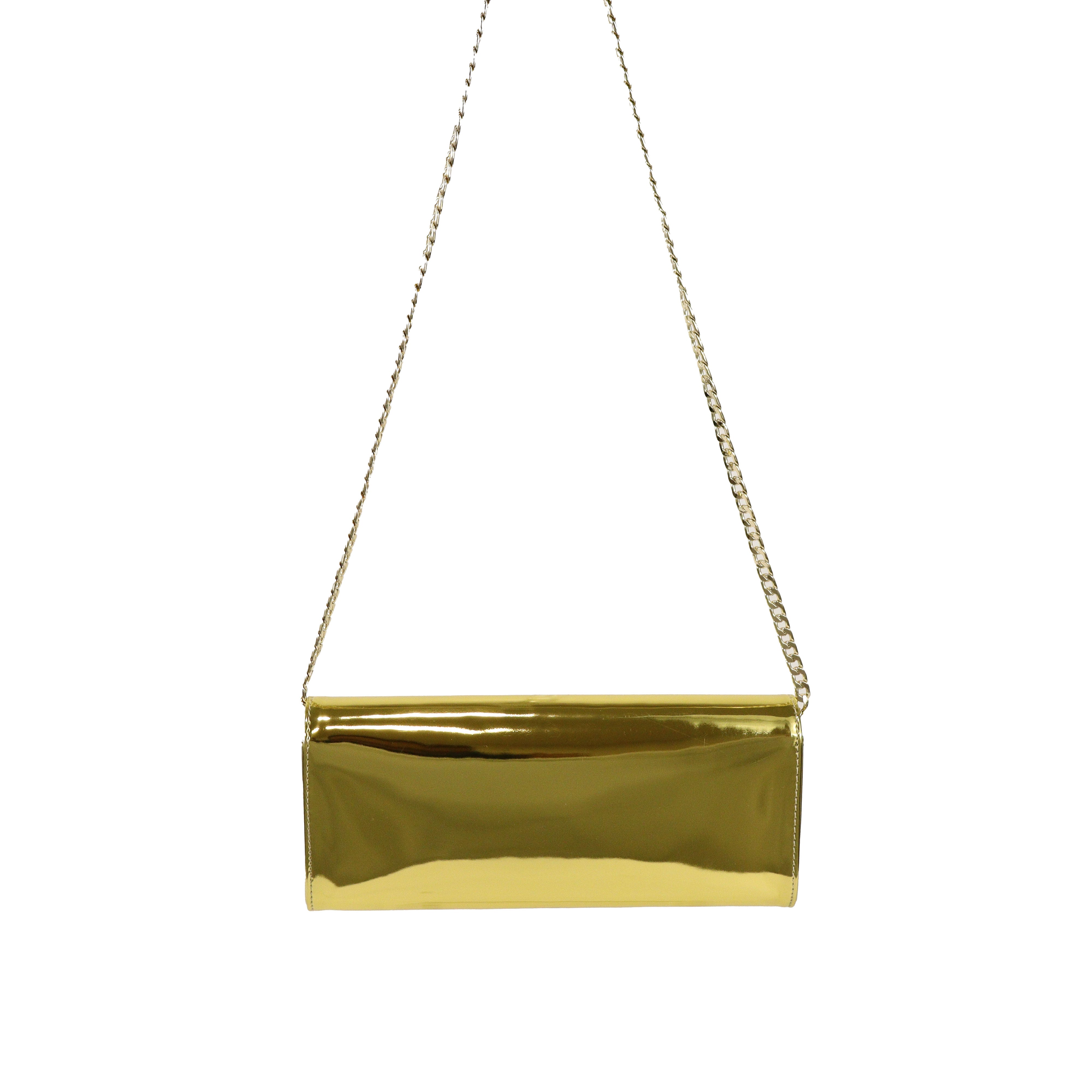 Clutch oro di ALDO CASTAGNA in pelle con effetto specchiato, patta e tracolla interna con catena in metallo oro. Misure 24x10x4cm.