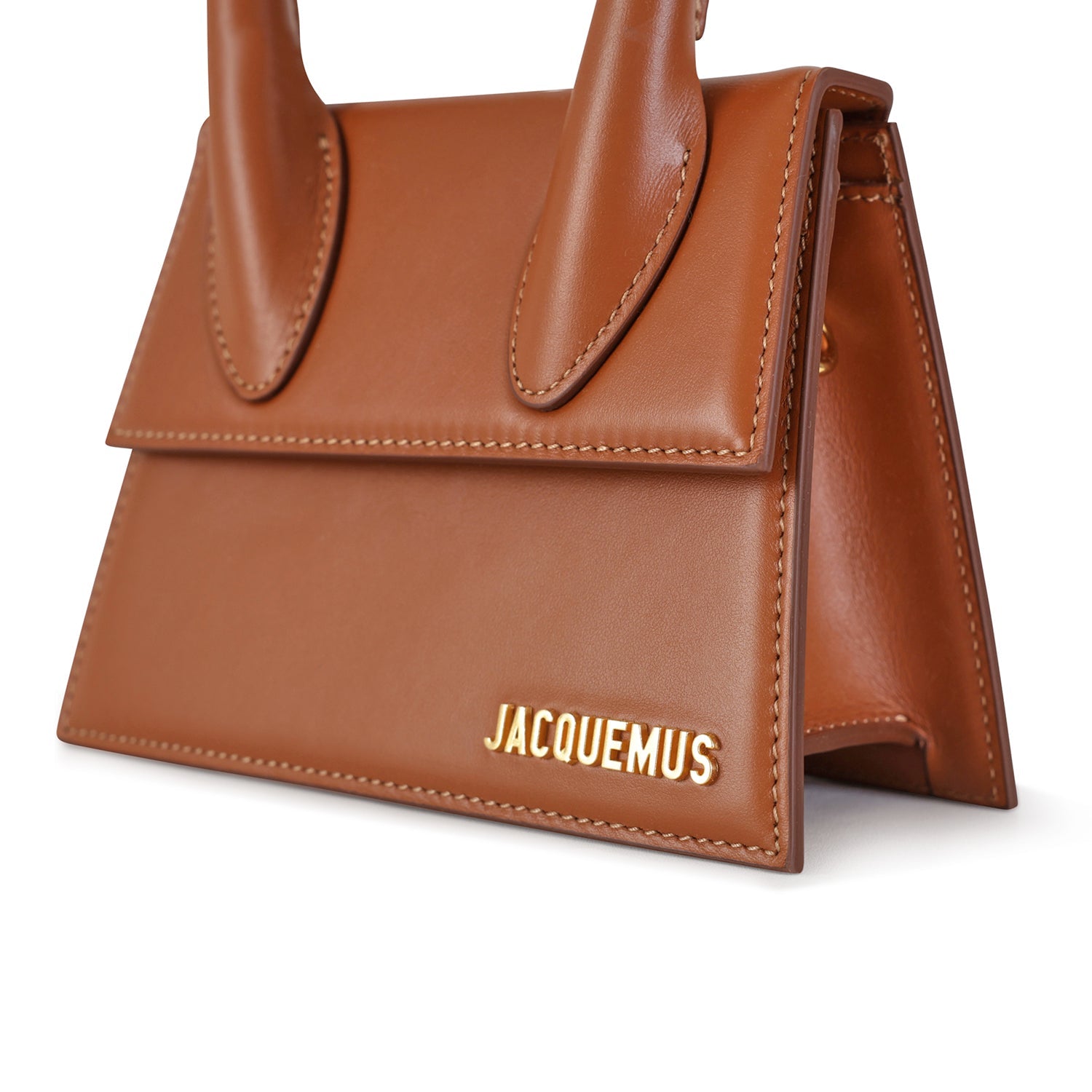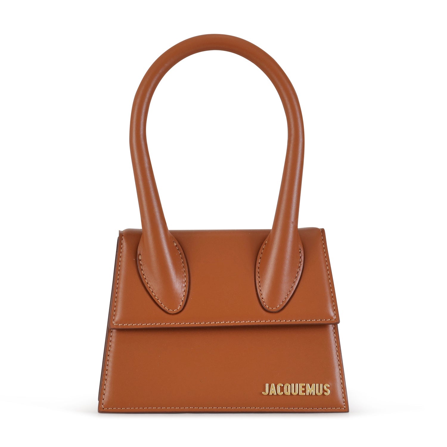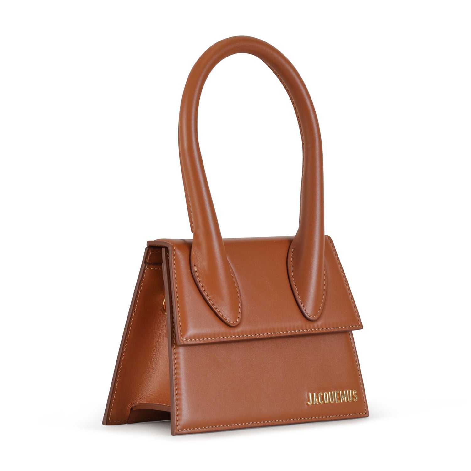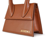 Le Chiquito Moyen cuoio di JACQUEMUS in pelle con tracolla interna in pelle in tinta, chiusura con patta, manico singolo e logo in metallo oro. Misura 19x13x9 cm.