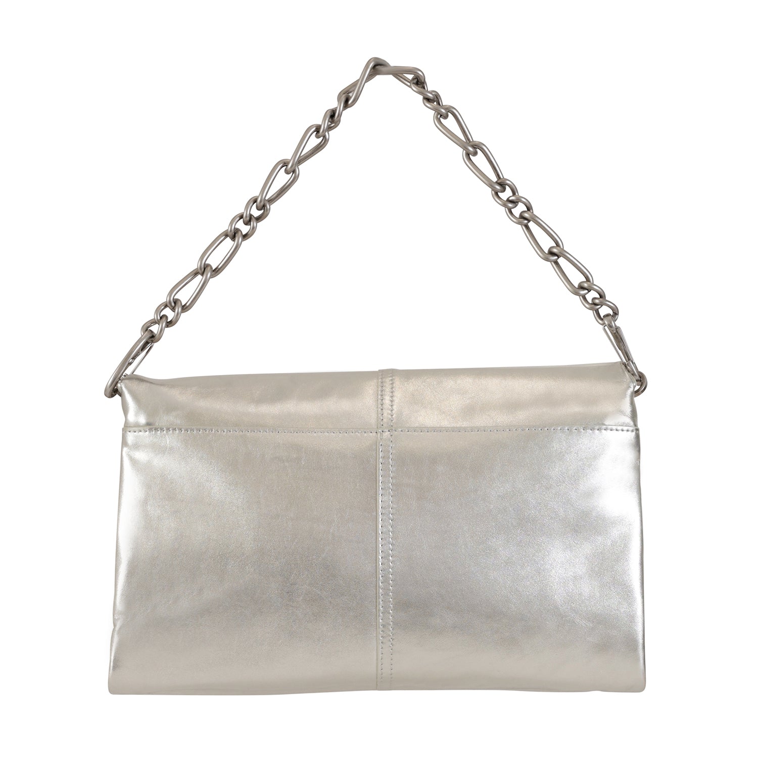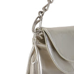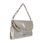 Pochette argento di PATRIZIA PEPE in pelle con doppia patta, catena in metallo e logo in acciaio. Misure 31x18x5 cm.