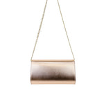 Pochette oro rosa metalizzata di SCARLETT con patta arricchita da dettaglio nodo con strass con chiusura a clip. Tracollina a catena color oro. Misure 21x12x6 cm