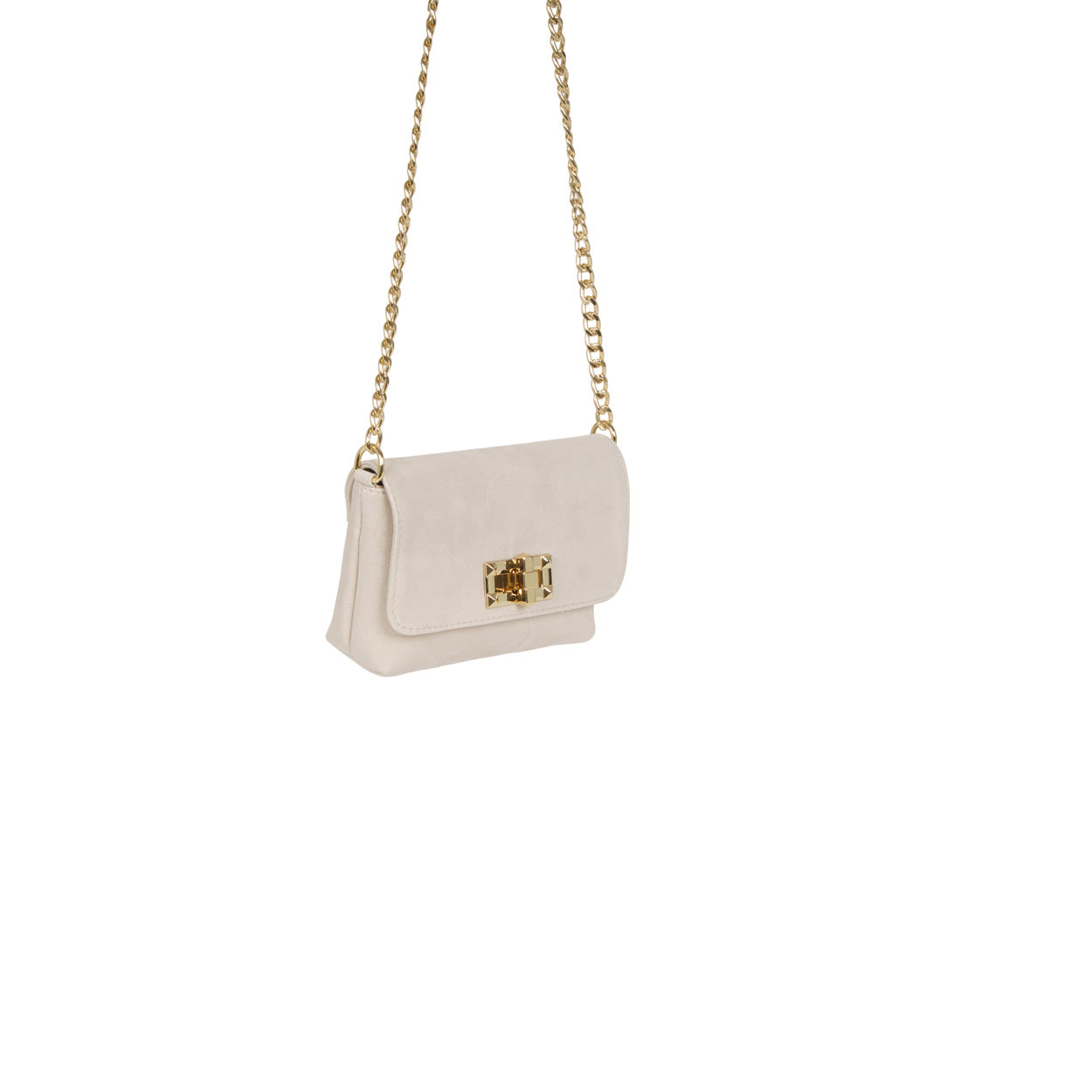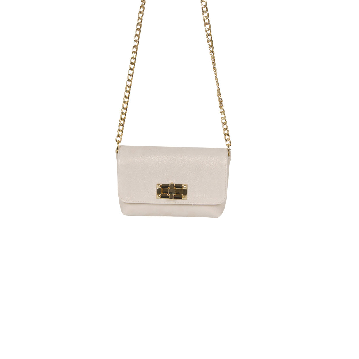 Tracolla beige di SEBILLO in pelle satinata con patta e chiusura con gancio, catena interna. Misure 17x10x5cm.