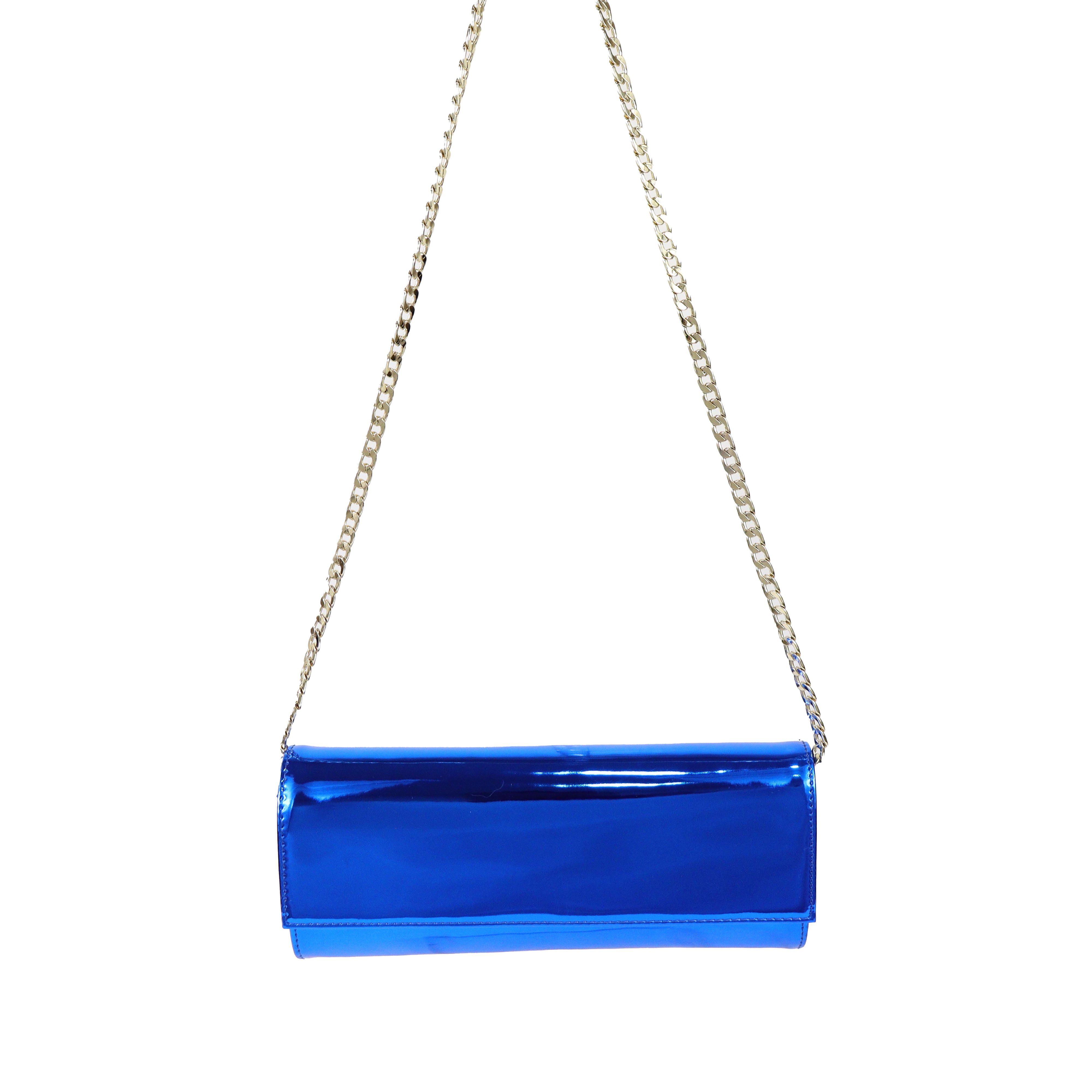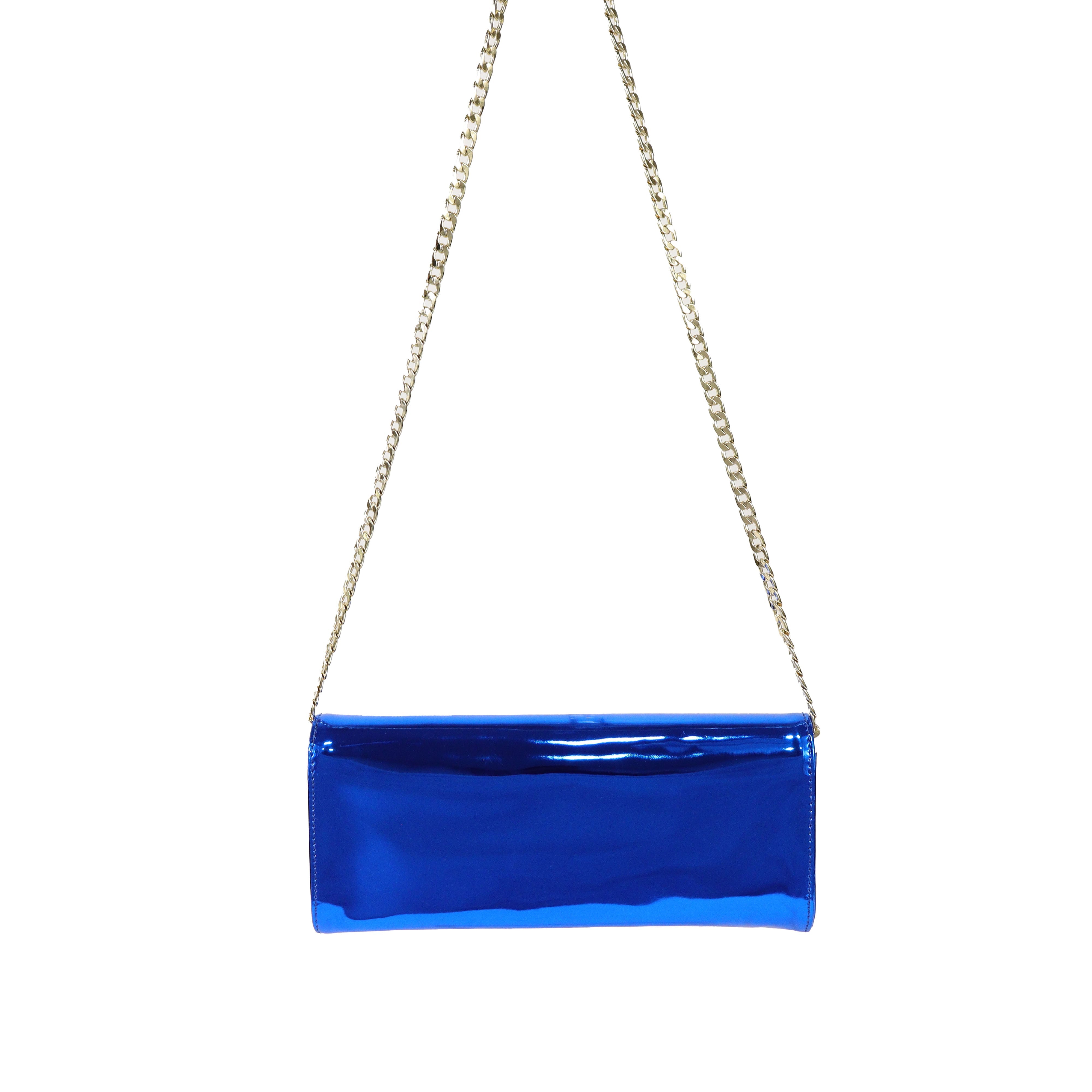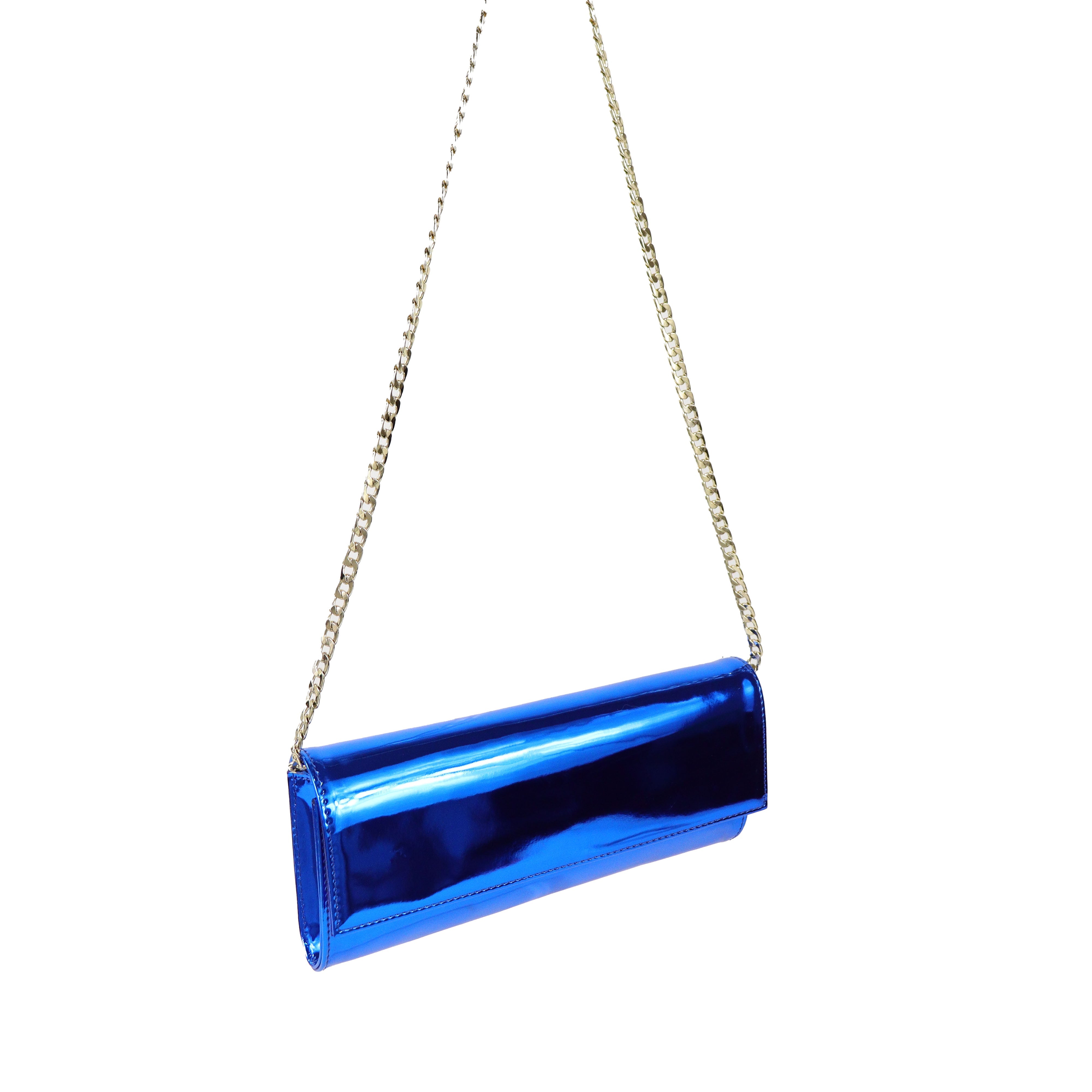 Clutch bluette di ALDO CASTAGNA in pelle con effetto specchiato, patta e tracolla interna con catena in metallo oro. Misure 24x10x4cm.