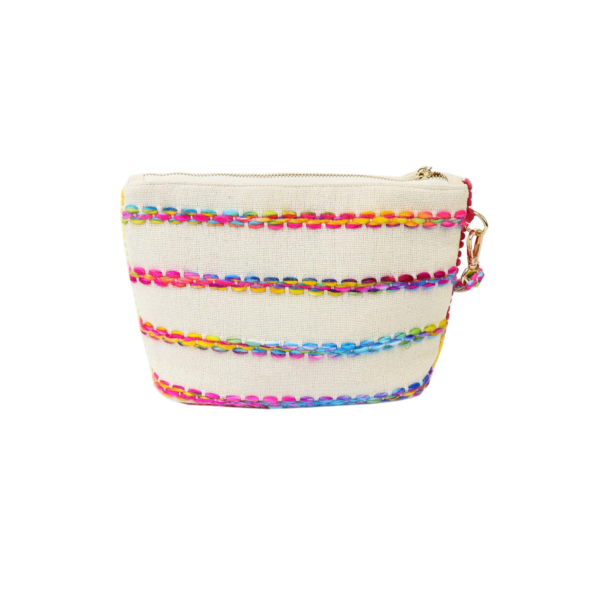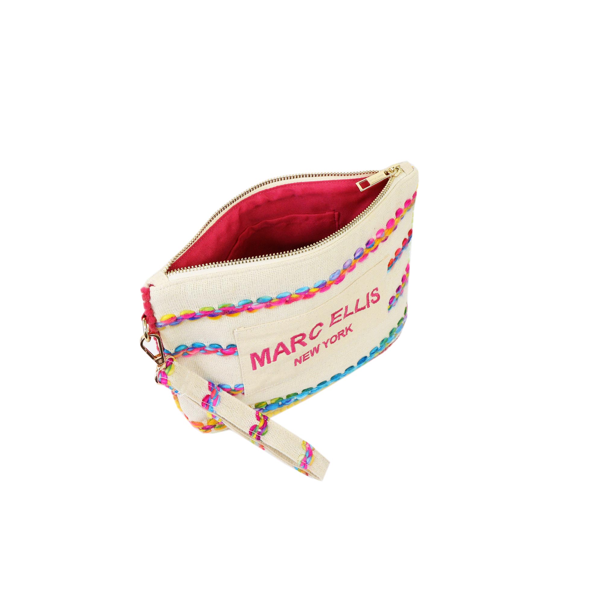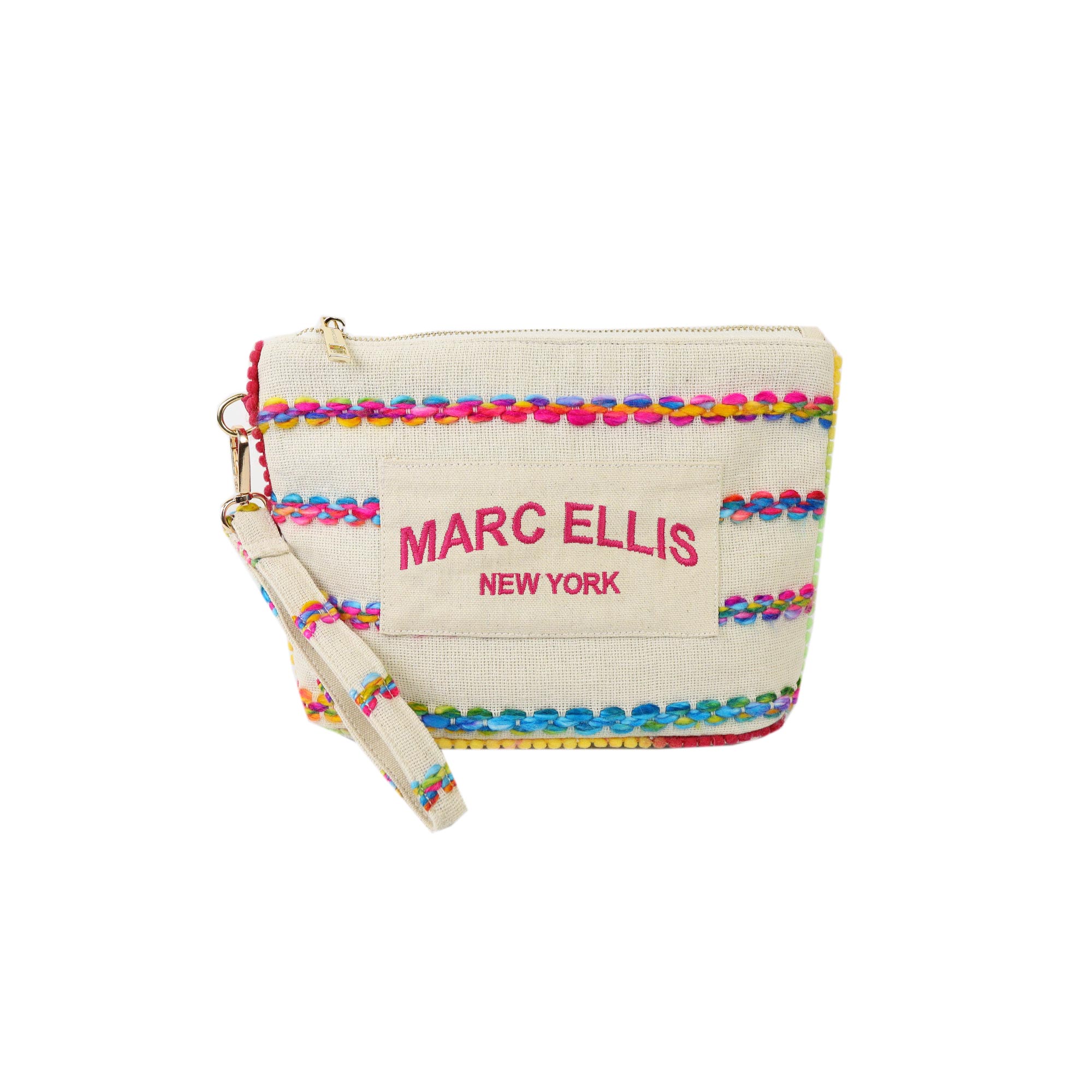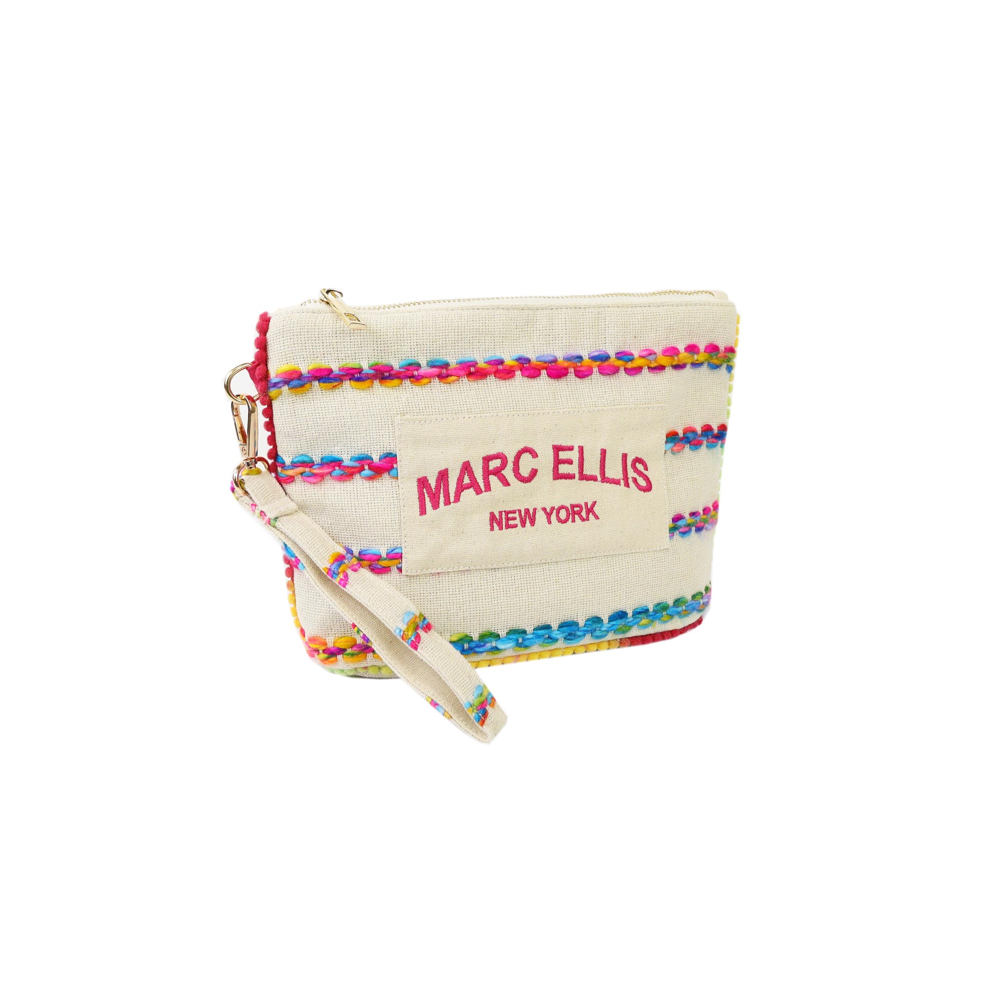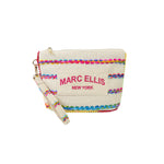 Pochette beige CASSY INDY di MARC ELLIS in canvas. La borsetta è dotata di manico in tessuto removibile, dettagli cuciture e bordi multicolor, chiusura a zip e logo lettering. All'interno è composto da un unico scomparto con tasche. Misure 28x18x9 cm