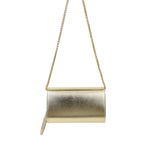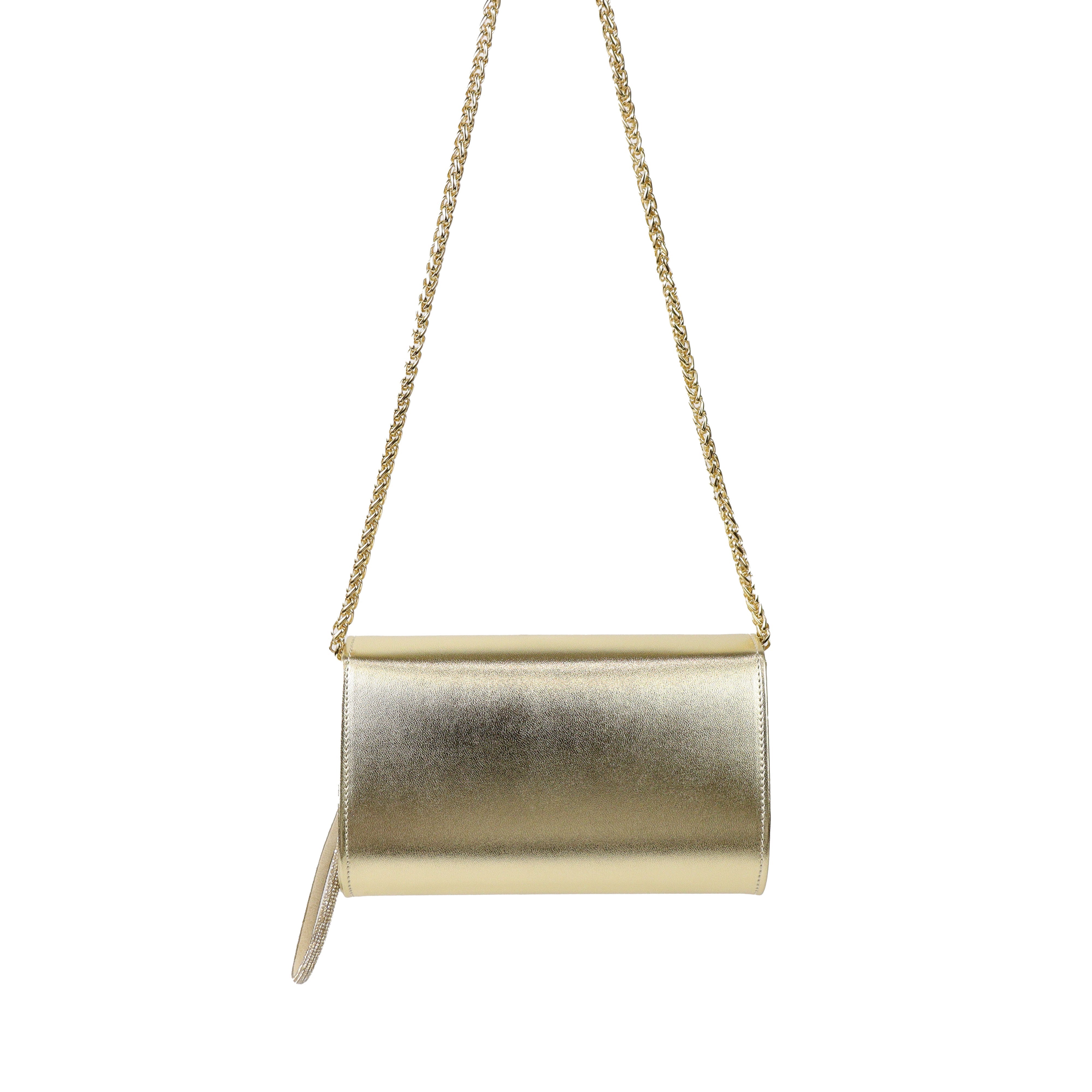 Pochette platino metalizzata di SCARLETT con patta, tracollina a catena color oro, manico con gancio removibile con strass color oro e chiusura con clip. Misure 19x11x5 cm