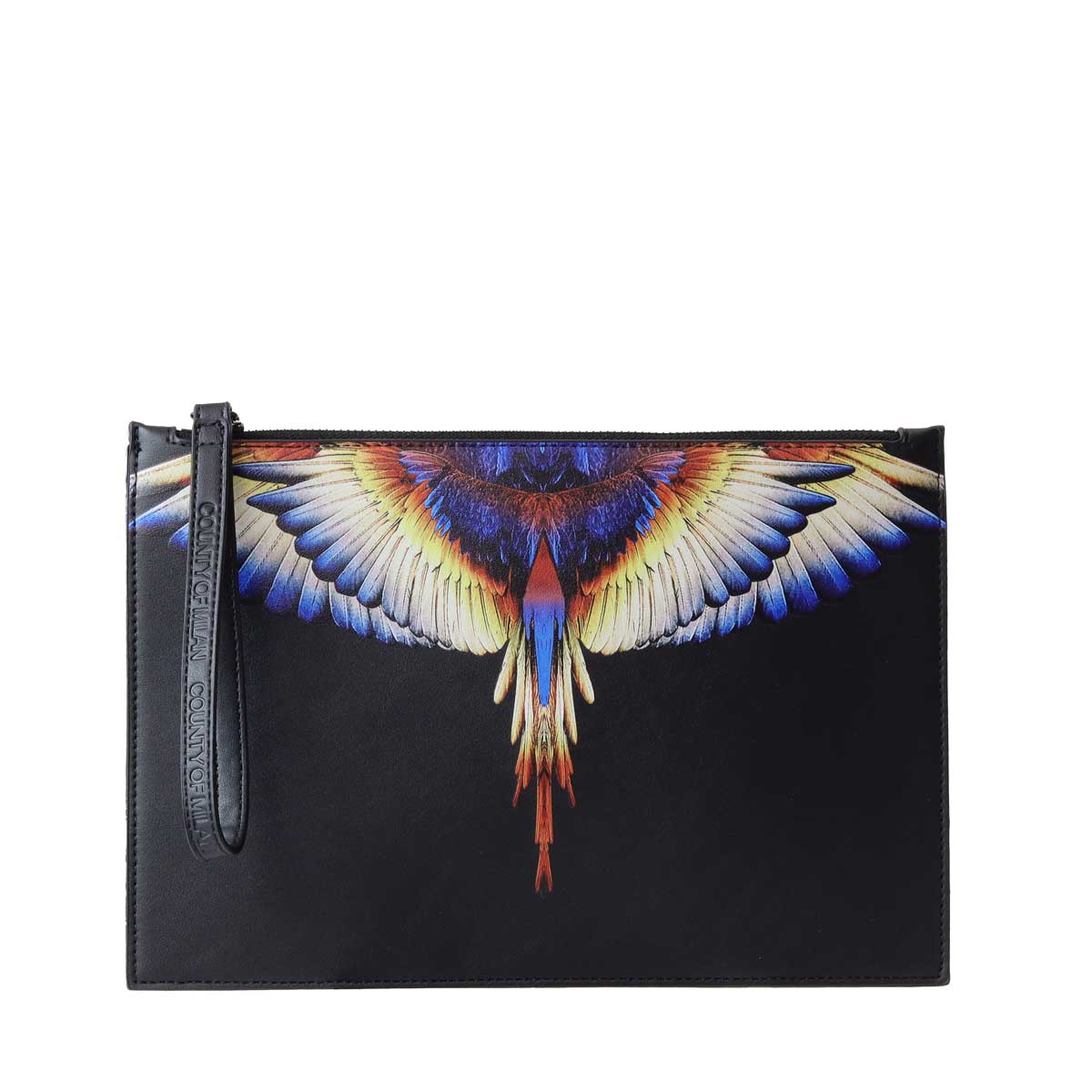 Pochette nera di COUNTY OF MILAN MARCELO BURLON in ecopelle con chiusura con zip, polsiera e stampa ali multicolor con gradazione gialla. Misure 30x20x1 cm.