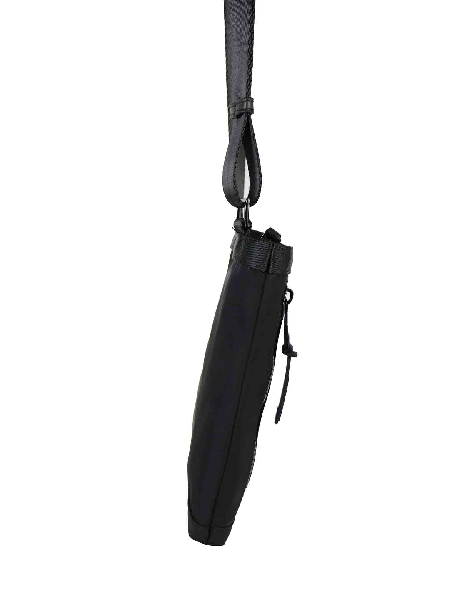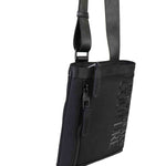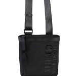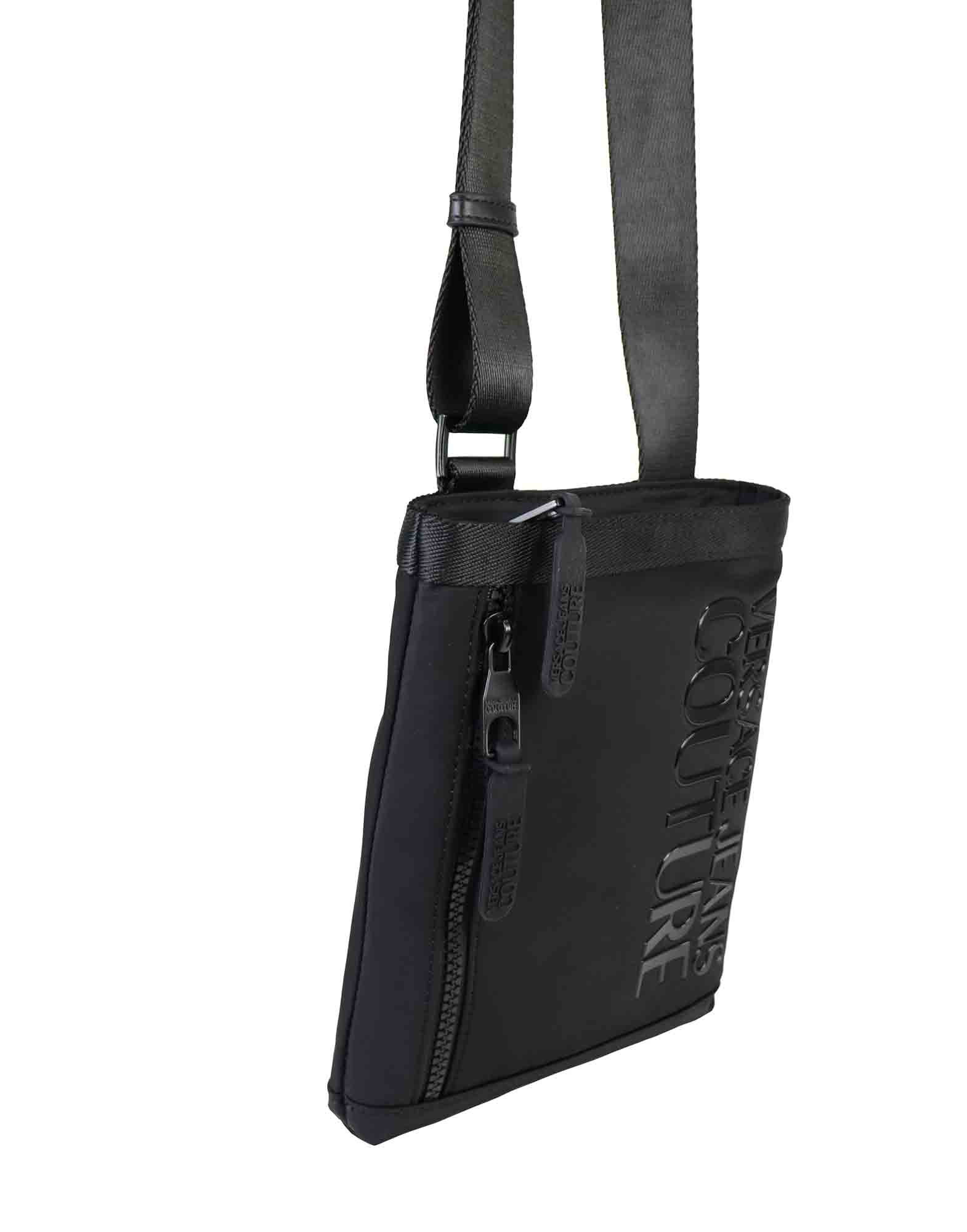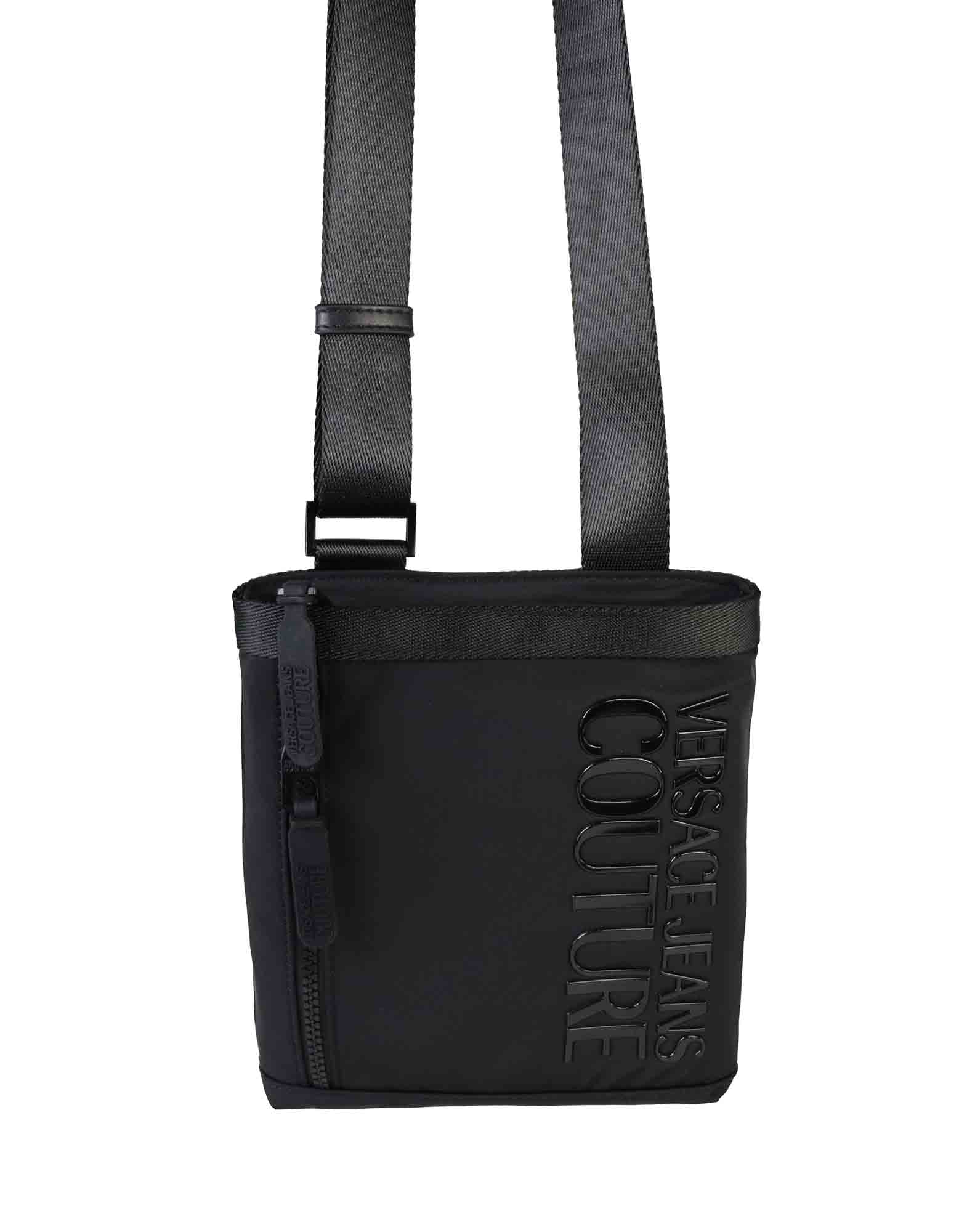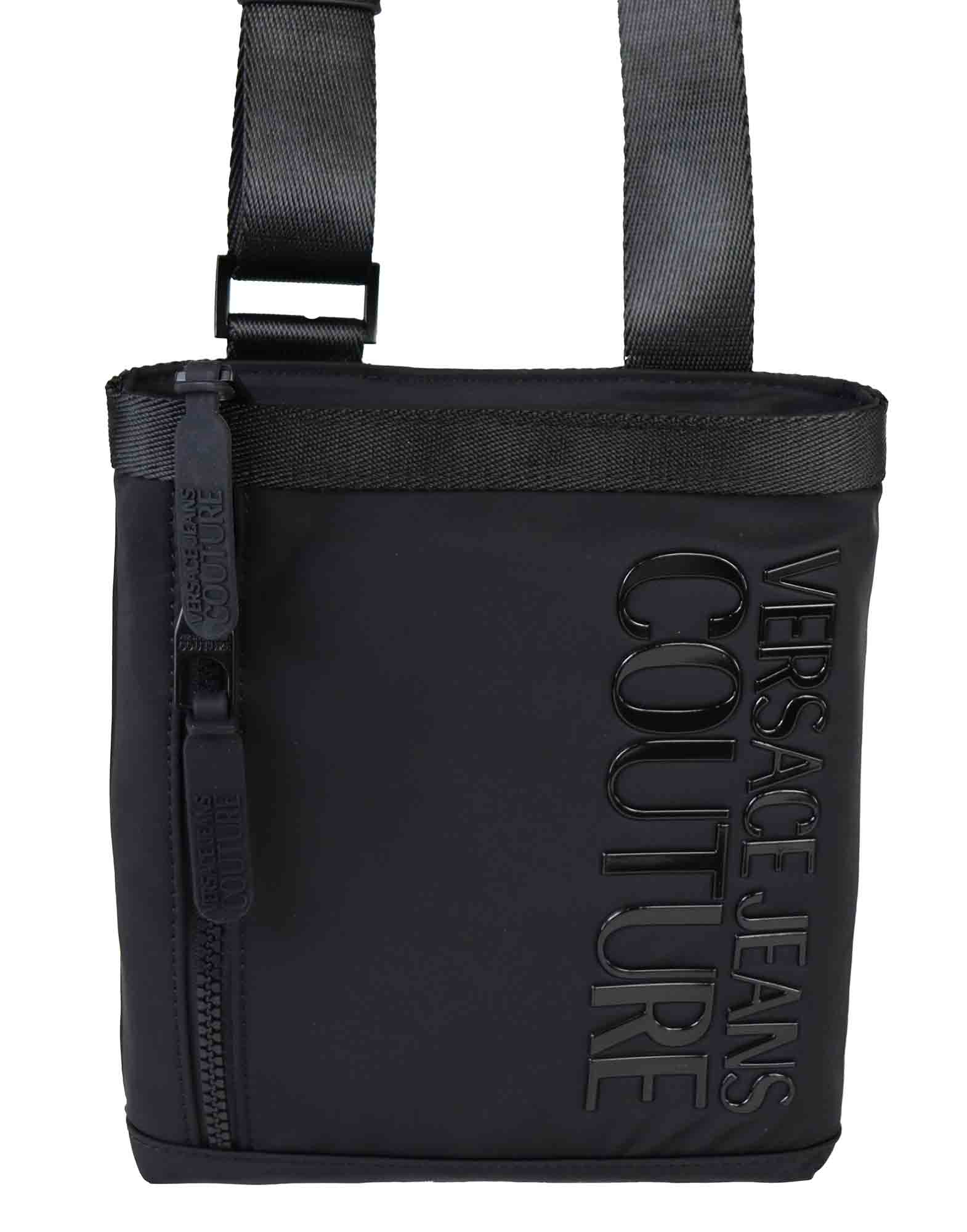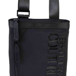 Tracolla VERSACE in nylon nero, tasca frontale con logo su tono. Chiusura con zip.