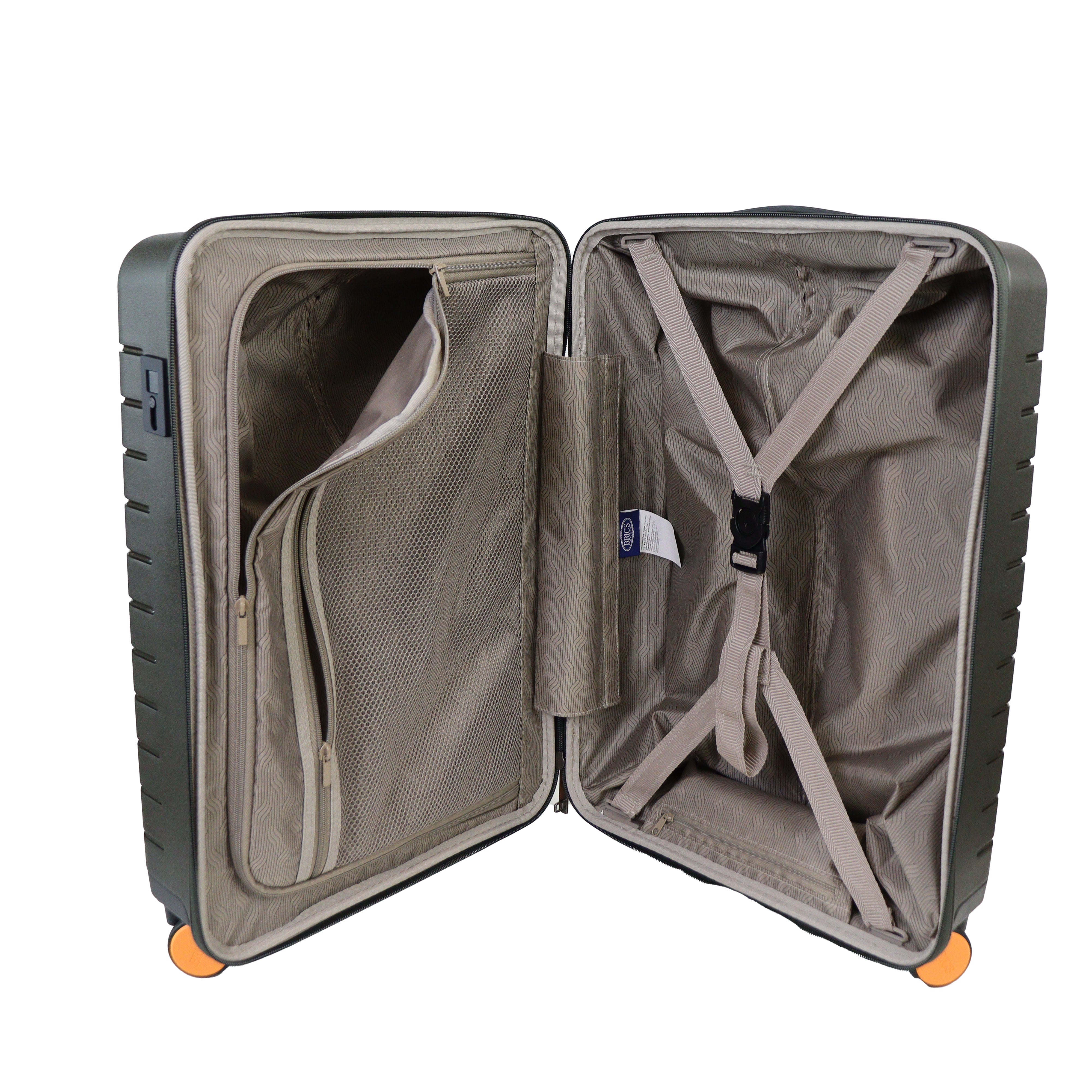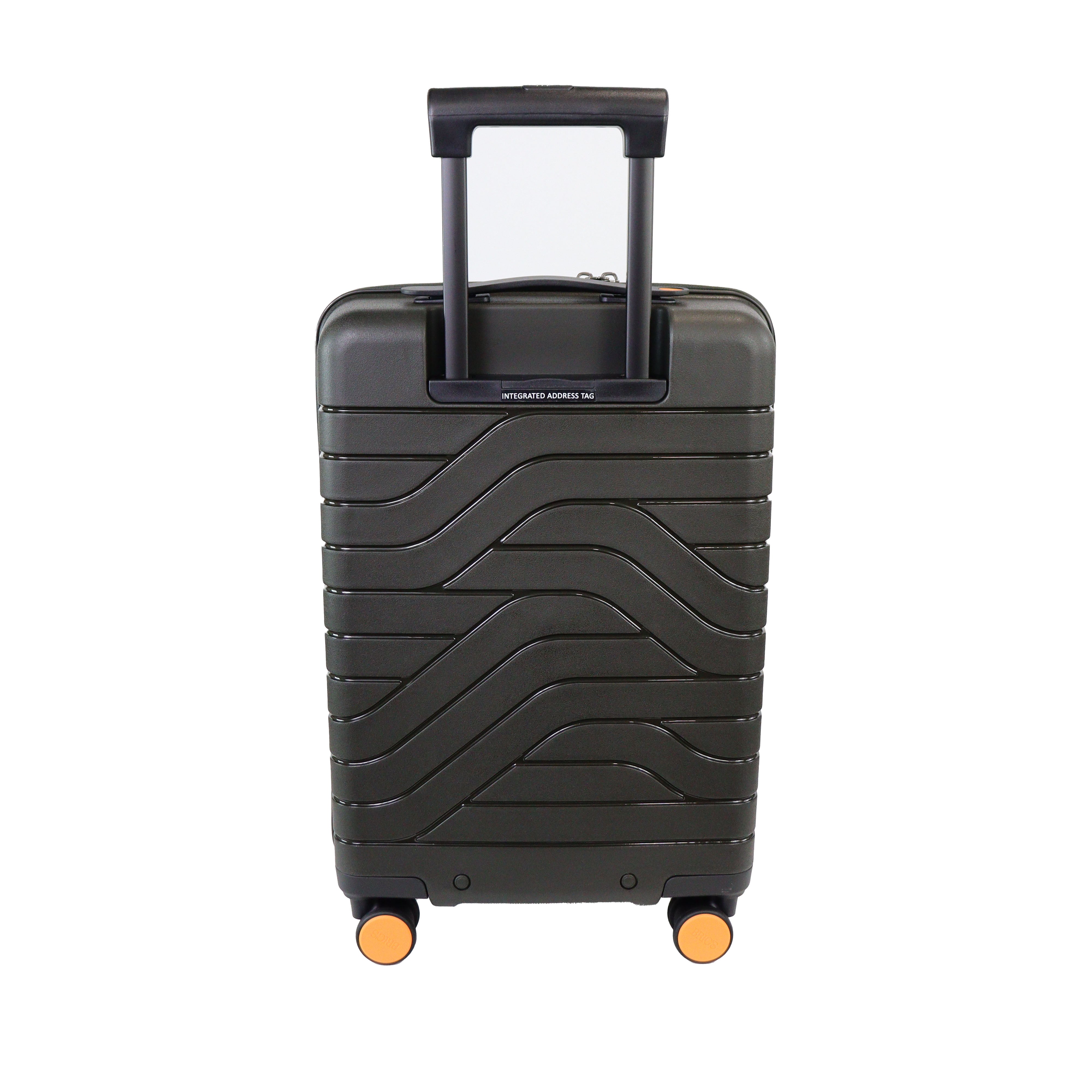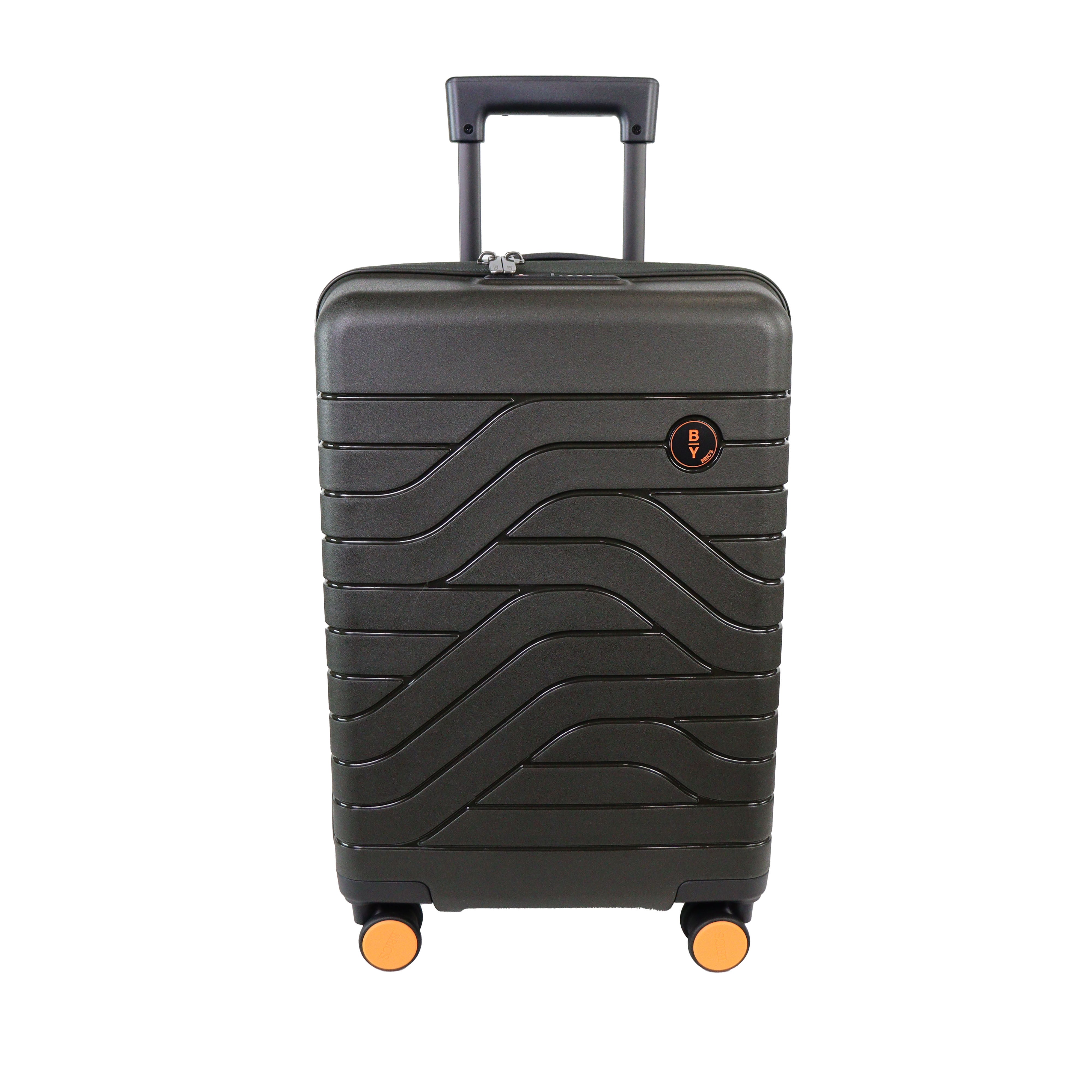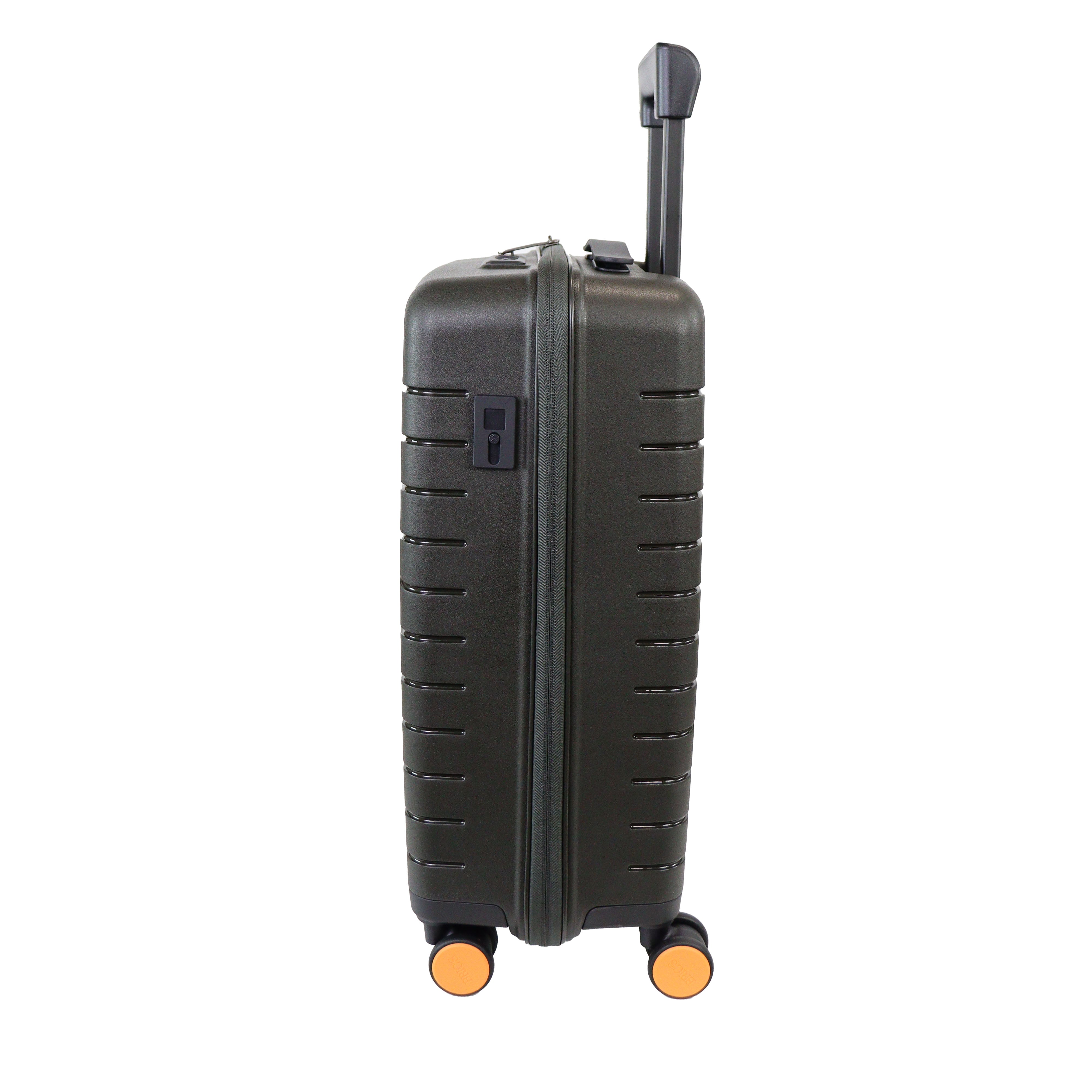 Cabin trolley piccolo rigido verde oliva di BRICS in polipropilene con chiusura a zip con dettaglio logo del brand. Blocco con codice e ricarica usb. Divisore con taschino con rete e taschino centrale con zip. Misure 37x55x20 cm.