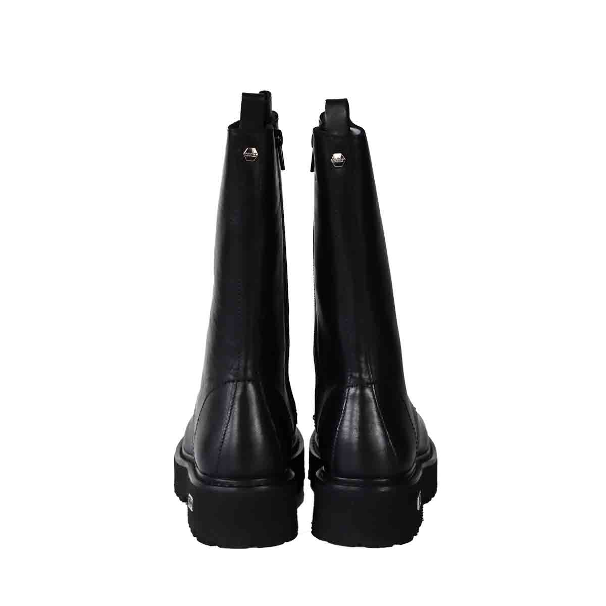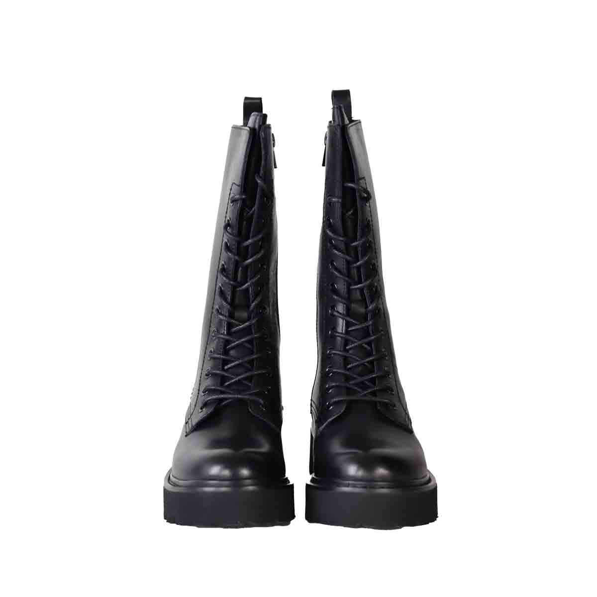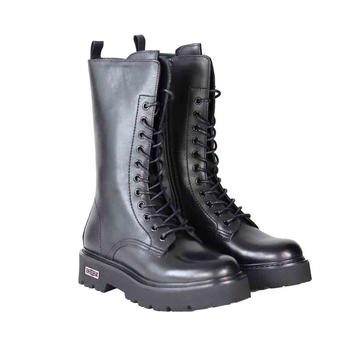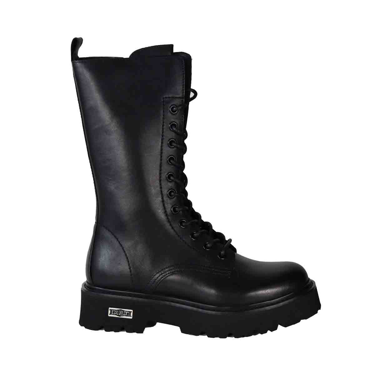 Anfibio SLASH BOOT nero di CULT in pelle con lacci modello 11 fori, zip interna per agevolare la calzata e punta arrotondata. Fondo in gomma alto 4 cm con targhetta logo.