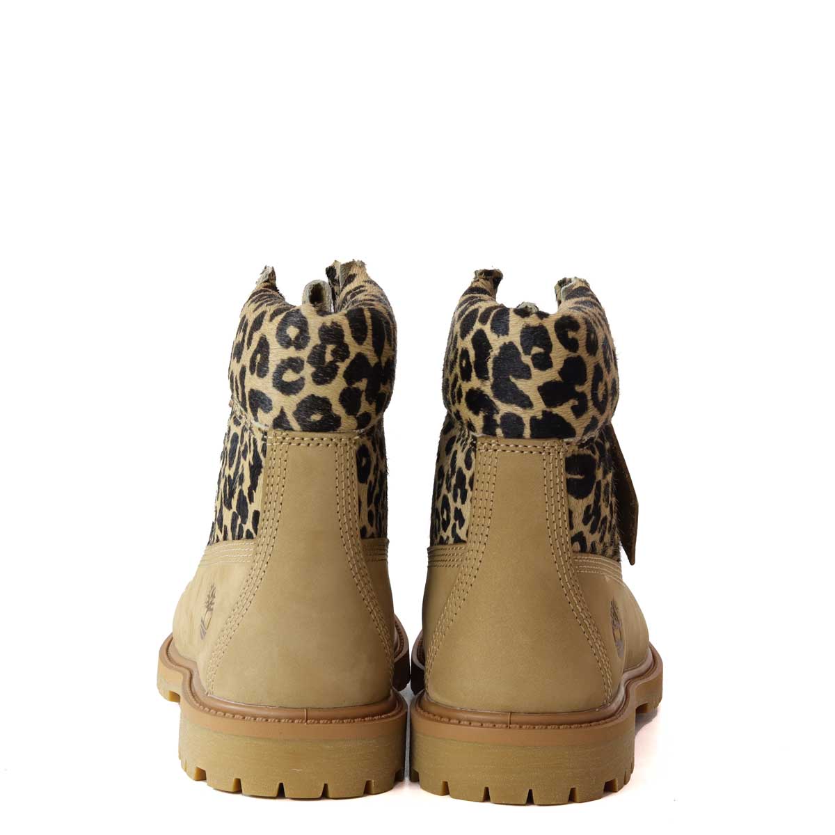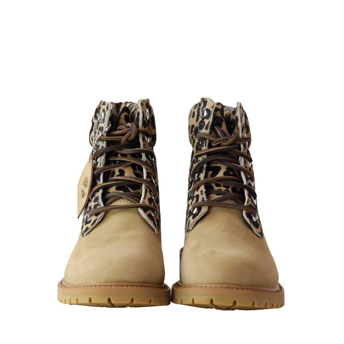 Anfibio PREMIUM 6 LACE beige di TIMBERLAND in pelle con effetto nabuk waterpoof con 6 fori altezza MID, tomaia superiore e collarino imbottito in cavallino leopardato. Fondo carrarmato in gomma.