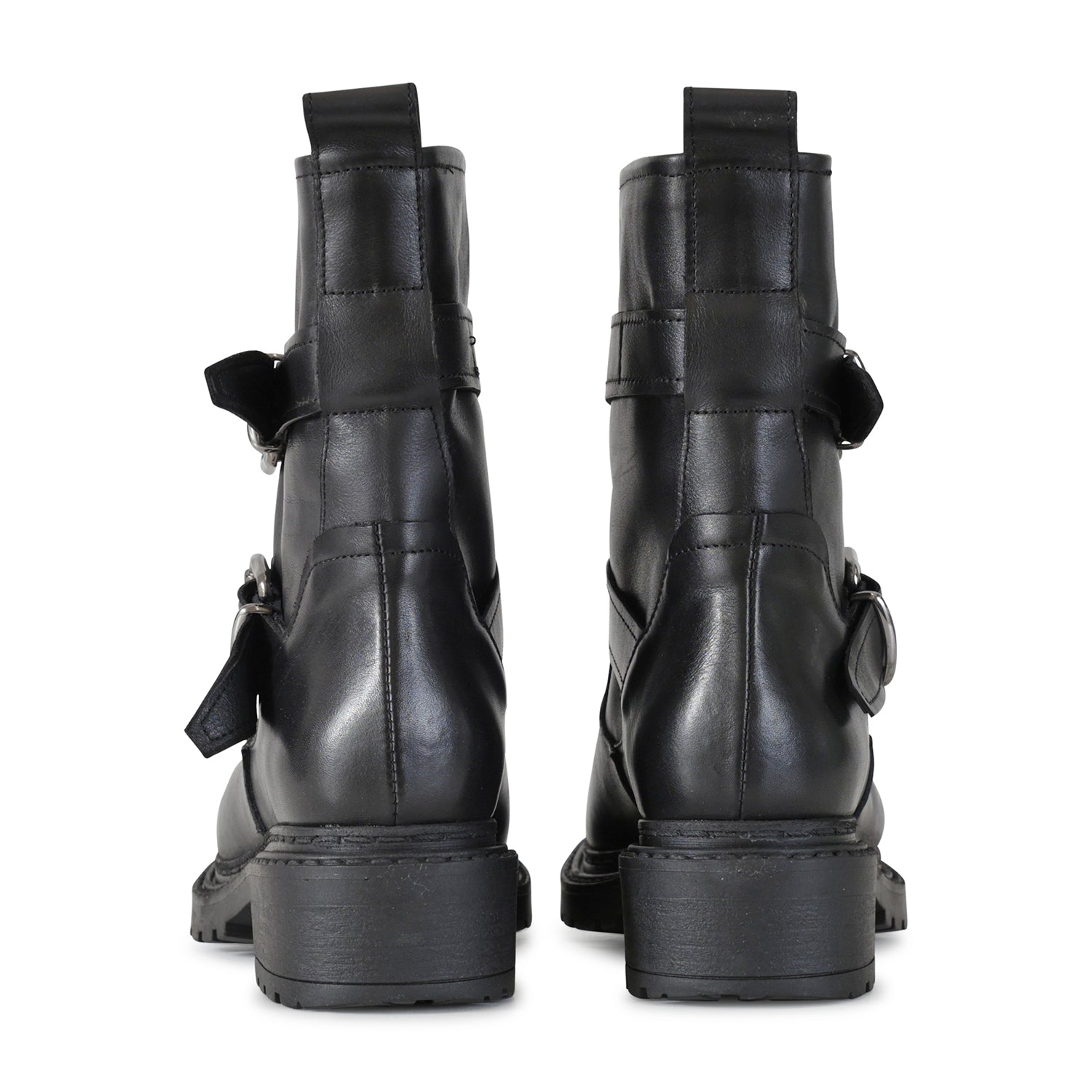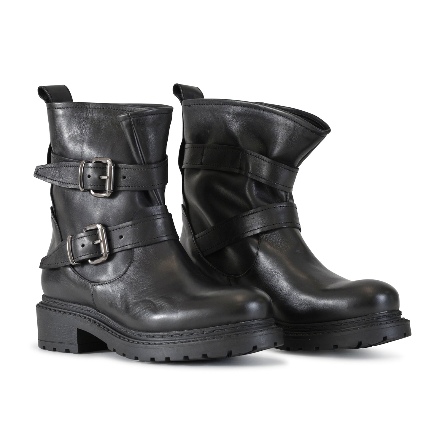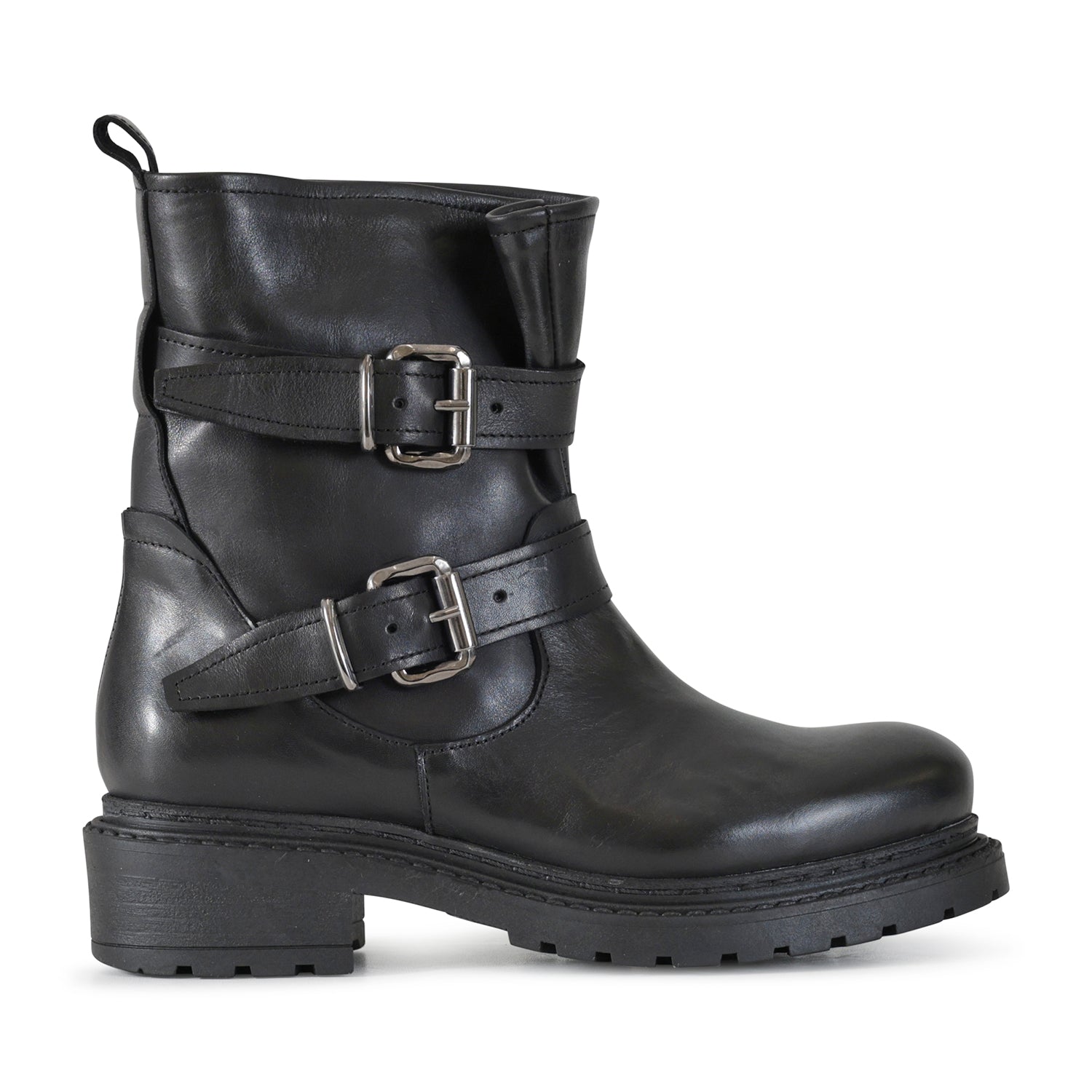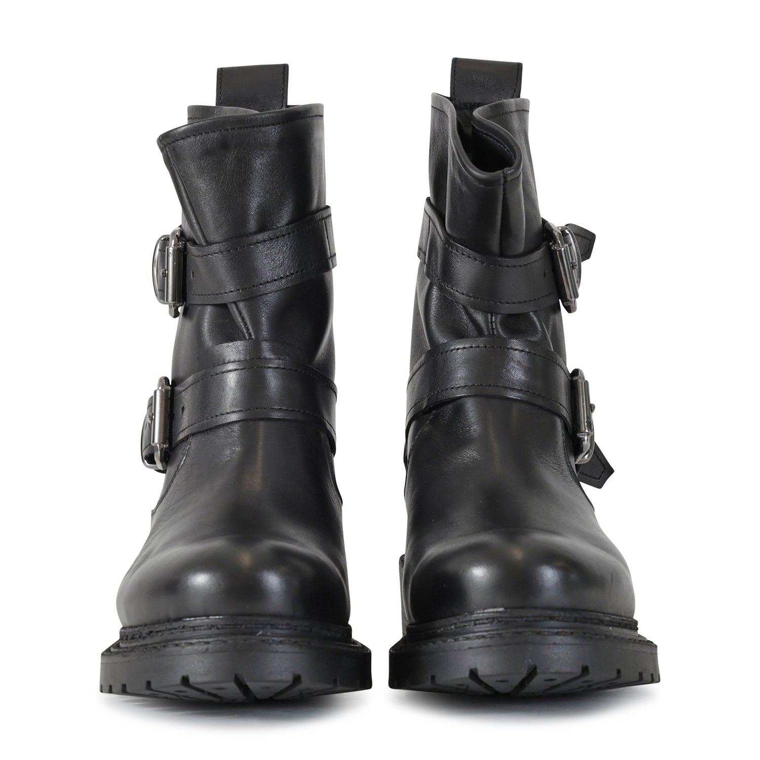 Anfibio nero di METISSE in pelle con doppia fibbia e fondo in gomma a carrarmato.