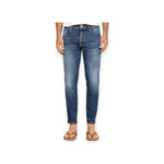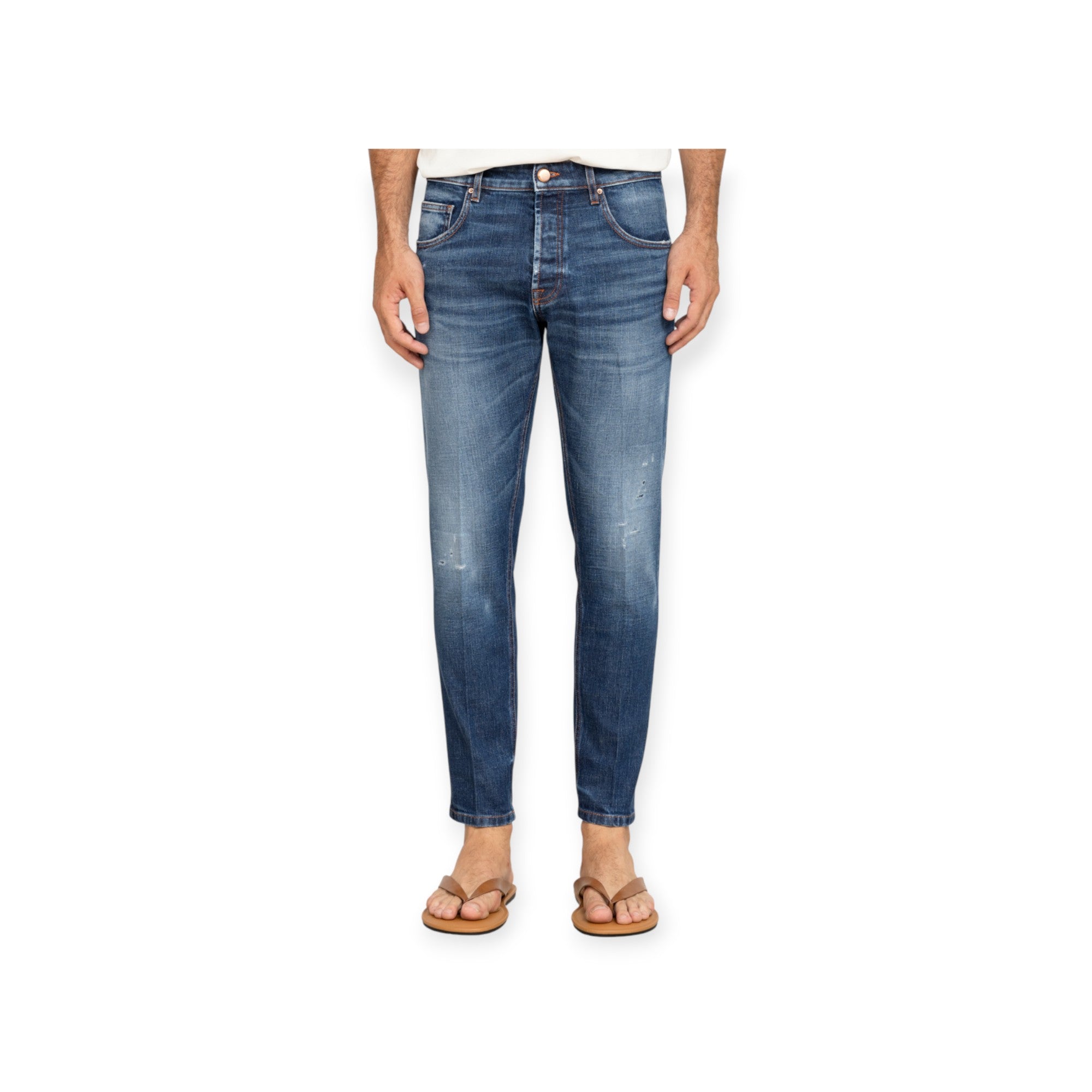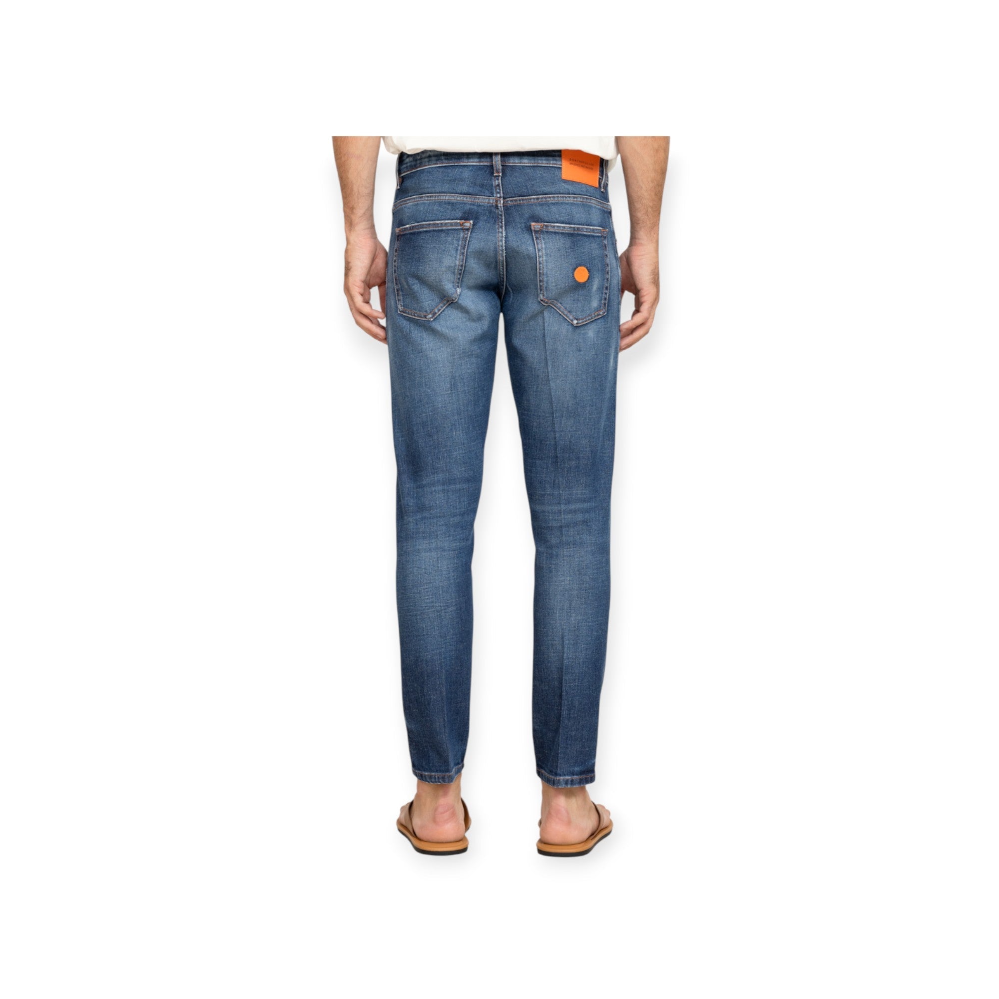 Denim medio SEOUL di DON THE FULLER in cotone con modello carrot fit, 5 tasche, logo pallino in arancio con salpa in arancio con logo lettering. Fondo 17cm.