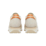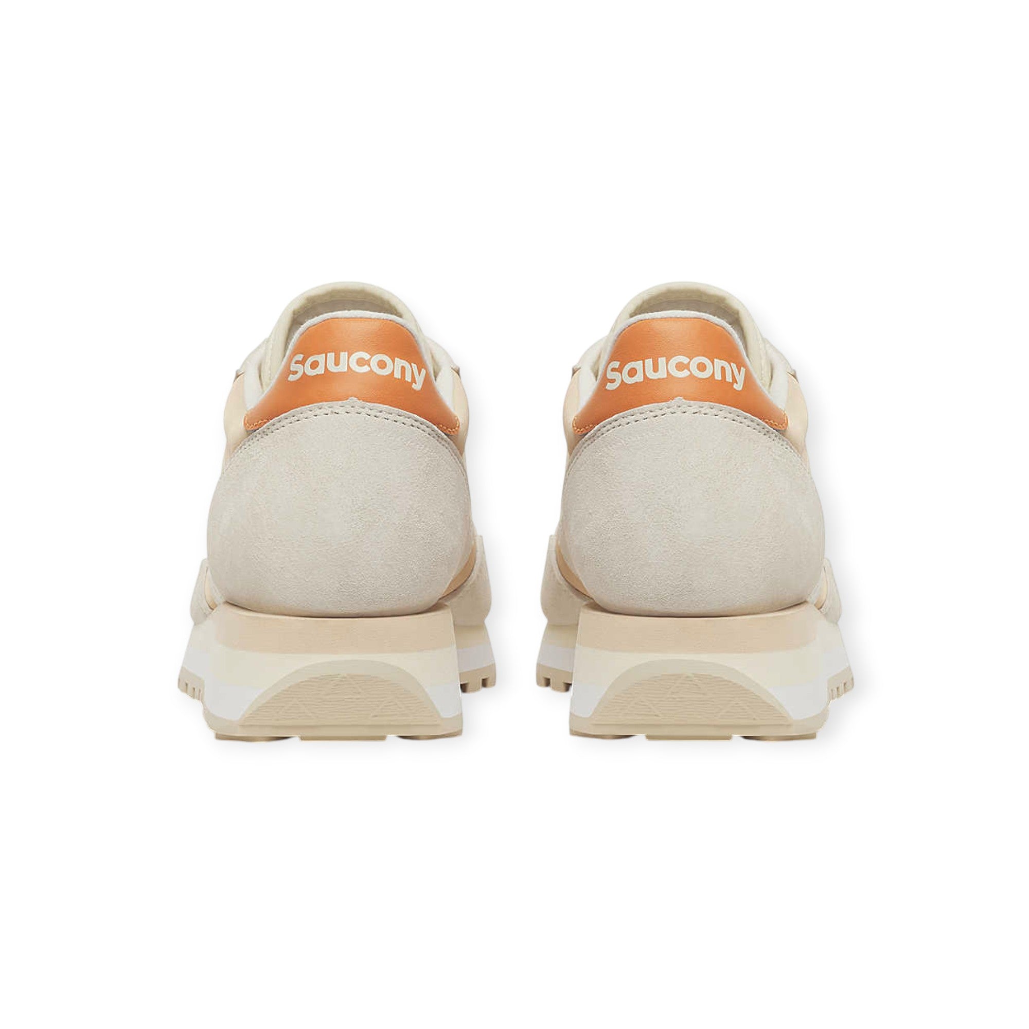 Jazz TRIPLE beige di SAUCONY in camoscio e nylon con tomaia laterale in pelle bianca e sul tallone in pelle arancio. Fondo tricolore in gomma.
