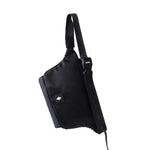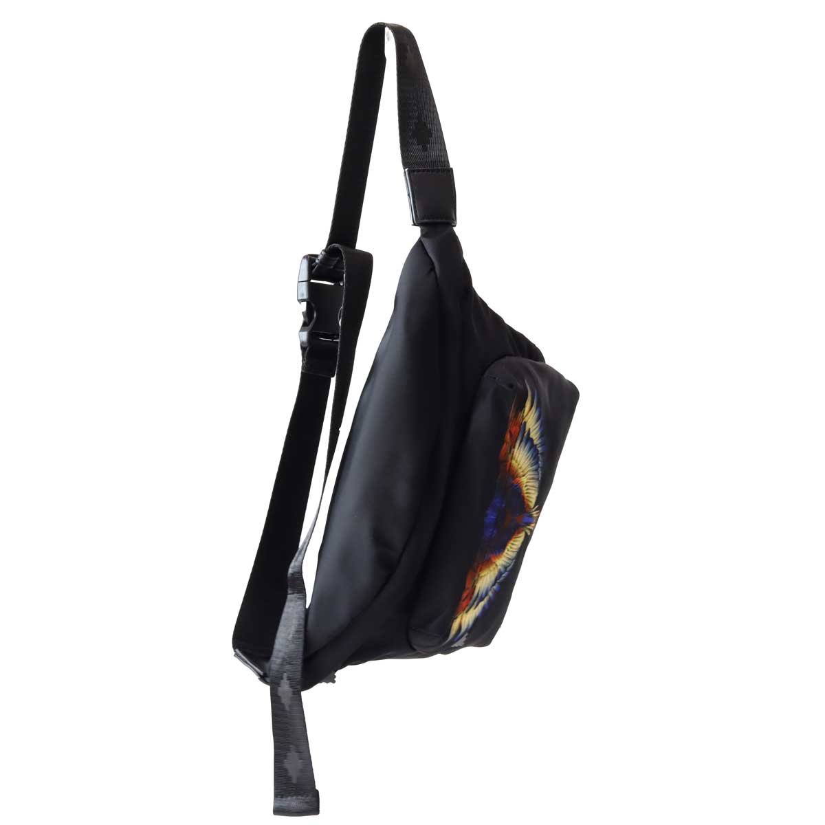 Marsupio nero di COUNTY OF MILAN MARCELO BURLON in nylon con chiusura con zip, tracolla in tessuto, scomparto aggiuntivo e stampa ali multicolor con gradazione gialla. Misure 30x17x13 cm.