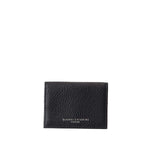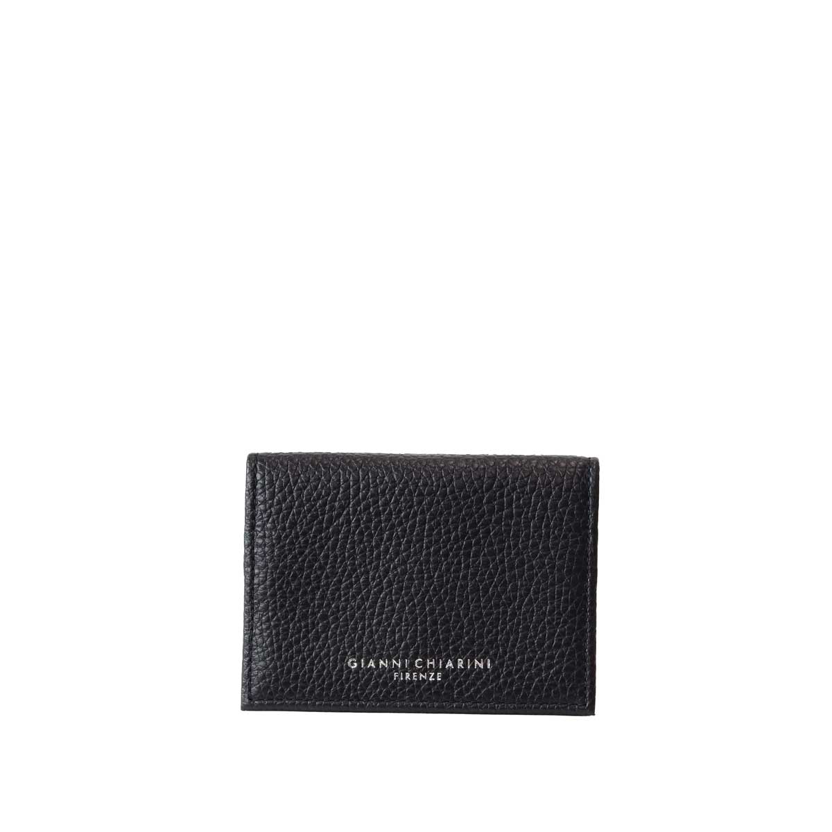 Portacarte nero di GIANNI CHARINI in pelle con effetto martellato, chiusura con bottone, logo a fuoco in color argento. Misure 11x8x1 cm.