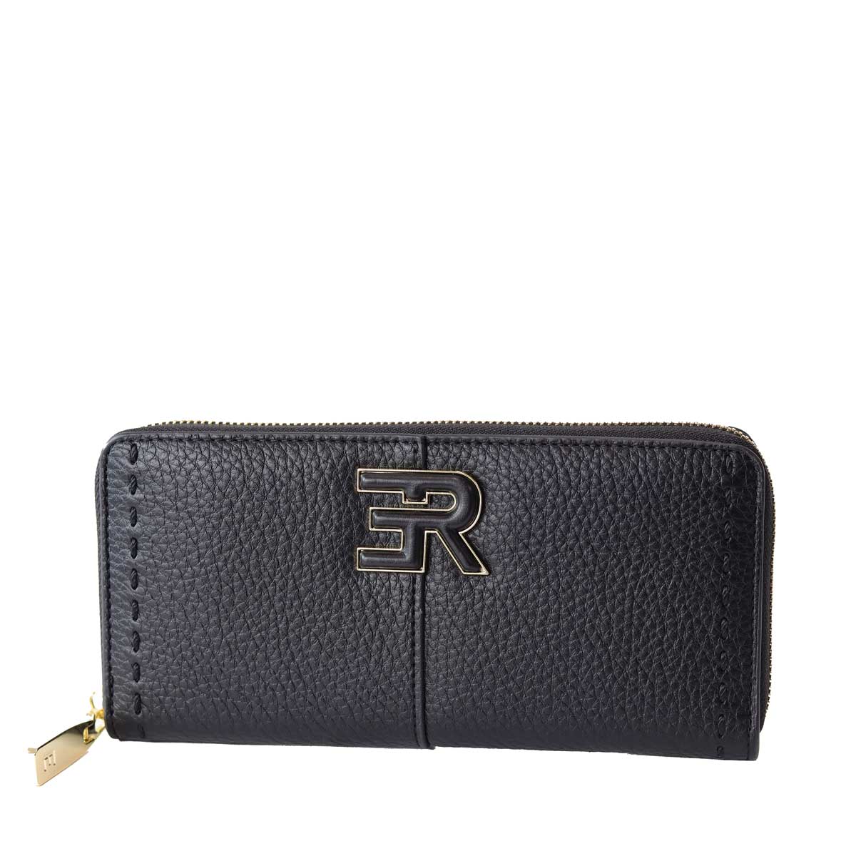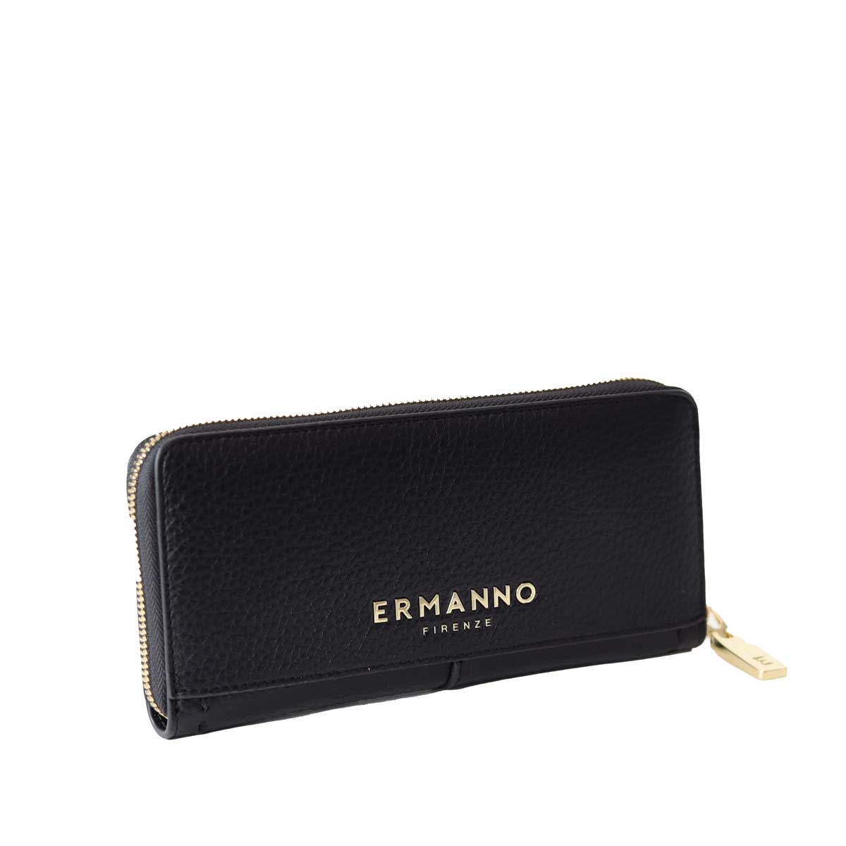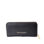 Portafogli EBA nero di ERMANNO SCERVINO in ecopelle con effetto bottalato, zip around in metallo oro, logo in nero e logo posteriore in metallo oro. Misure 20x10x3 cm.
