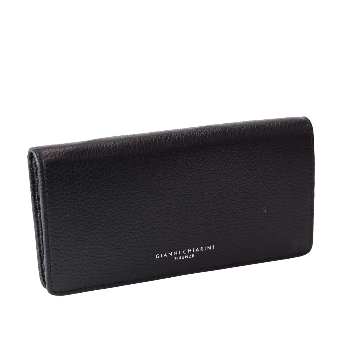 Portafogli nero di GIANNI CHIARINI in pelle con effetto bottalato, chiusura con gancio e patta, scomparto per monete con zip. Misure 19x10x3 cm.