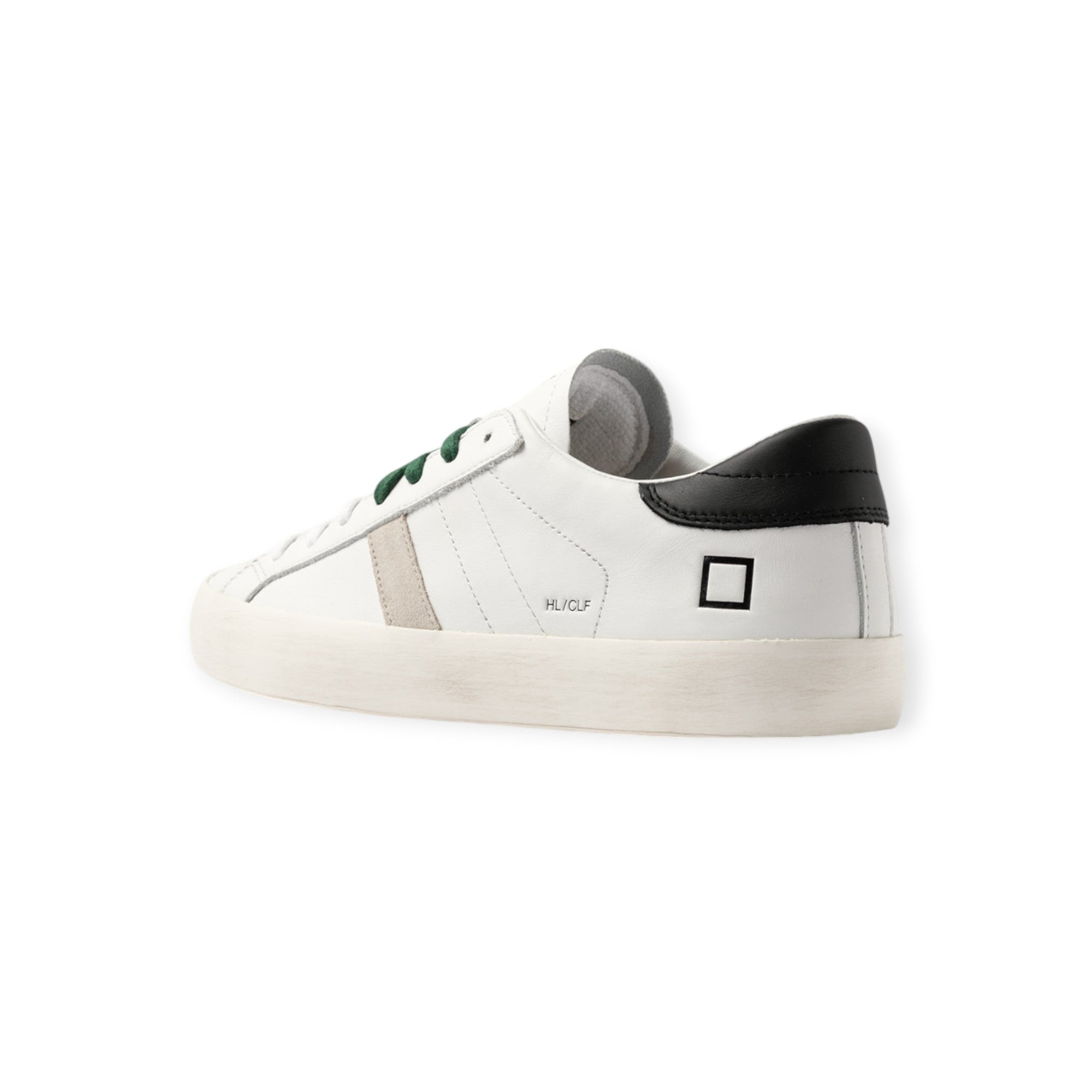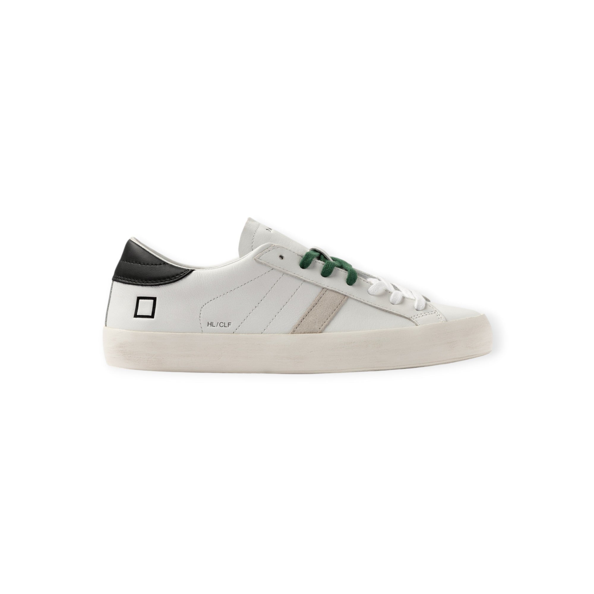Sneakers HILL LOW bianca di DATE in pelle con banda laterale in camoscio grigio, talloncino posteriore in pelle nera, doppio laccio in cotone. Fondo in gomma.