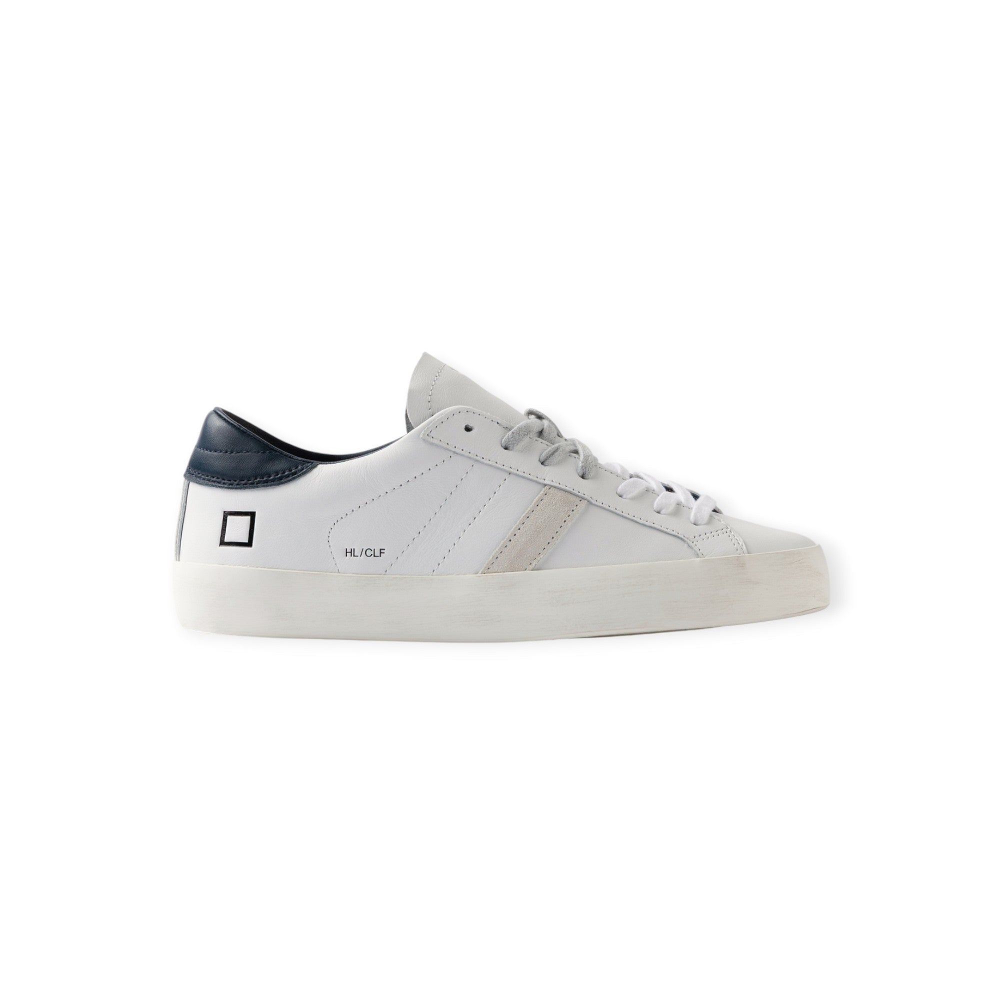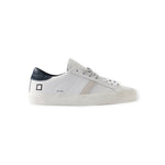Sneakers HILL LOW bianca di DATE in pelle con banda laterale in camoscio grigio, talloncino posteriore in pelle blu, doppio laccio in cotone. Fondo in gomma.