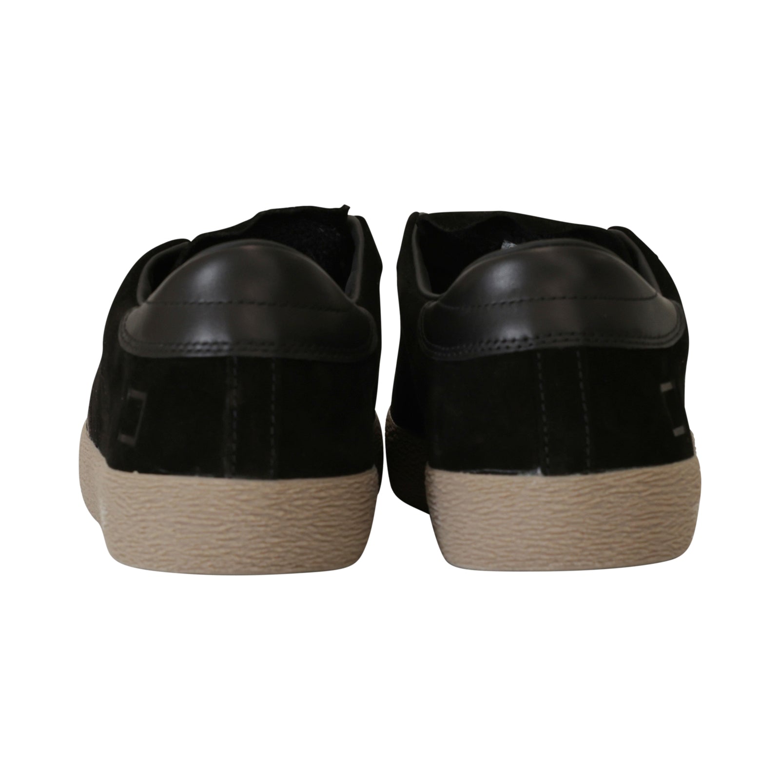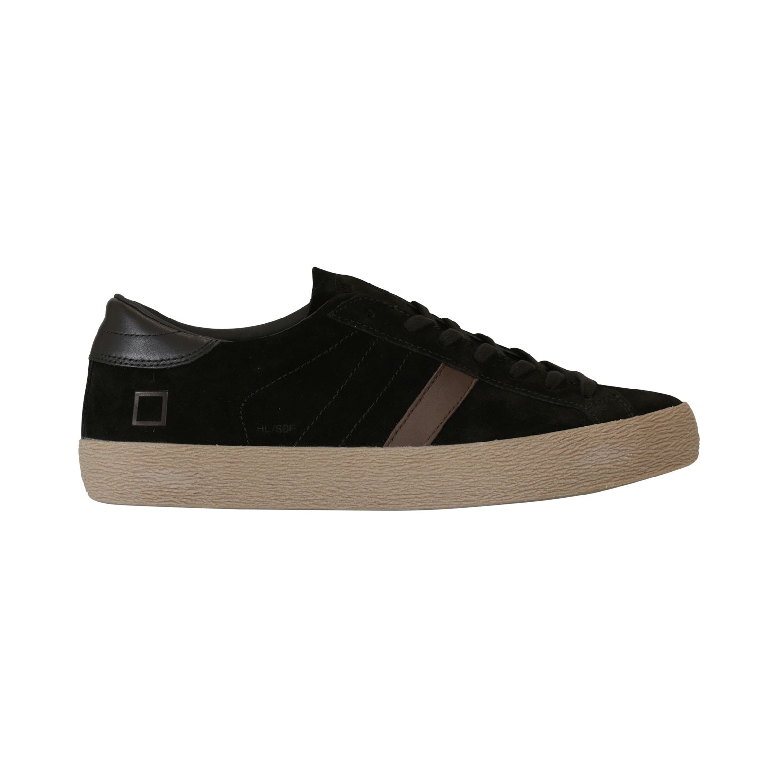 Sneakers HILL LOW nera di DATE in camoscio con tallone in pelle nera, profilo laterale in pelle marrone, fondo in gomma marrone.