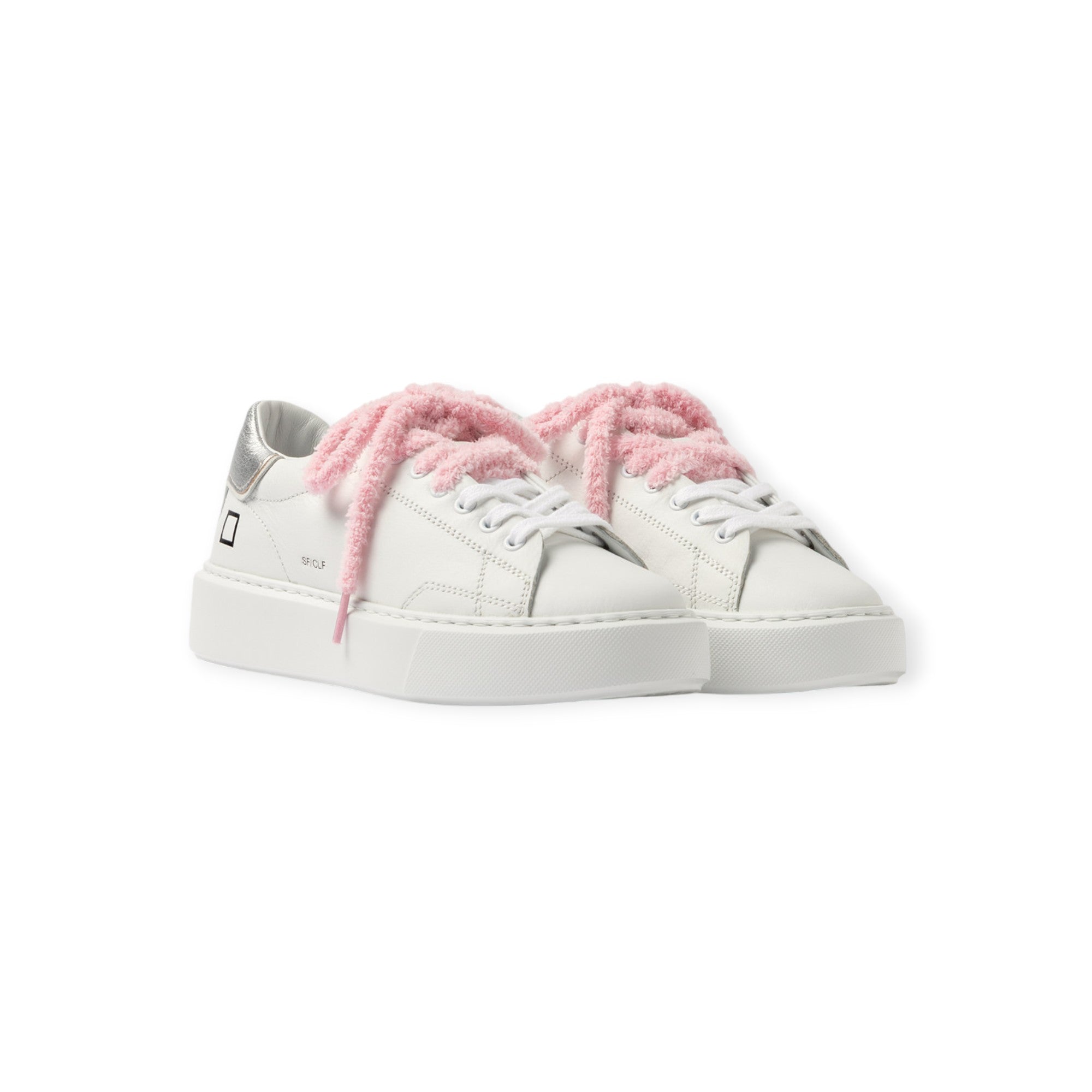 Sneakers SFERA bianca di DATE in pelle con talloncino in pelle laminata argento, lacci in cotone e spugna, logo quadrato in nero. Fondo extralight in gomma 3,5cm.