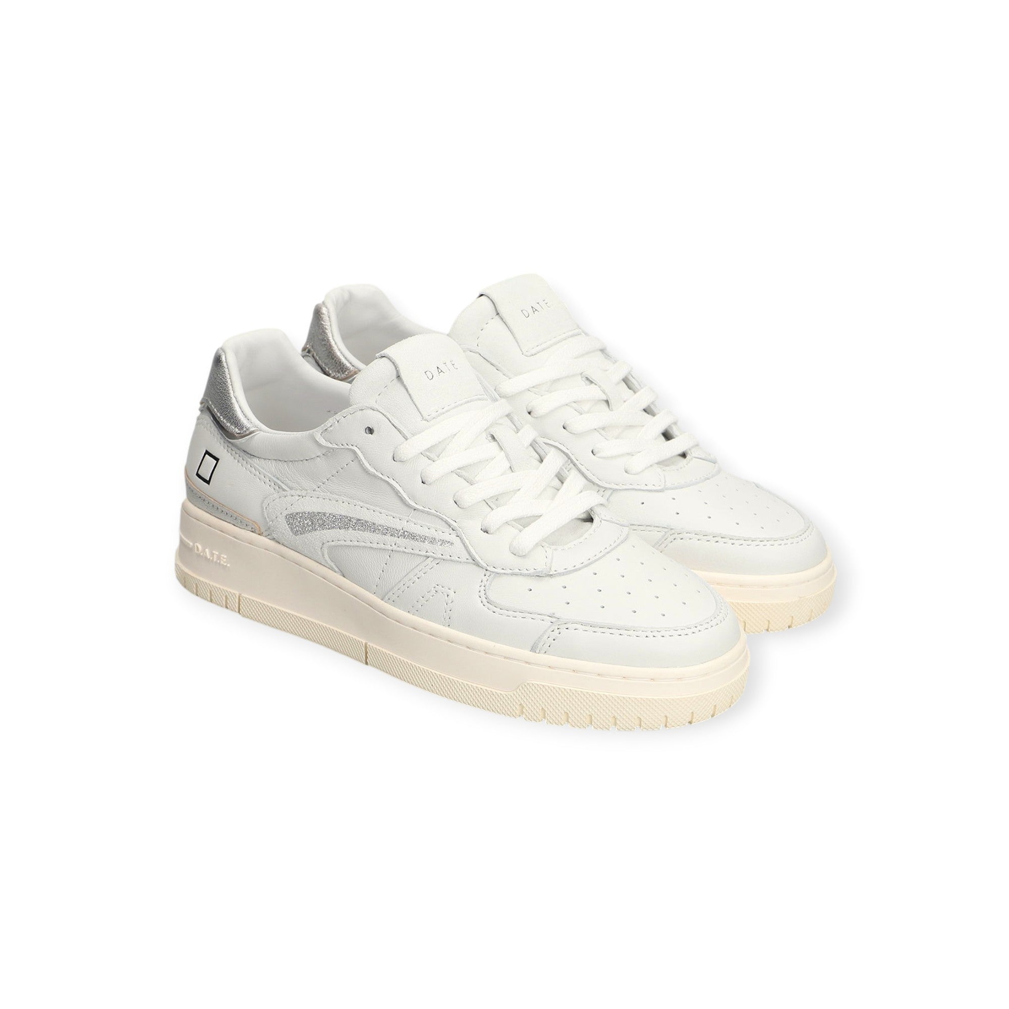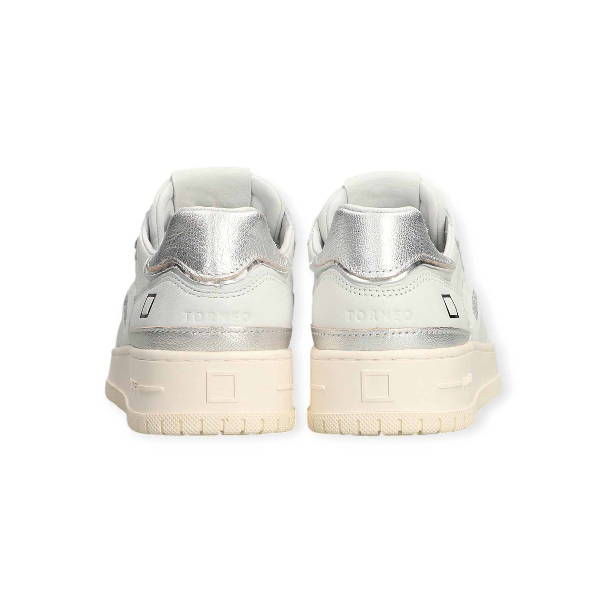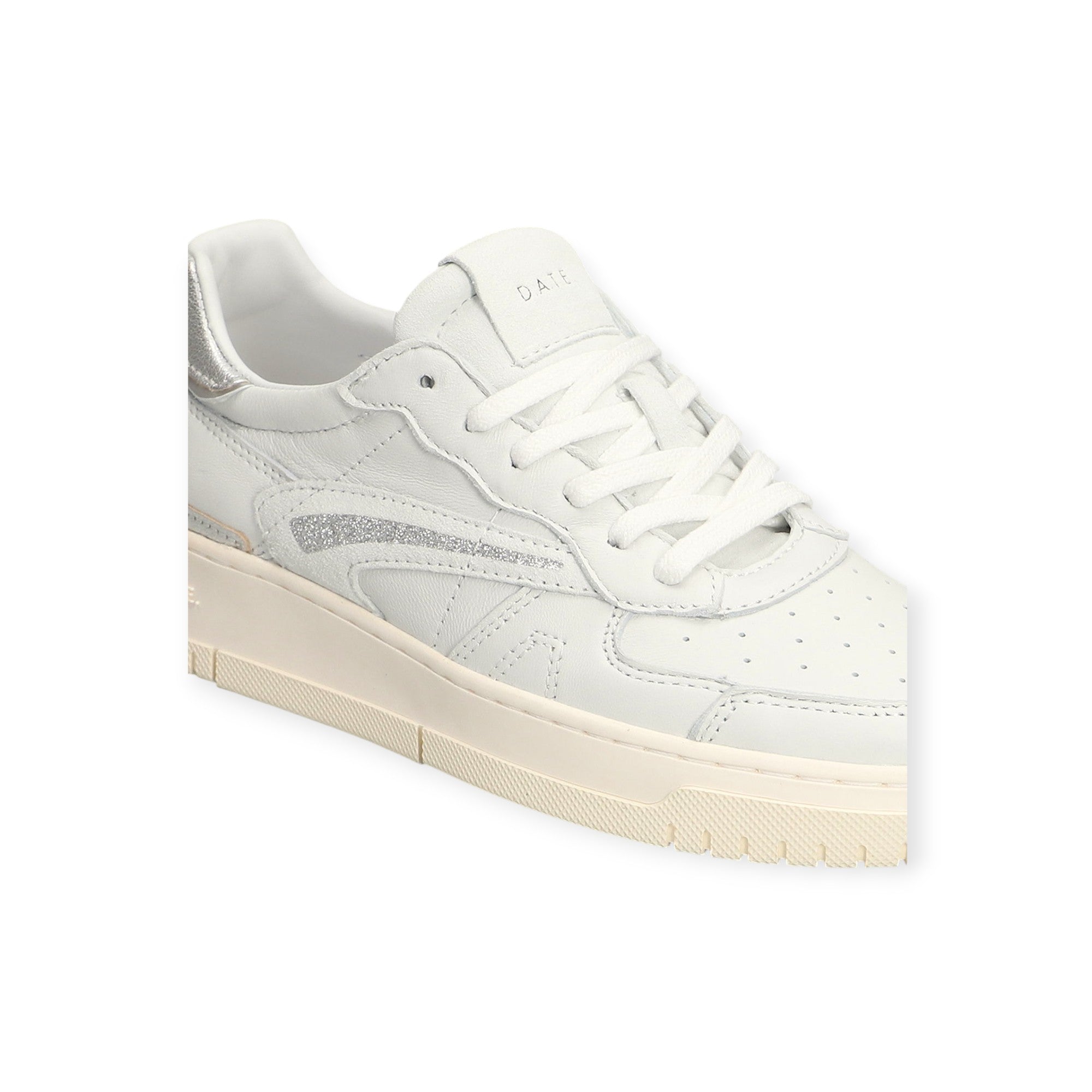 Sneakers TORNEO bianca di DATE in pelle con punta traforata, spoiler laterale in glitter argento, talloncino in pelle laminata argento. Fondo in gomma.