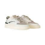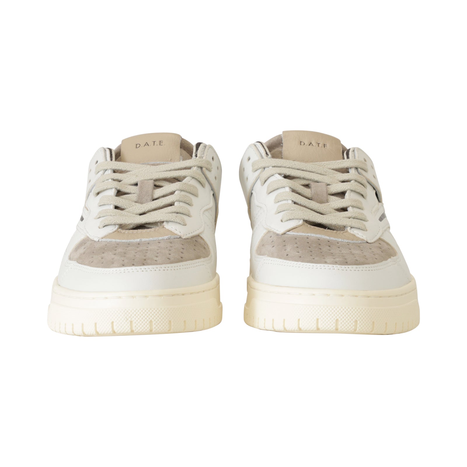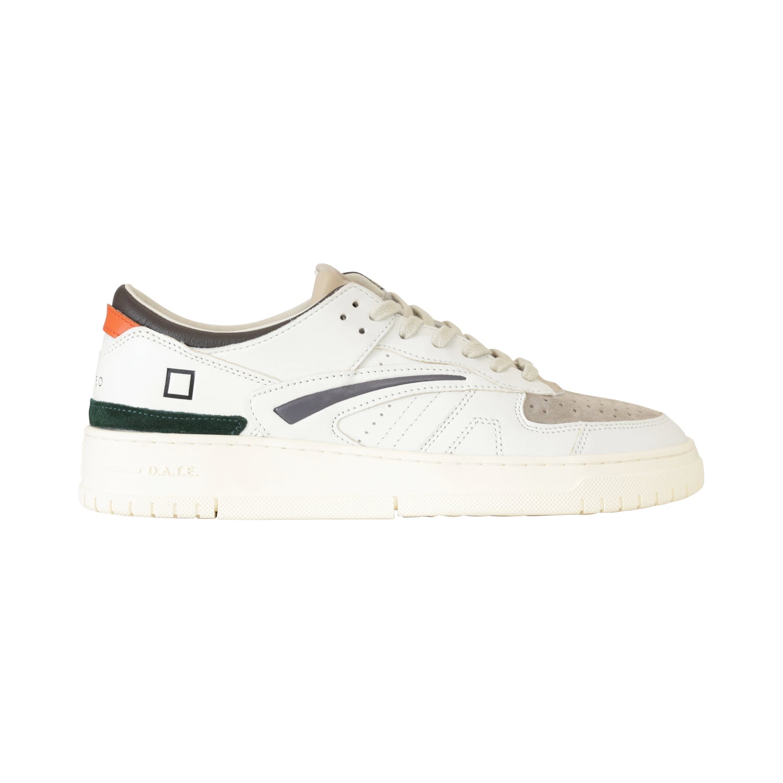 Sneakers TORNEO bianca di DATE in pelle con tomaia anteriore microforata in camoscio beige, collarino in pelle nera, profili in camoscio grigio e nero e fondo in gomma.
