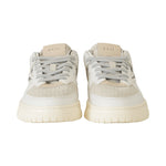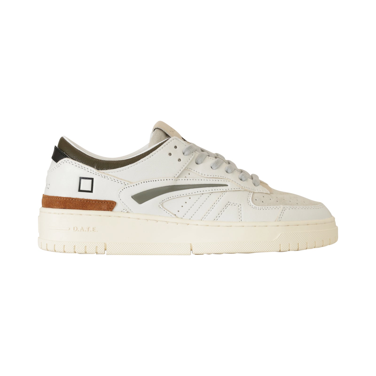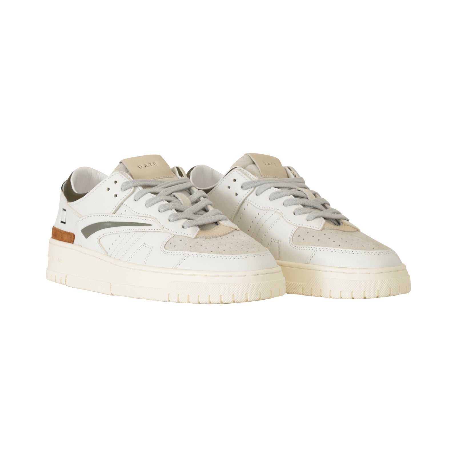 Sneakers TORNEO bianca di DATE in pelle con tomaia anteriore microforata in camoscio beige, collarino in pelle militare , profili in camoscio cuoio e grigio e fondo in gomma.
