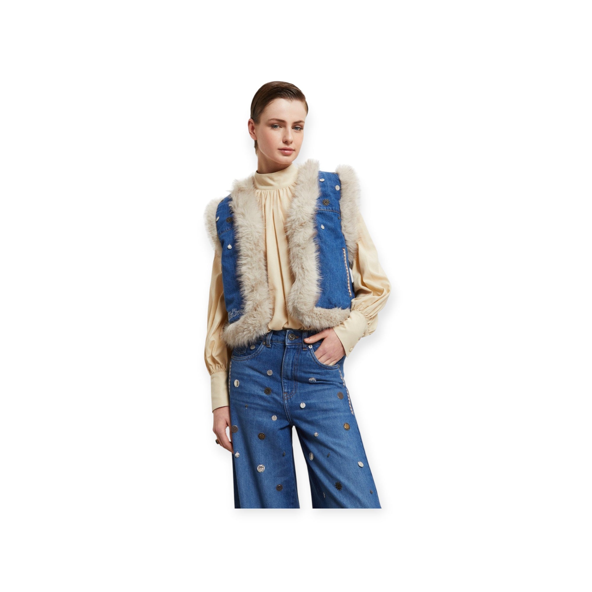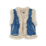 Gilet denim di OTTOD'AME in cotone con dettagli in ecopelliccia, ricami e applicazioni. Interno in ecopelliccia.