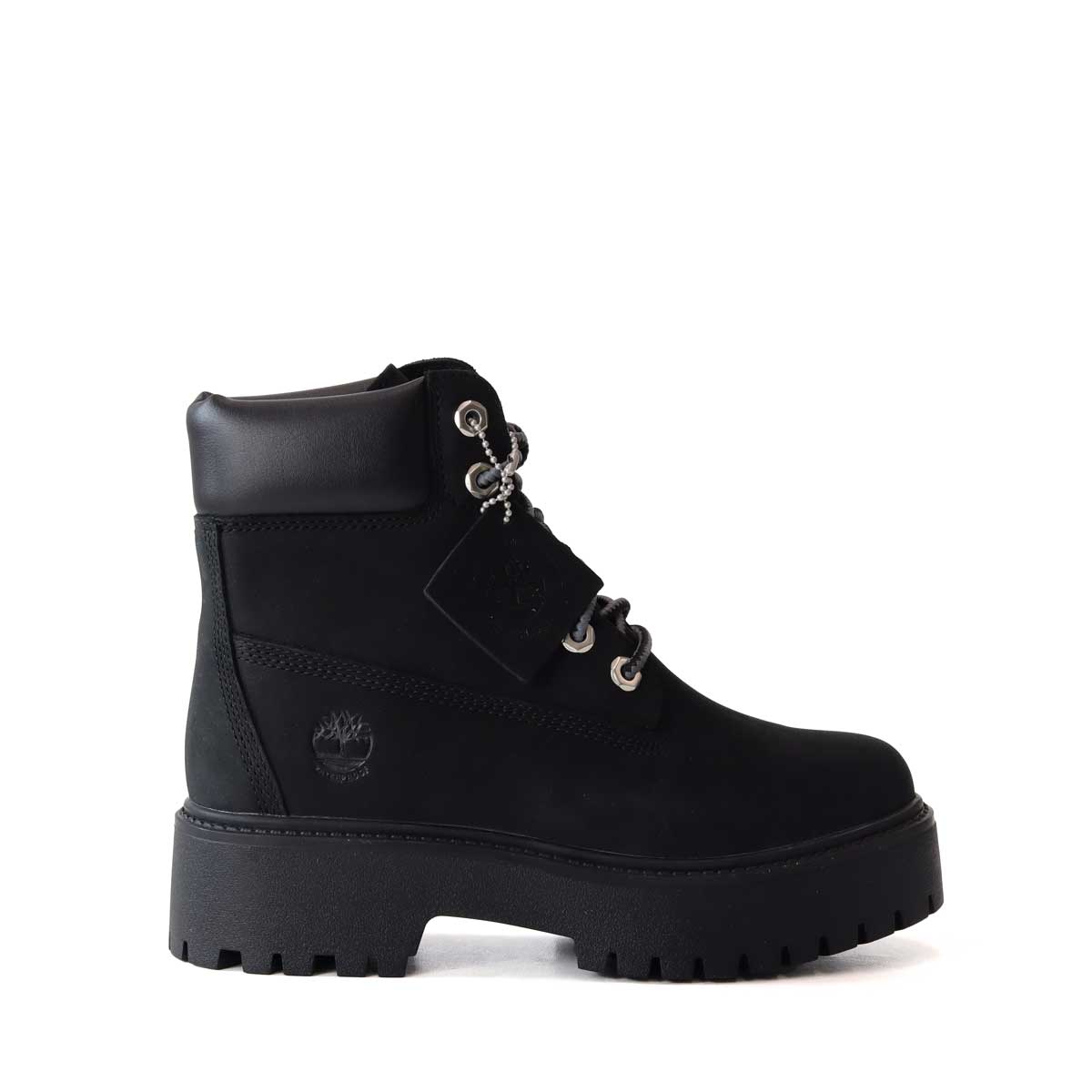 Anfibio STONE STREET 6 LACE nero di TIMBERLAND in pelle con effetto nabuk waterpoof con 6 fori altezza MID e collarino in pelle imbottita nera. Fondo carrarmato in gomma alto 45mm.
