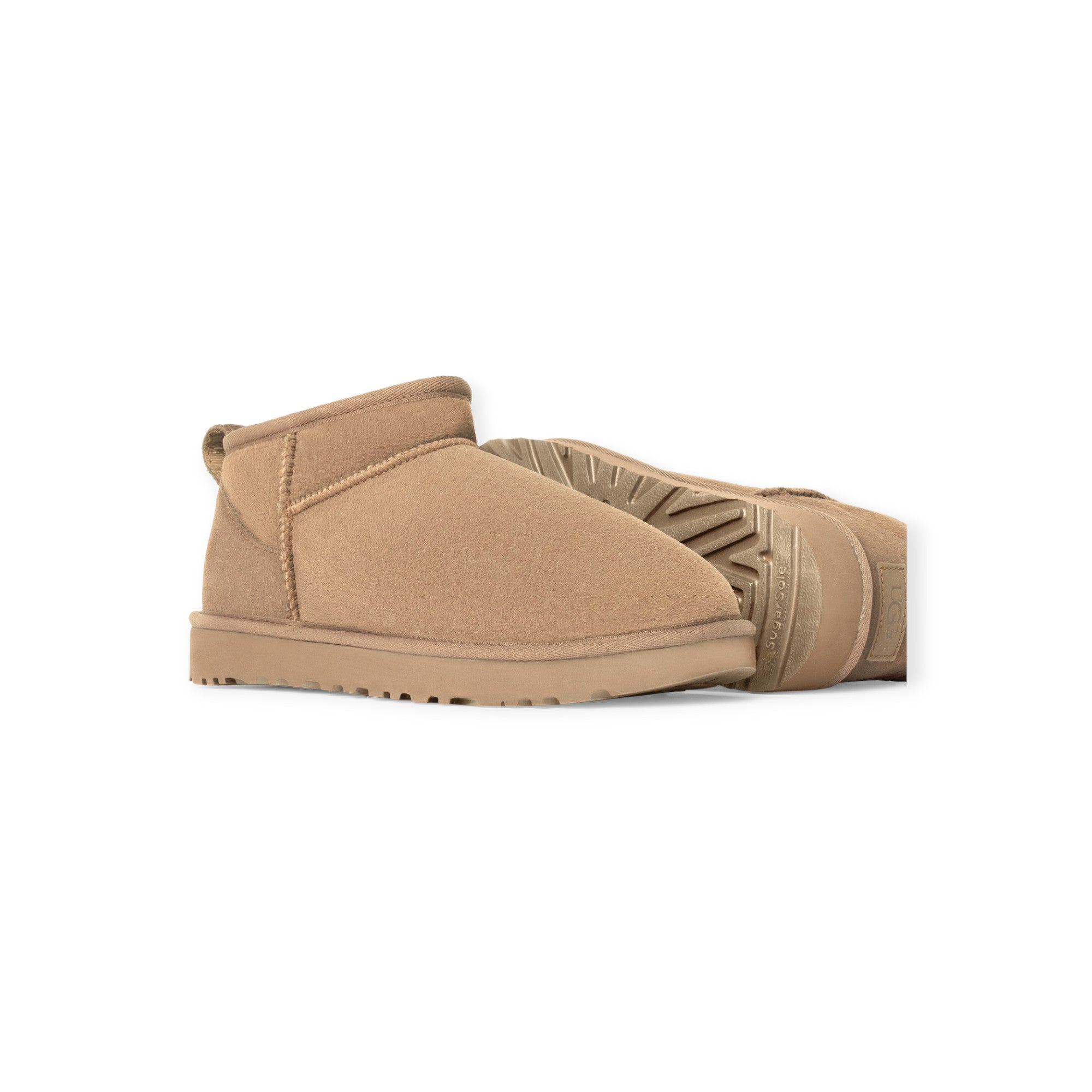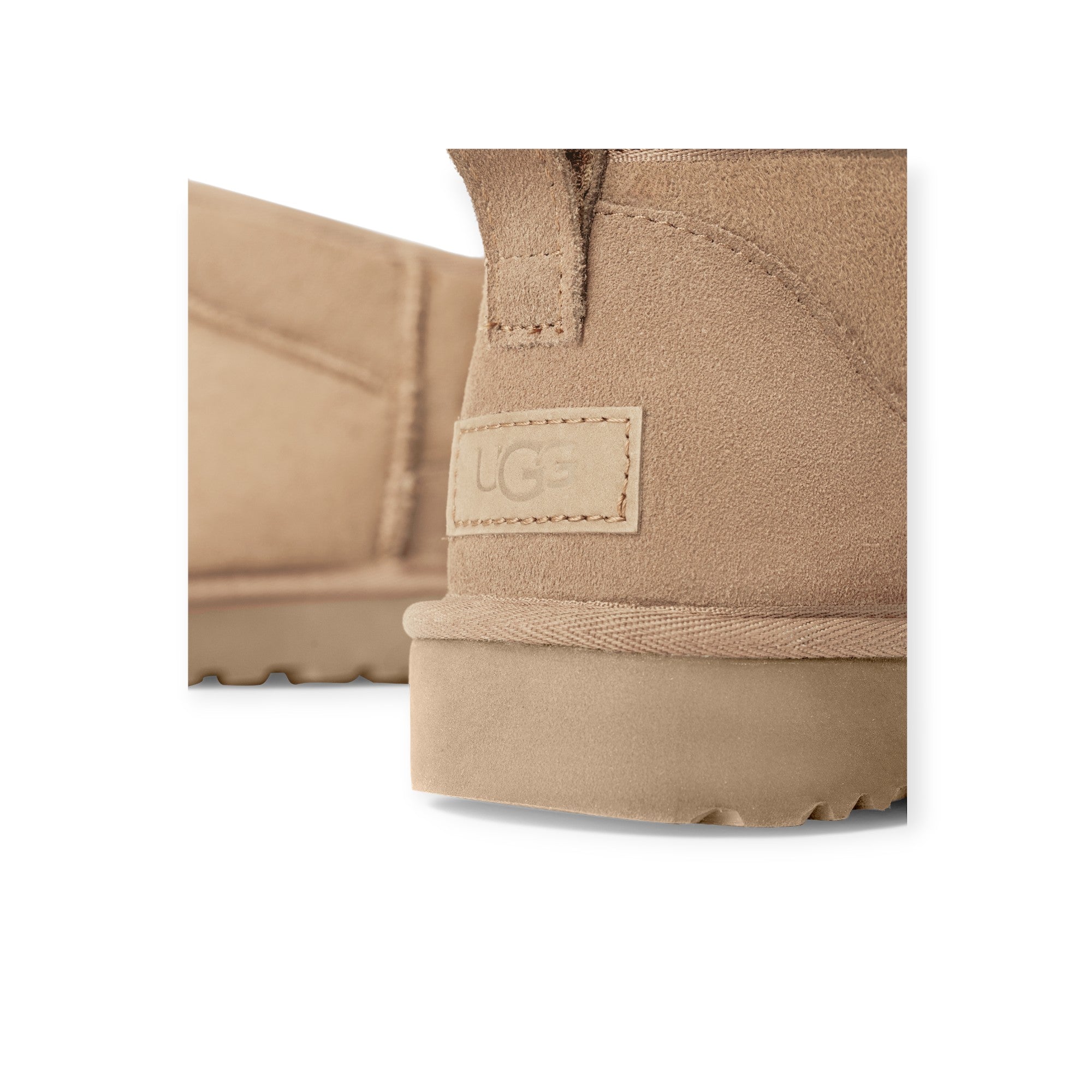 Ultra mini beige di UGG in camoscio con interno in montone, cuciture in tinta e fondo in gomma in tinta.