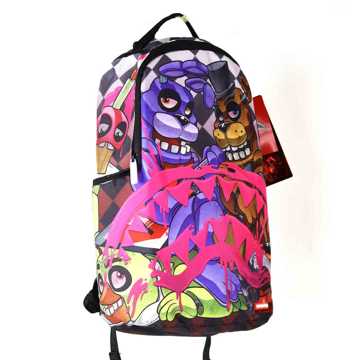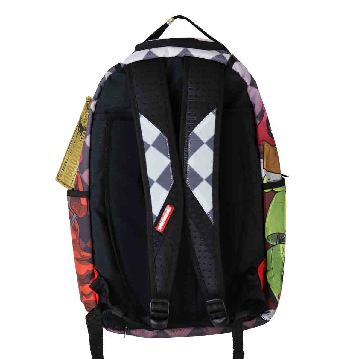Zaino Bulldog multicolor di SPRAYGROUND in ecopelle con stampa multicolore e shark rosa. apertura con zip superiore. Misure 32x45x18cm.