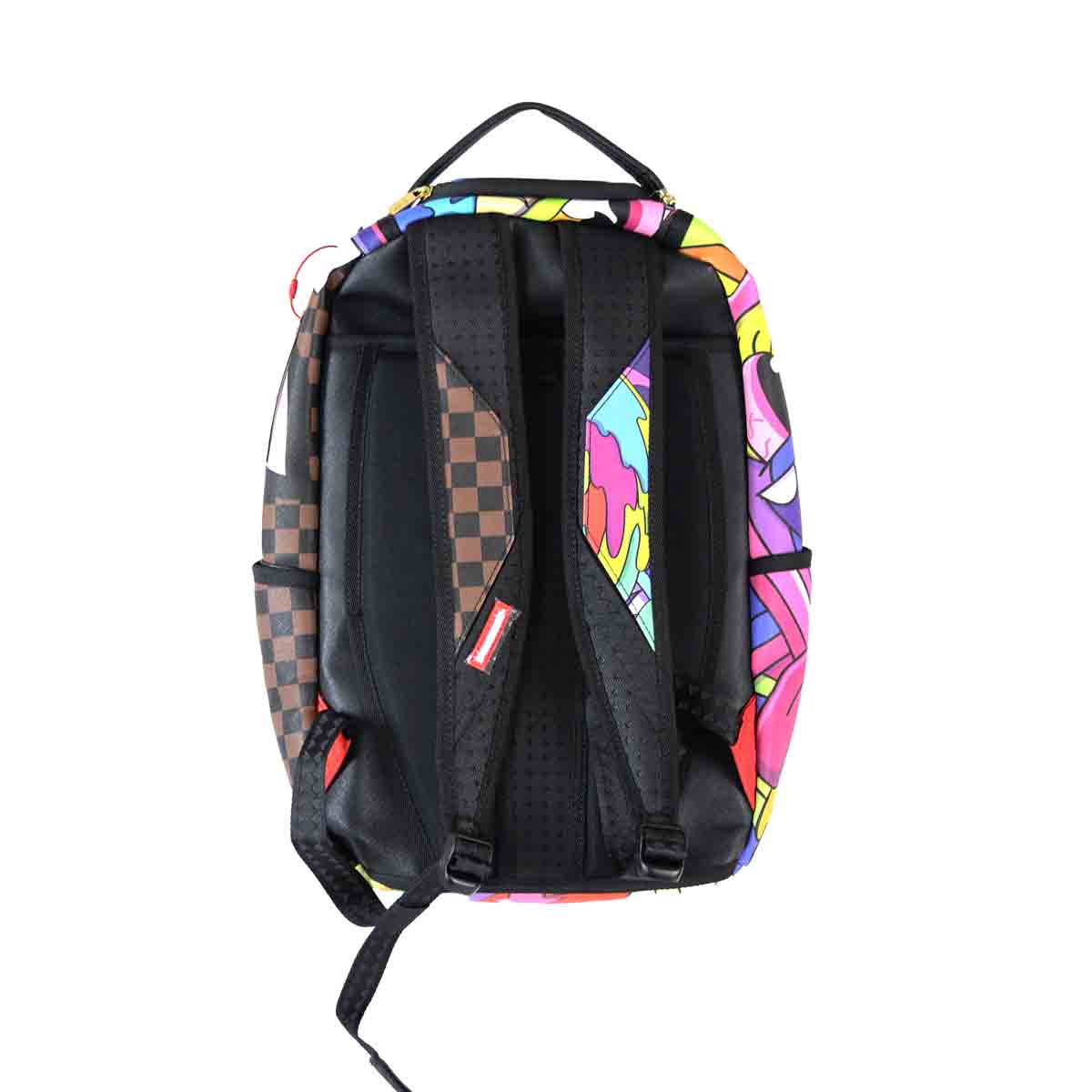 Zaino Heart Pop multicolor di SPRAYGROUND in ecopelle con stampa pop multicolore e fondo check marrone e nero, shark con dettagli pop e apertura con zip superiore. Misure 32x45x18cm.