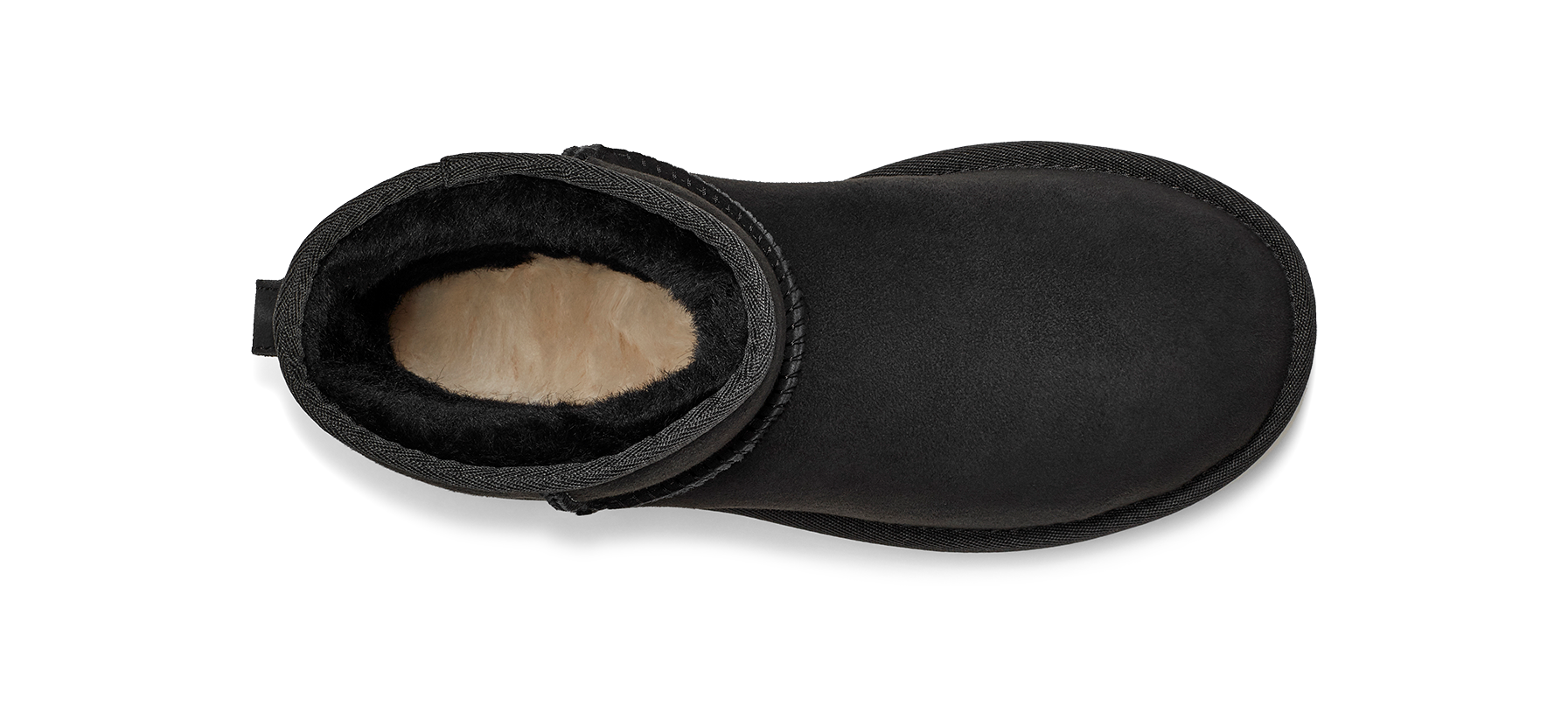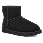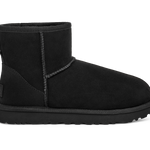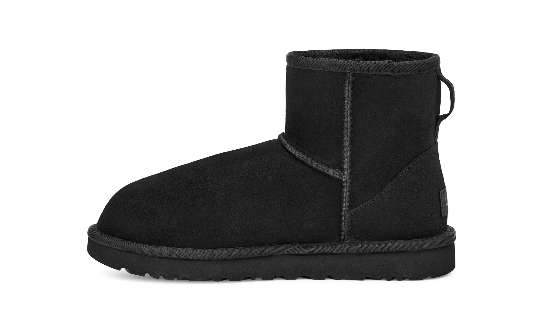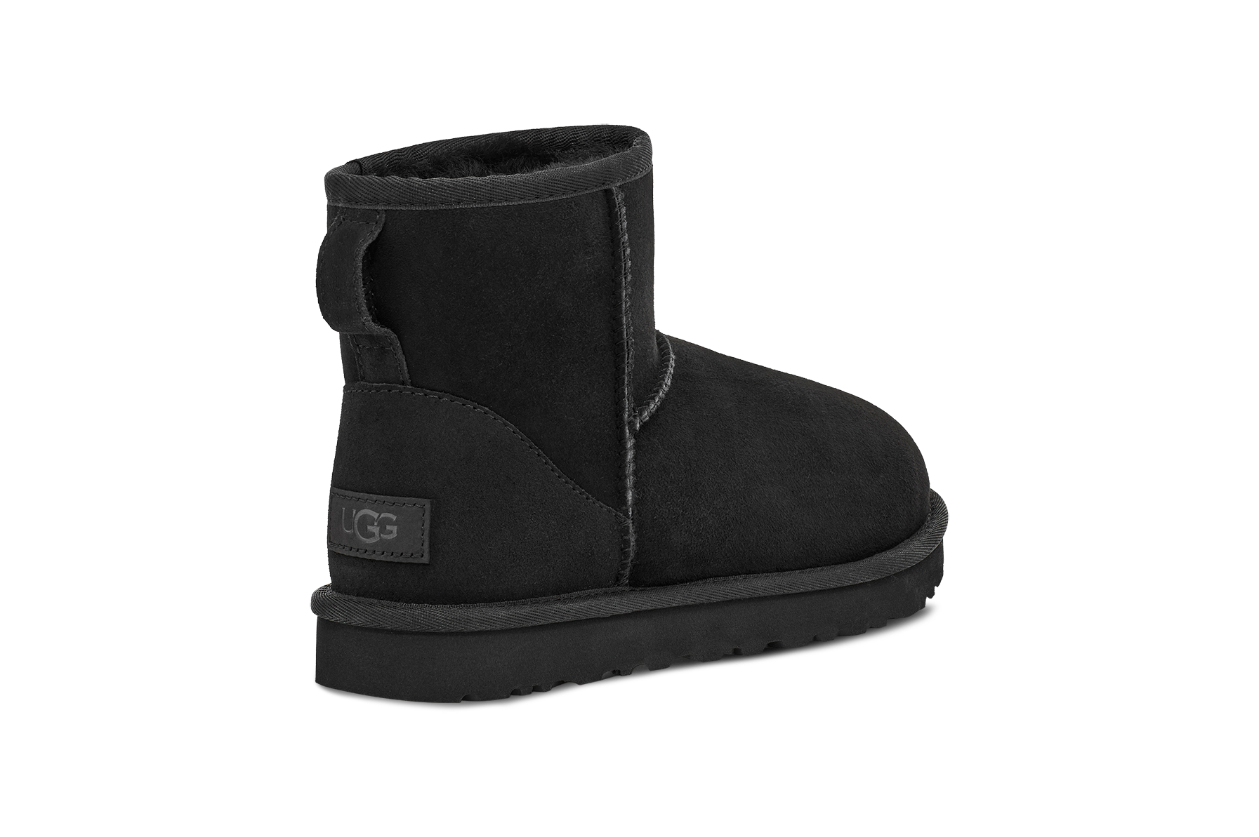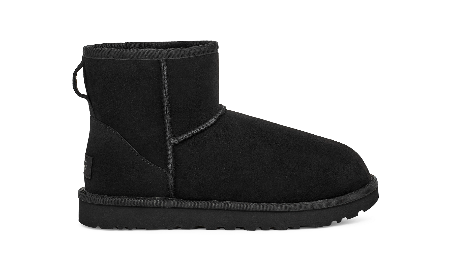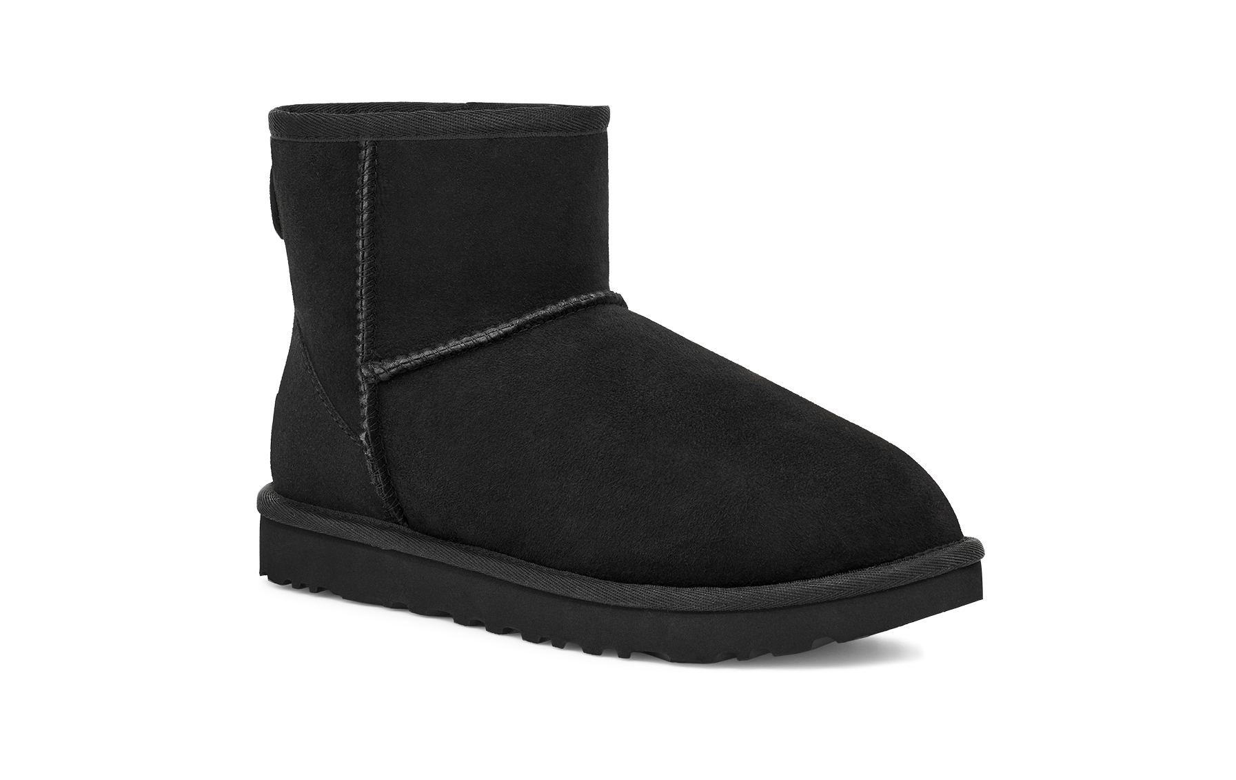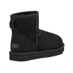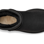 CLASSIC MINI nero di UGG in camoscio con interno in montone, cuciture in tinta e fondo in gomma in tinta.