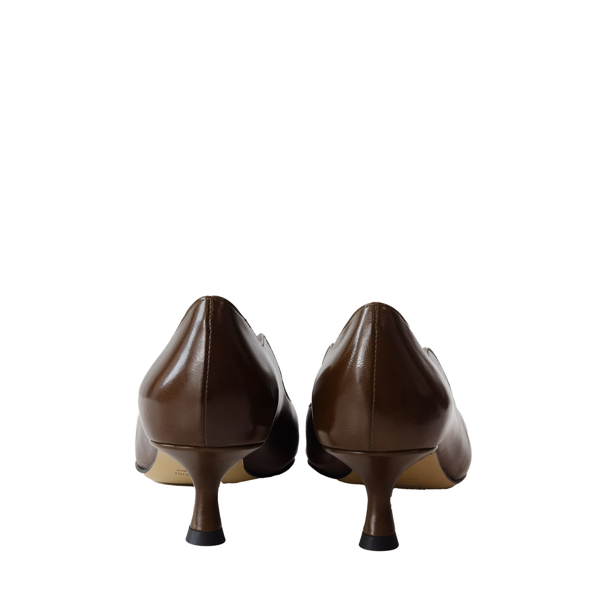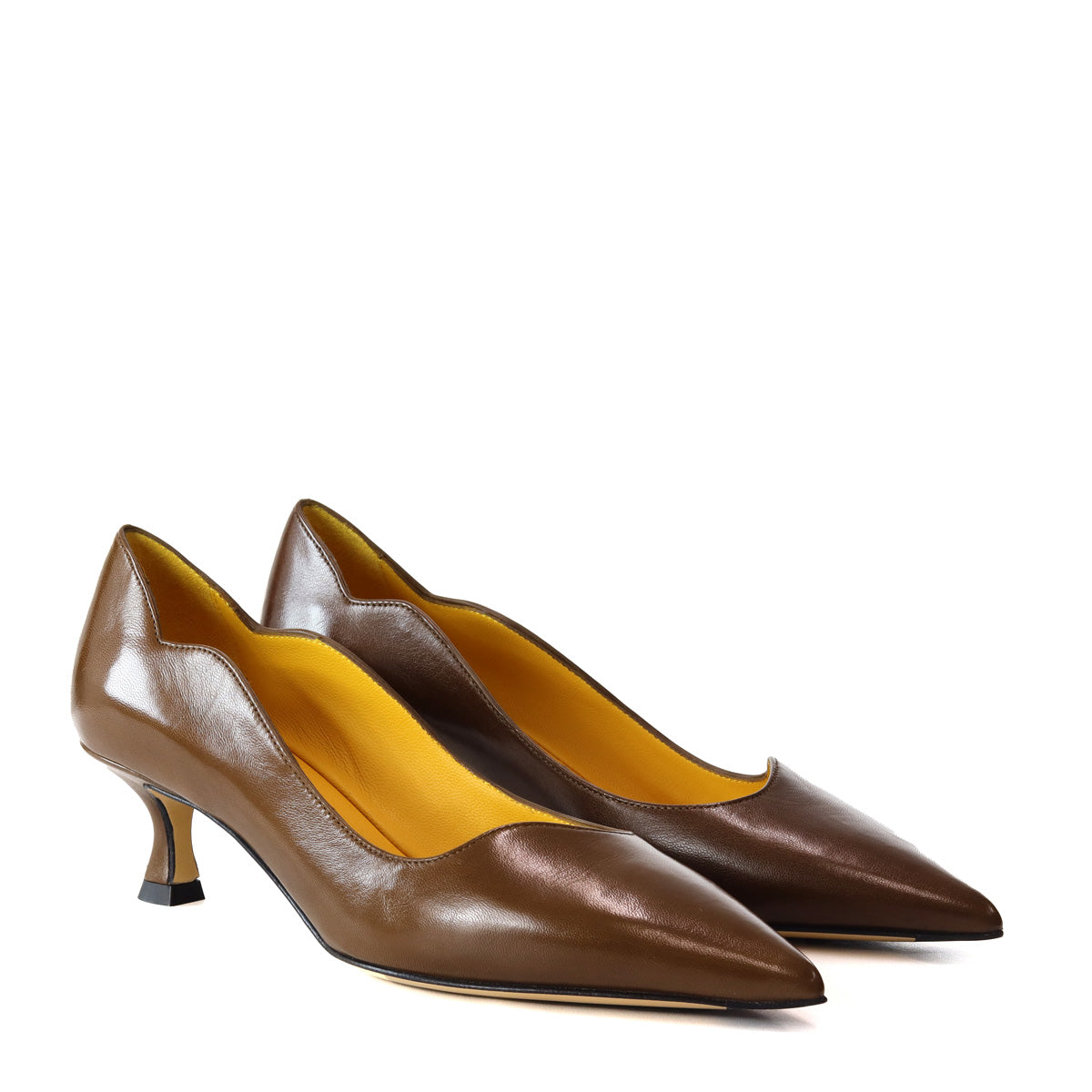 Decollette NOAMI biscotto di MARA BINI in pelle seta con tomaia tagliata in modo ondulato, forma appuntita e tacco a rocchetta 50mm. Fondo in cuoio con mezza gomma iniettata.