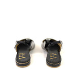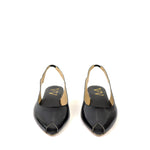 Slingback nera di VINCENT VEGA in pelle verniciata. Il suo design è caratterizzato da una punta leggermente affusolata aperta, una fascia posteriore con cinturino elastico e un tacco basso di 10 mm che garantisce comodità senza rinunciare all'eleganza.