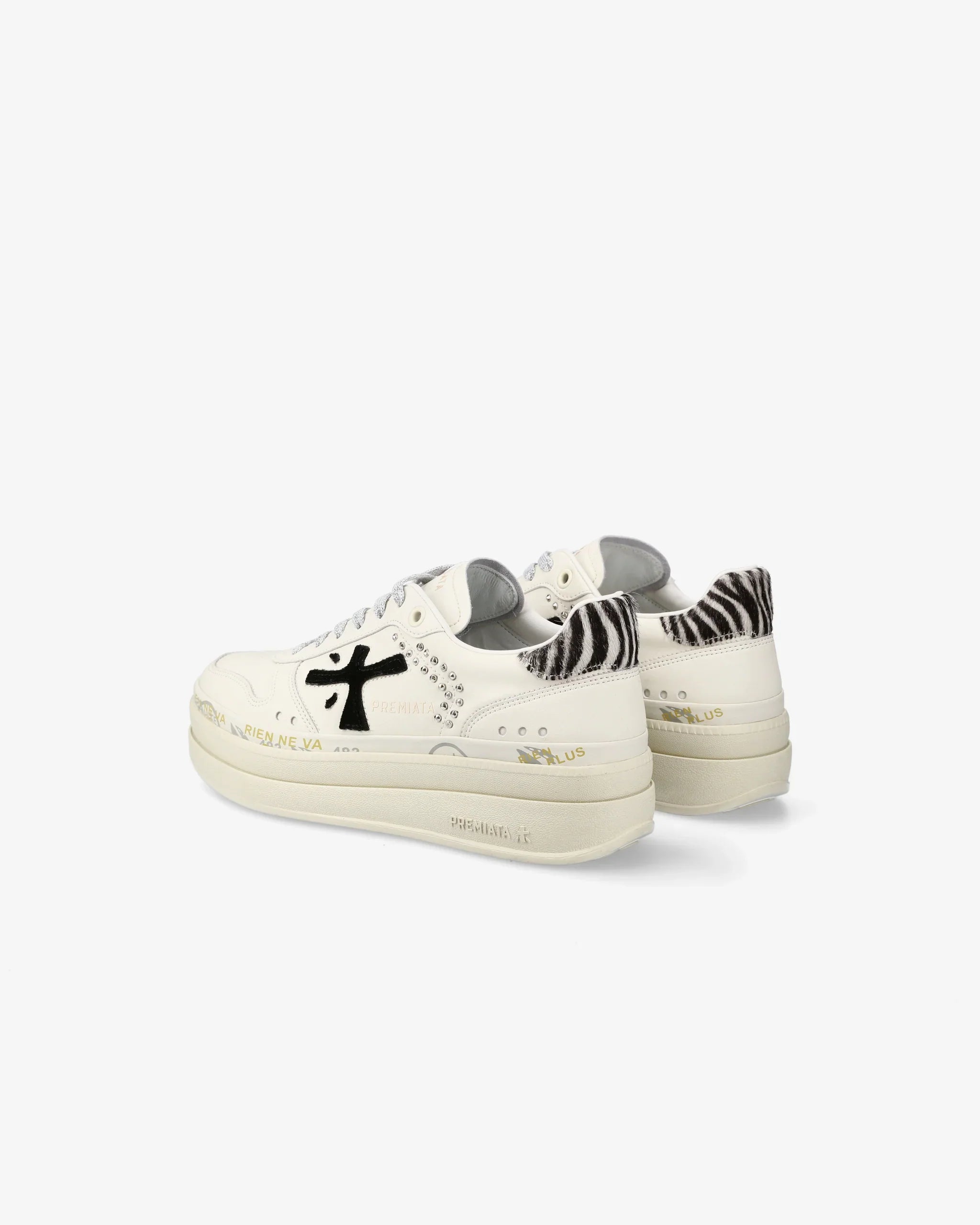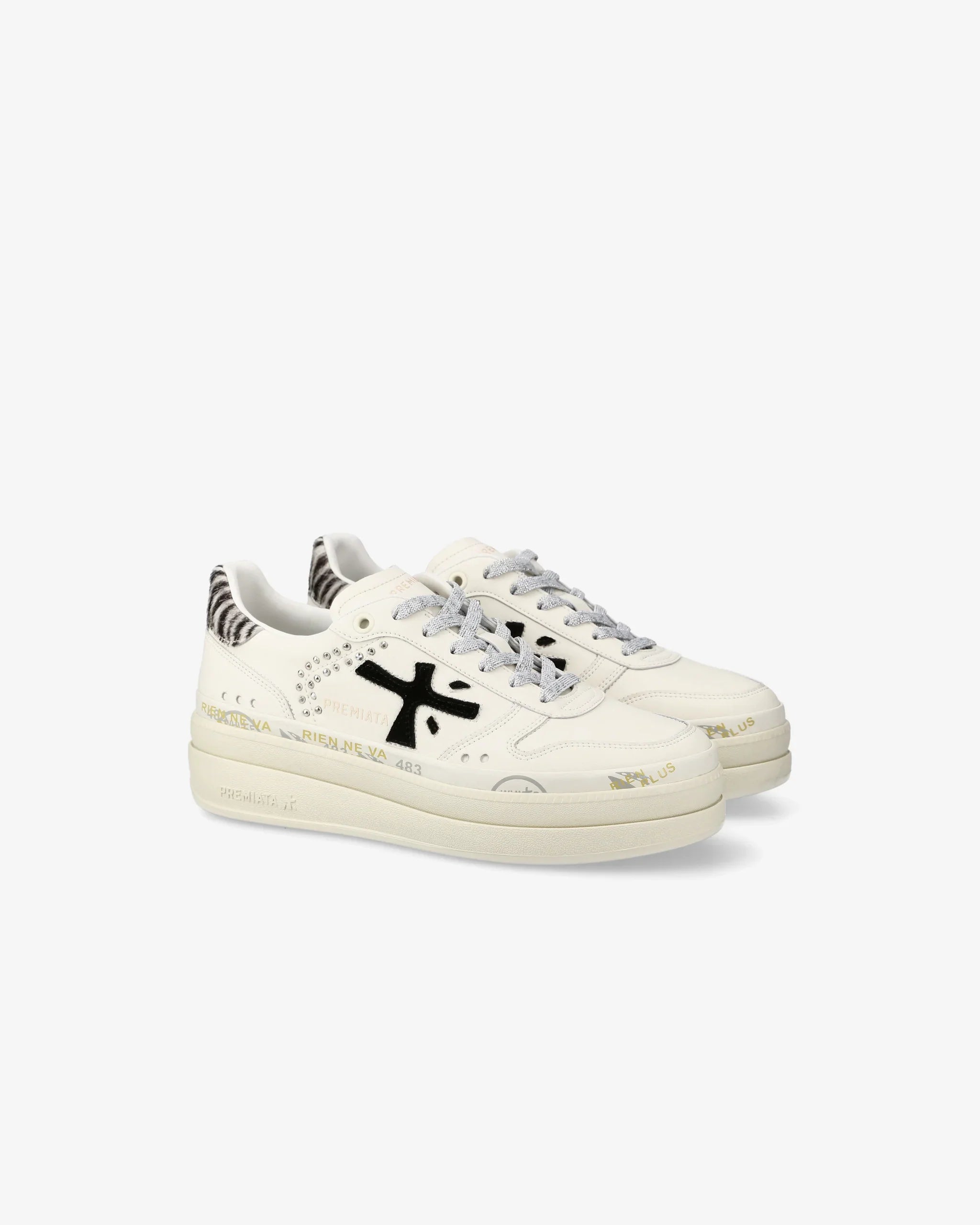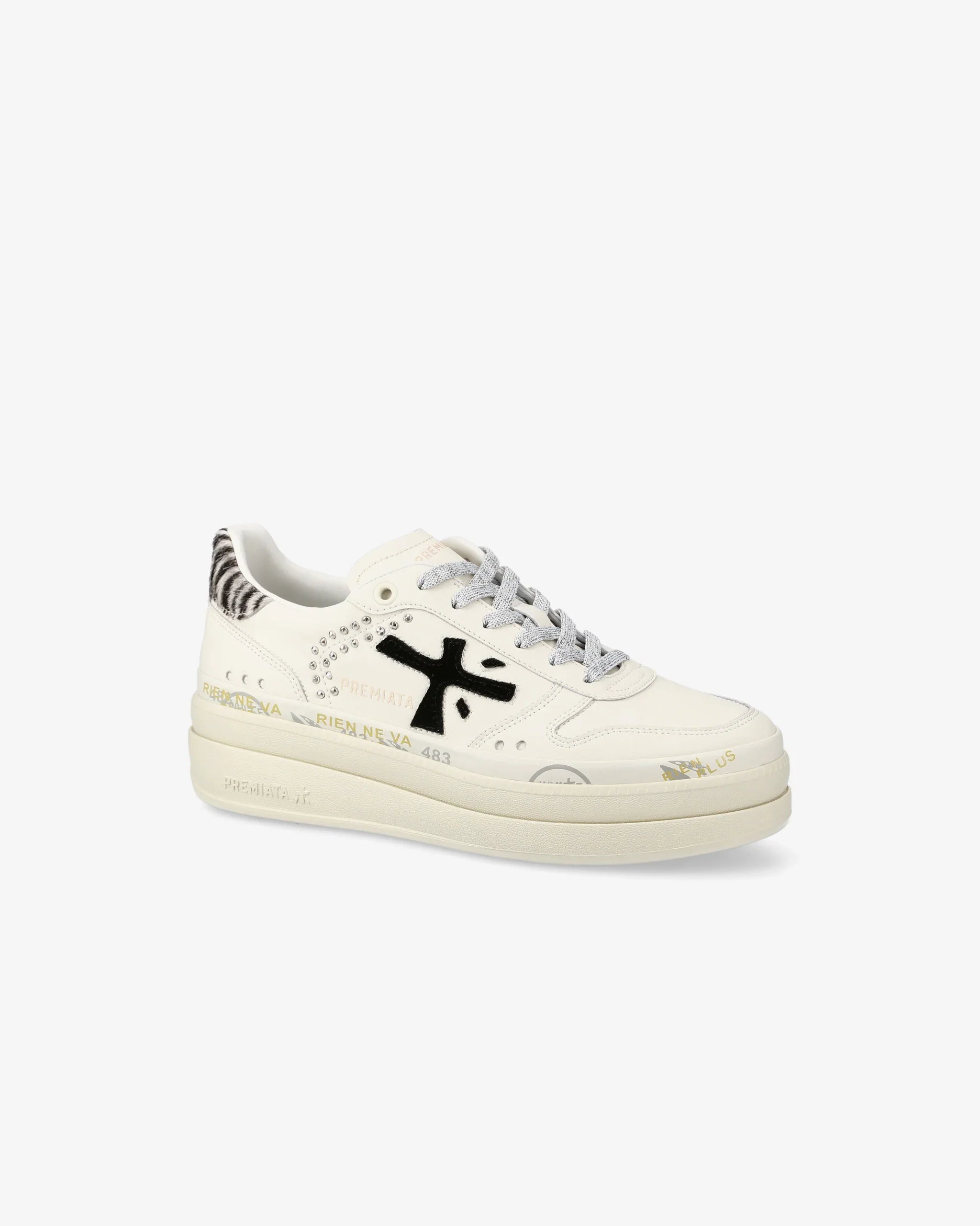 Sneakers MICOL bianca di PREMIATA in pelle con logo in camoscio nero e tallone in zebrato. Fondo in gomma alto 50mm.