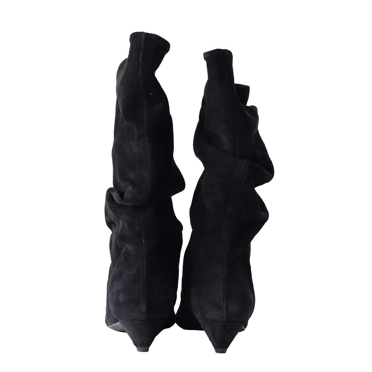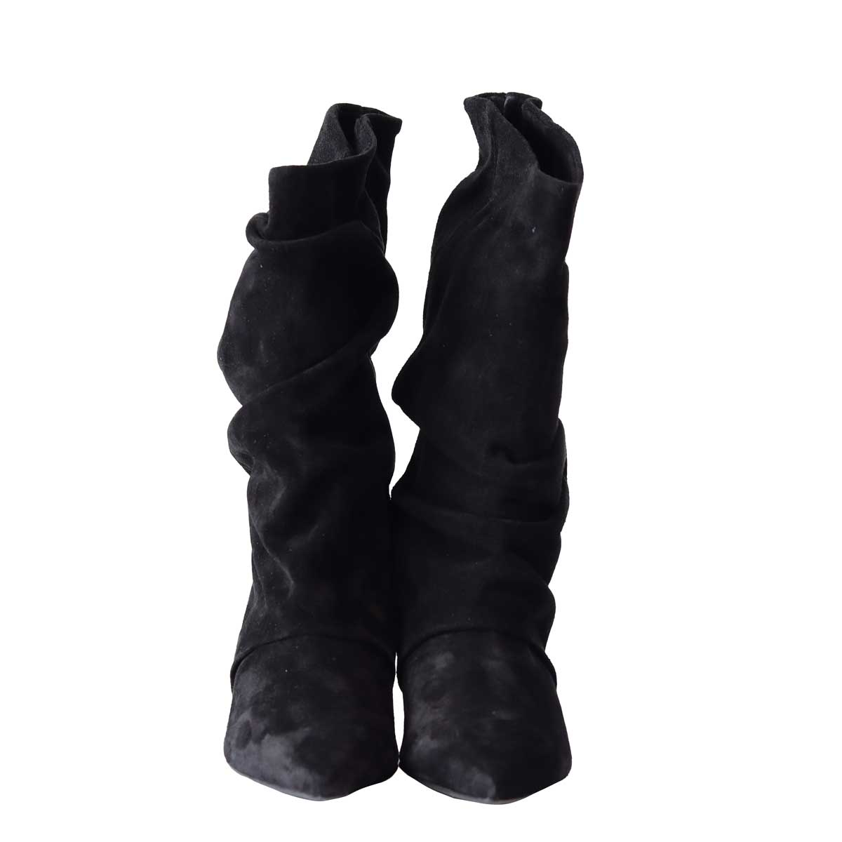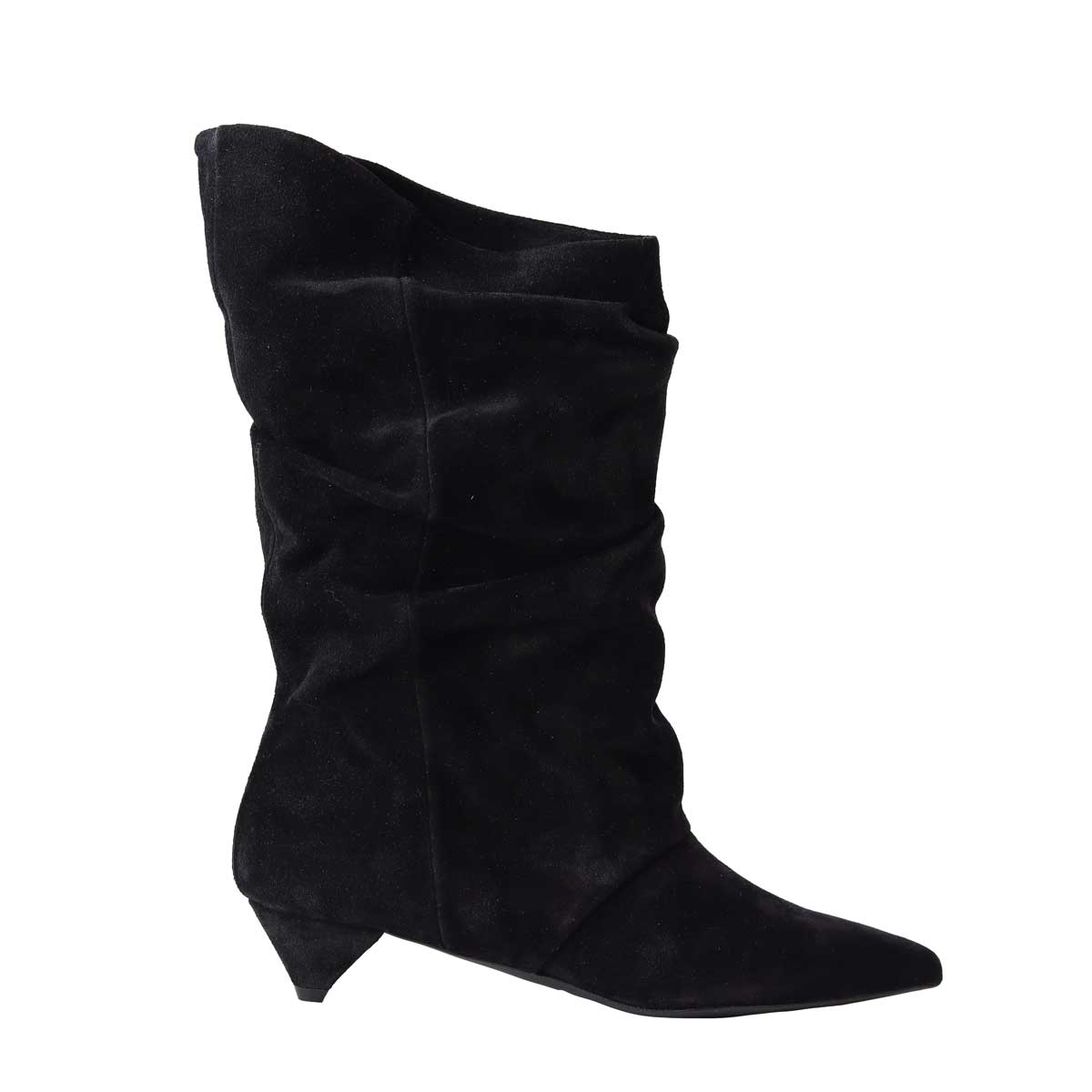 Stivaletto ALEX nero di ALCHIMIA in camoscio con forma a punta, arricciature su tomaia. Tacco 30mm, fondo in gomma.