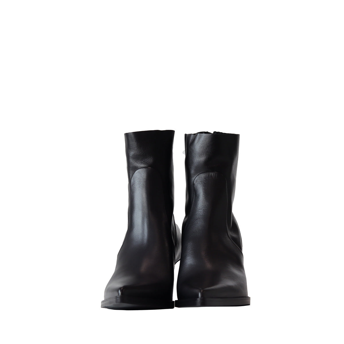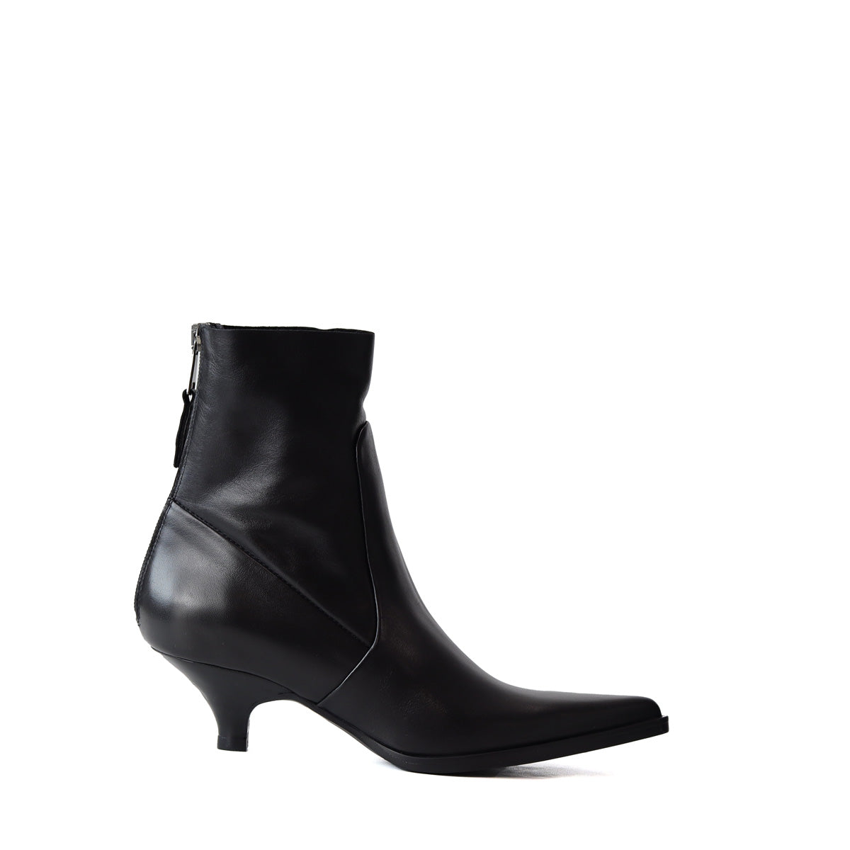 Stivaletto THAIS nero di ELENA IACHI in pelle con zip posteriore, tomaia superiore con taglio vivo e forma appuntita, tacco a rocchetta in cuoio 50mm e fondo in gomma.