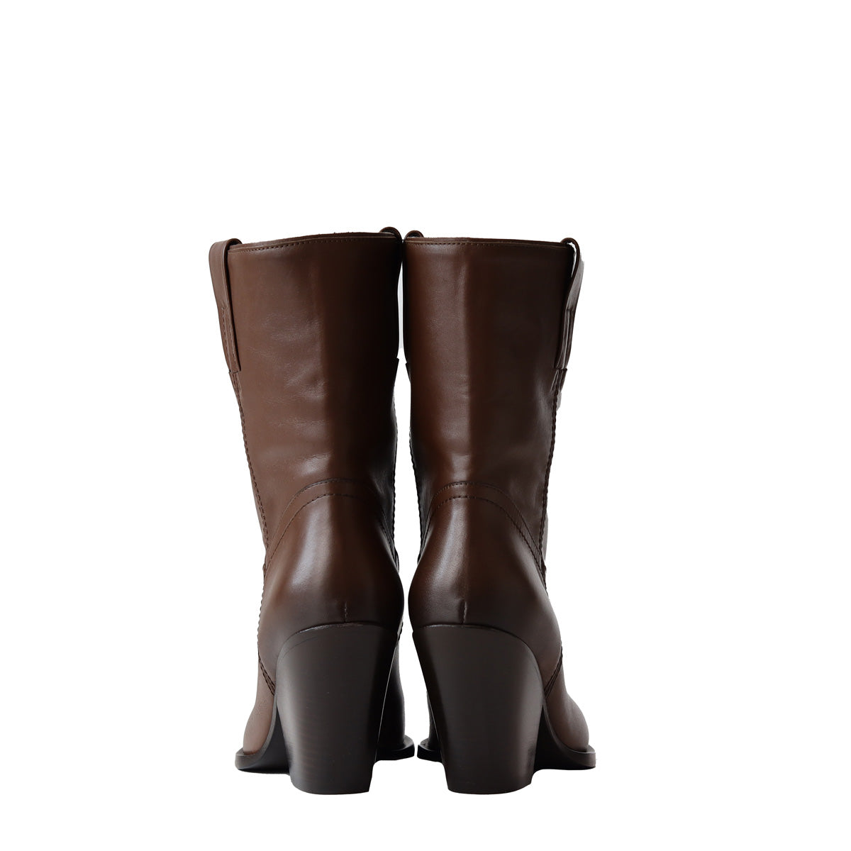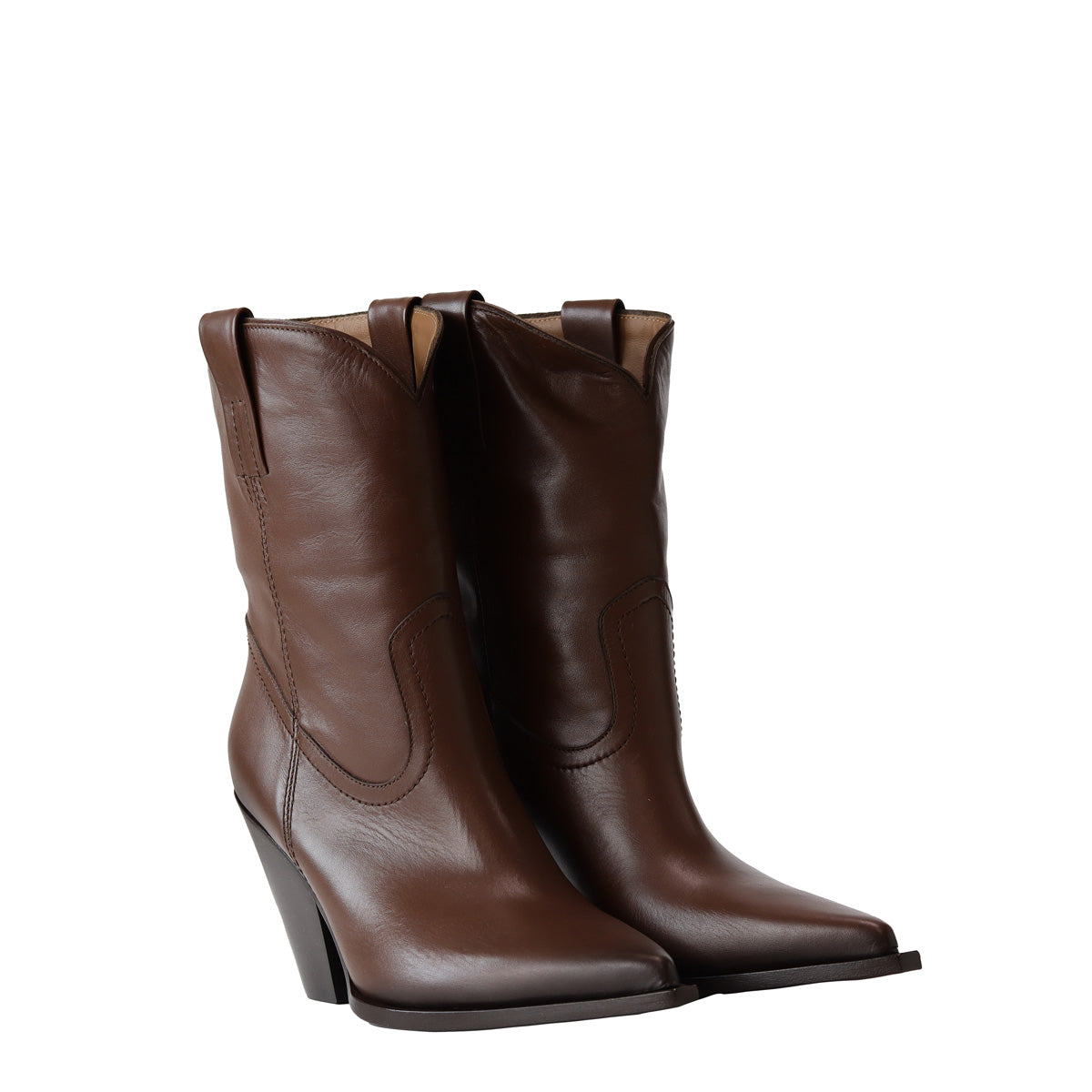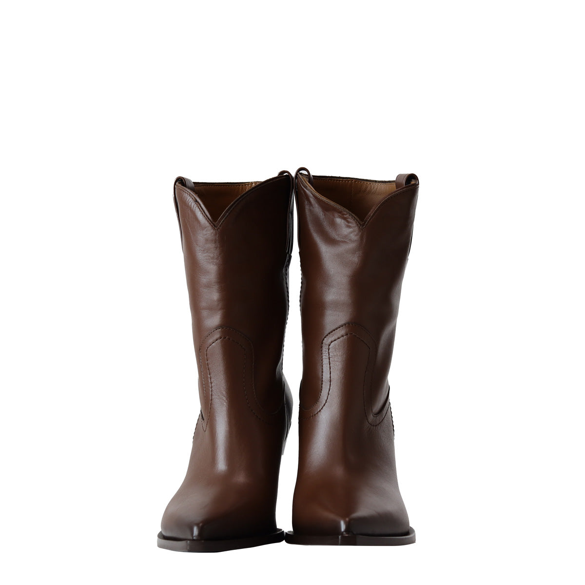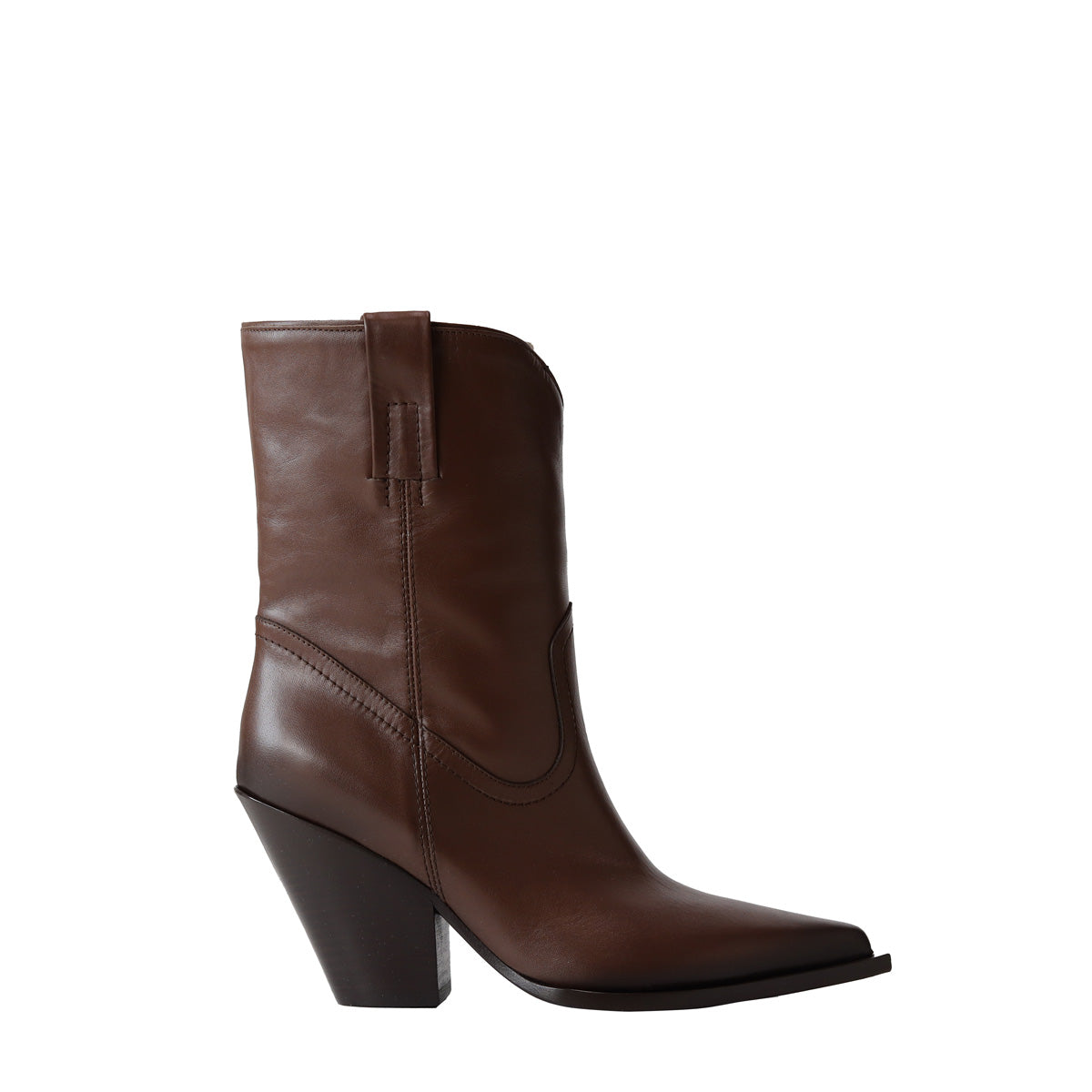 Texano PEGGY marrone di ELENA IACHI in pelle con tomaia con cuciture in tinta e tacco 80mm. Fondo in cuoio con mezza gomma iniettata.