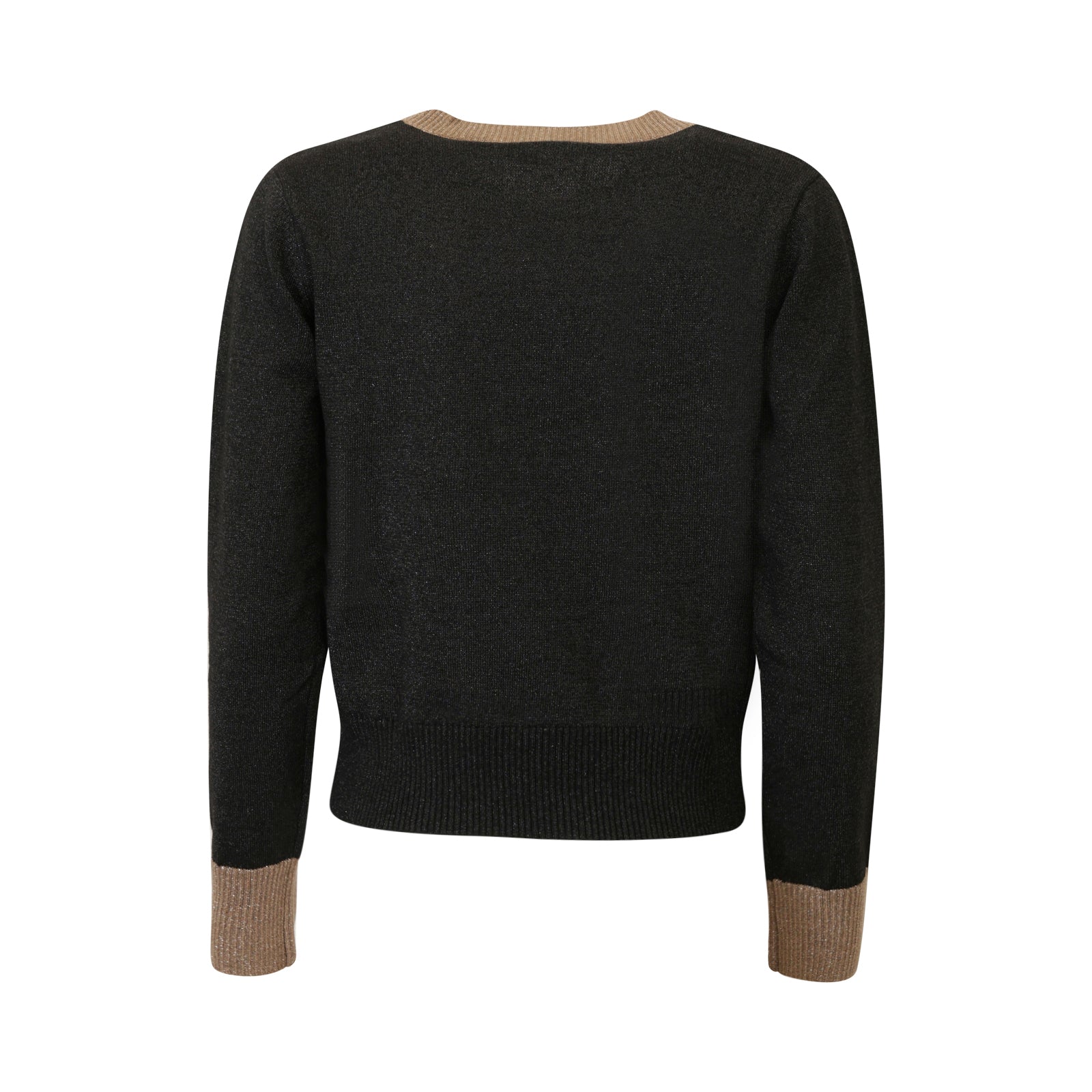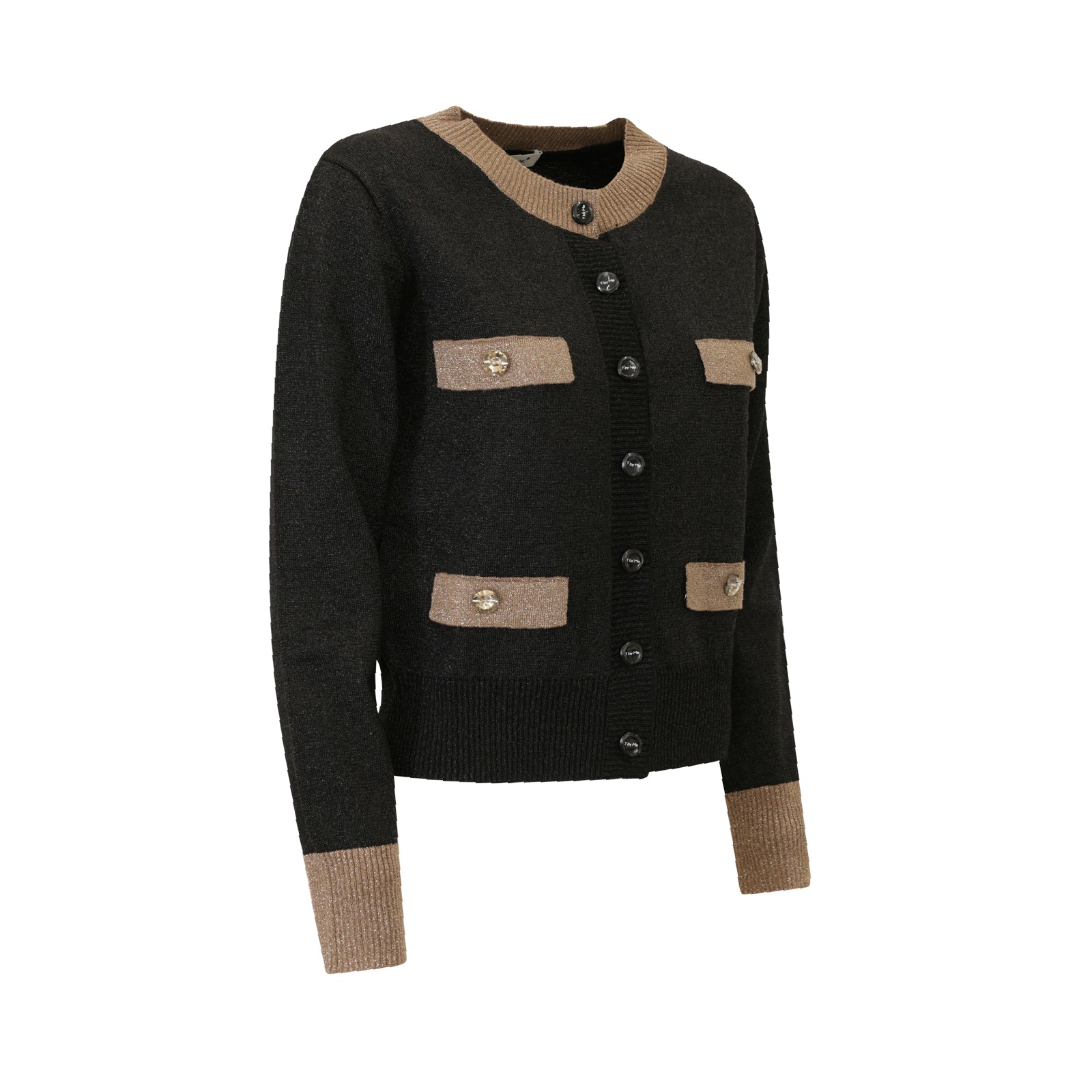 Cardigan nero di T by ME in misto lana con effetto lurex, bordi e patta a in beige con manici e collo a costine.